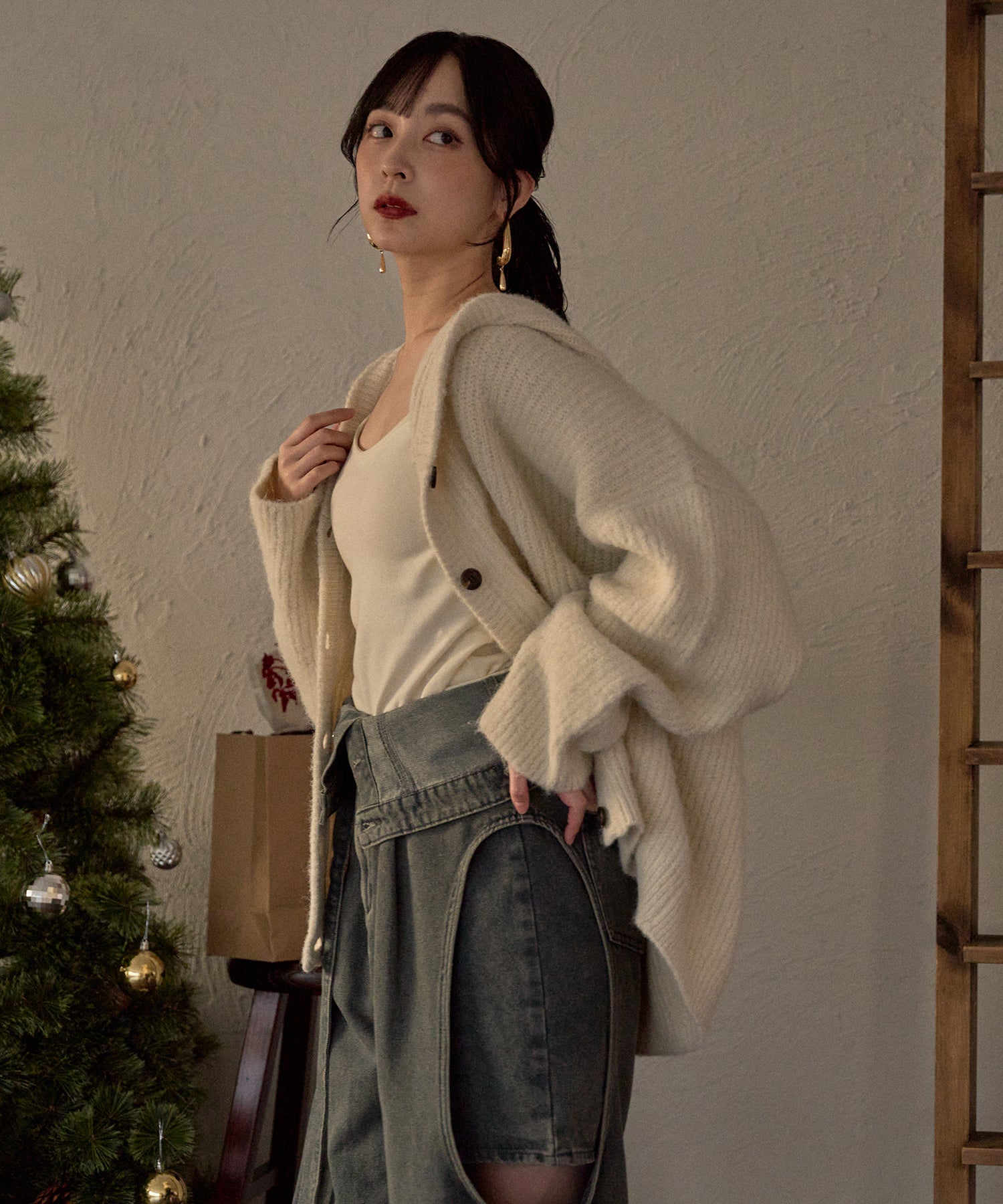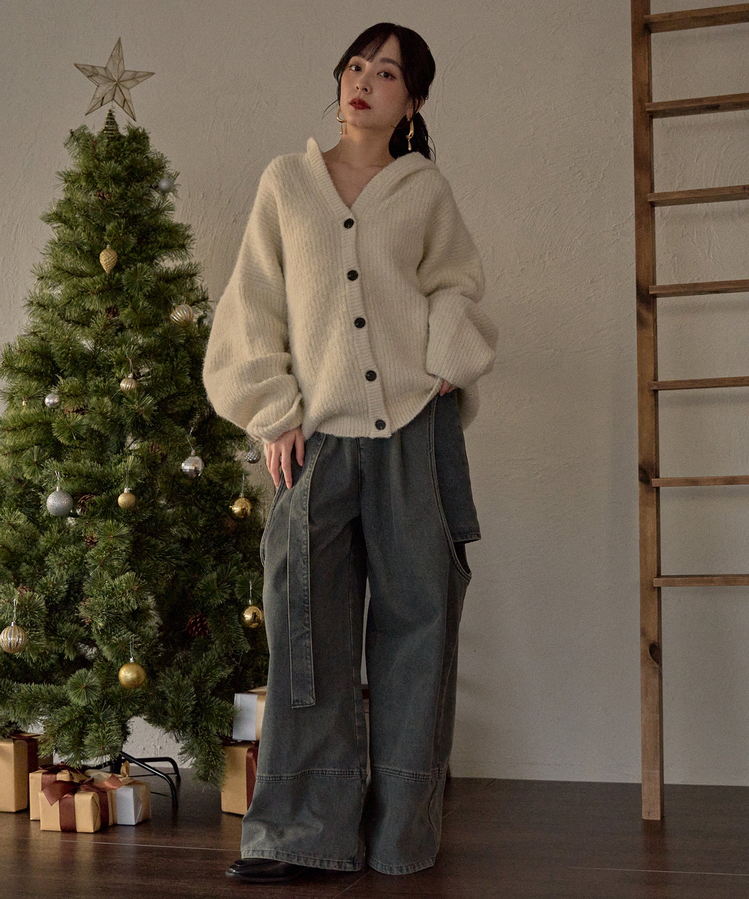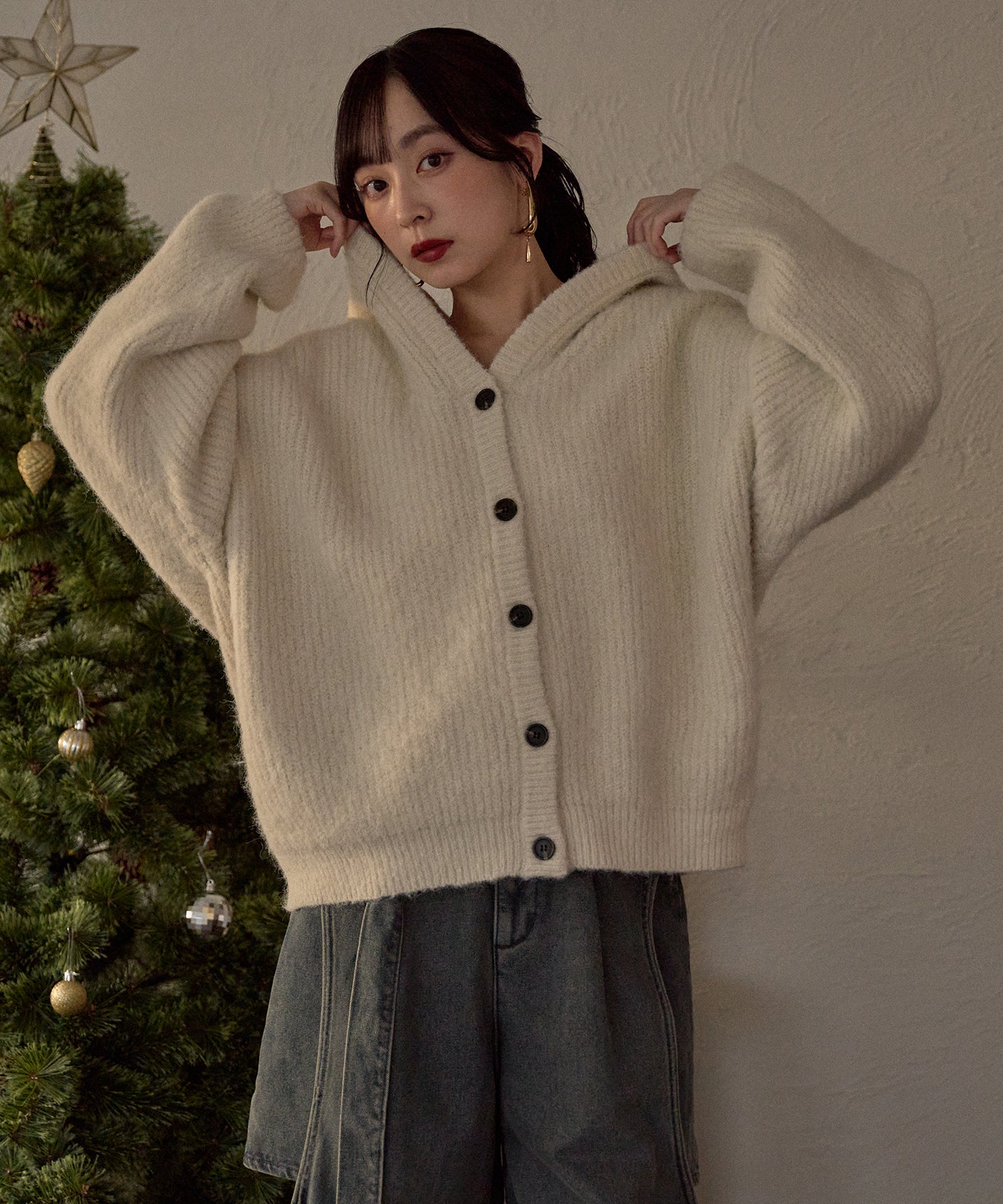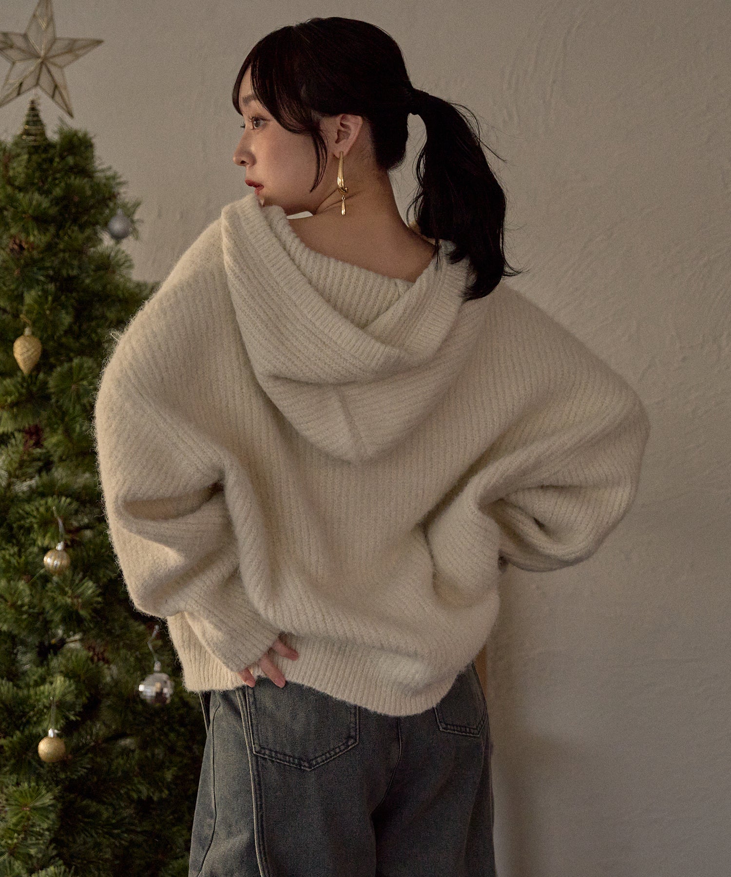 抜け感のあるカジュアルレディなニットパーカー。