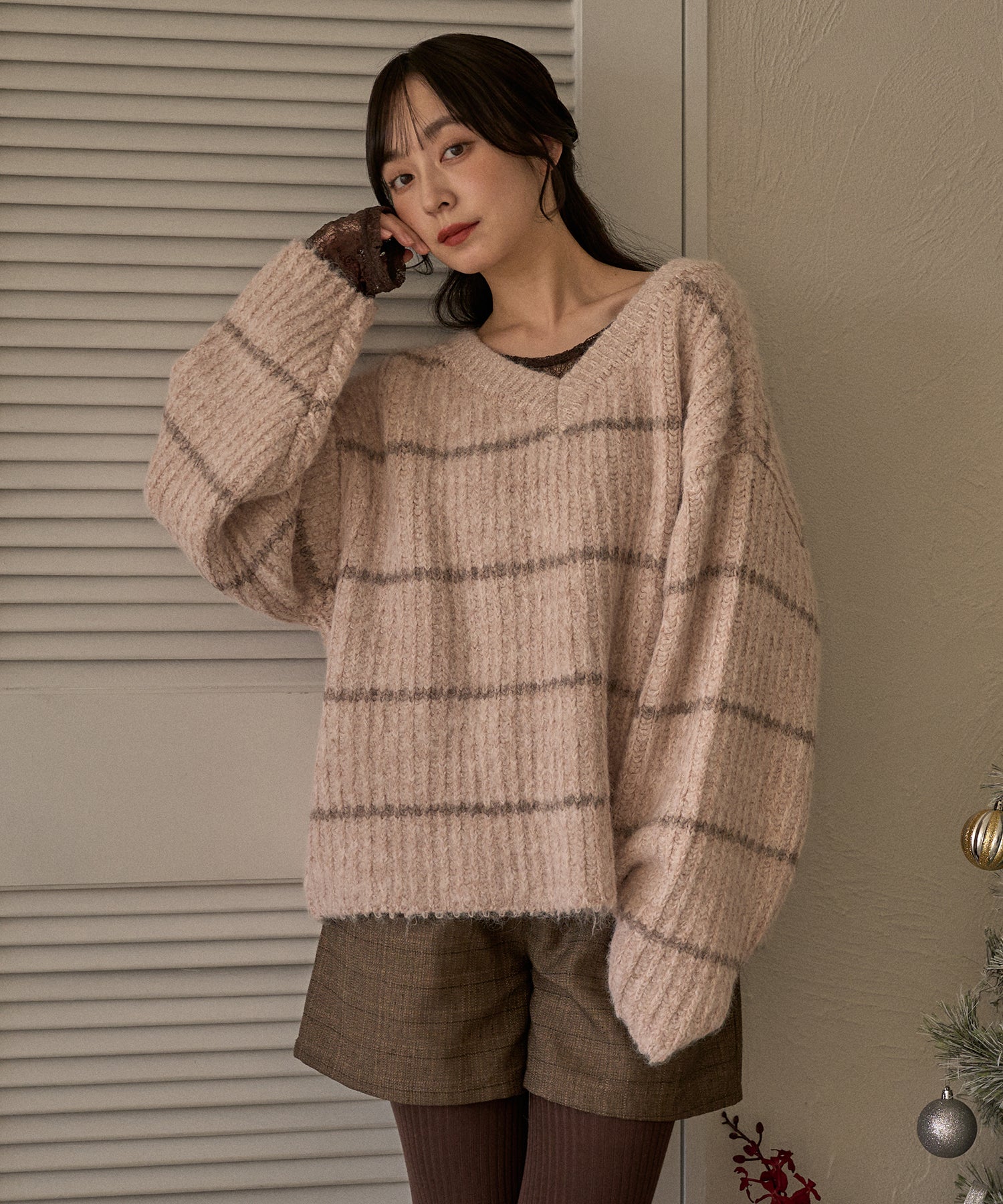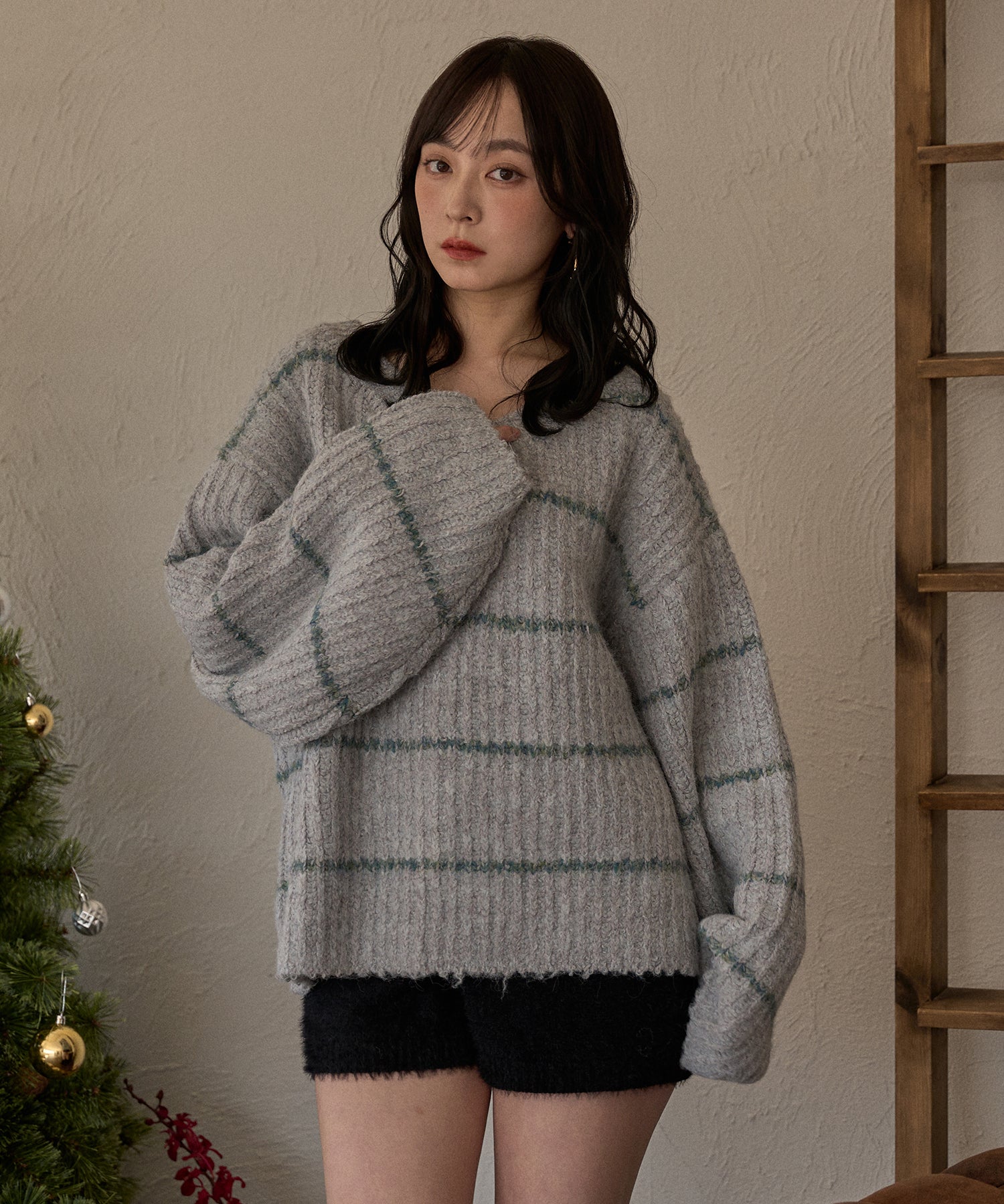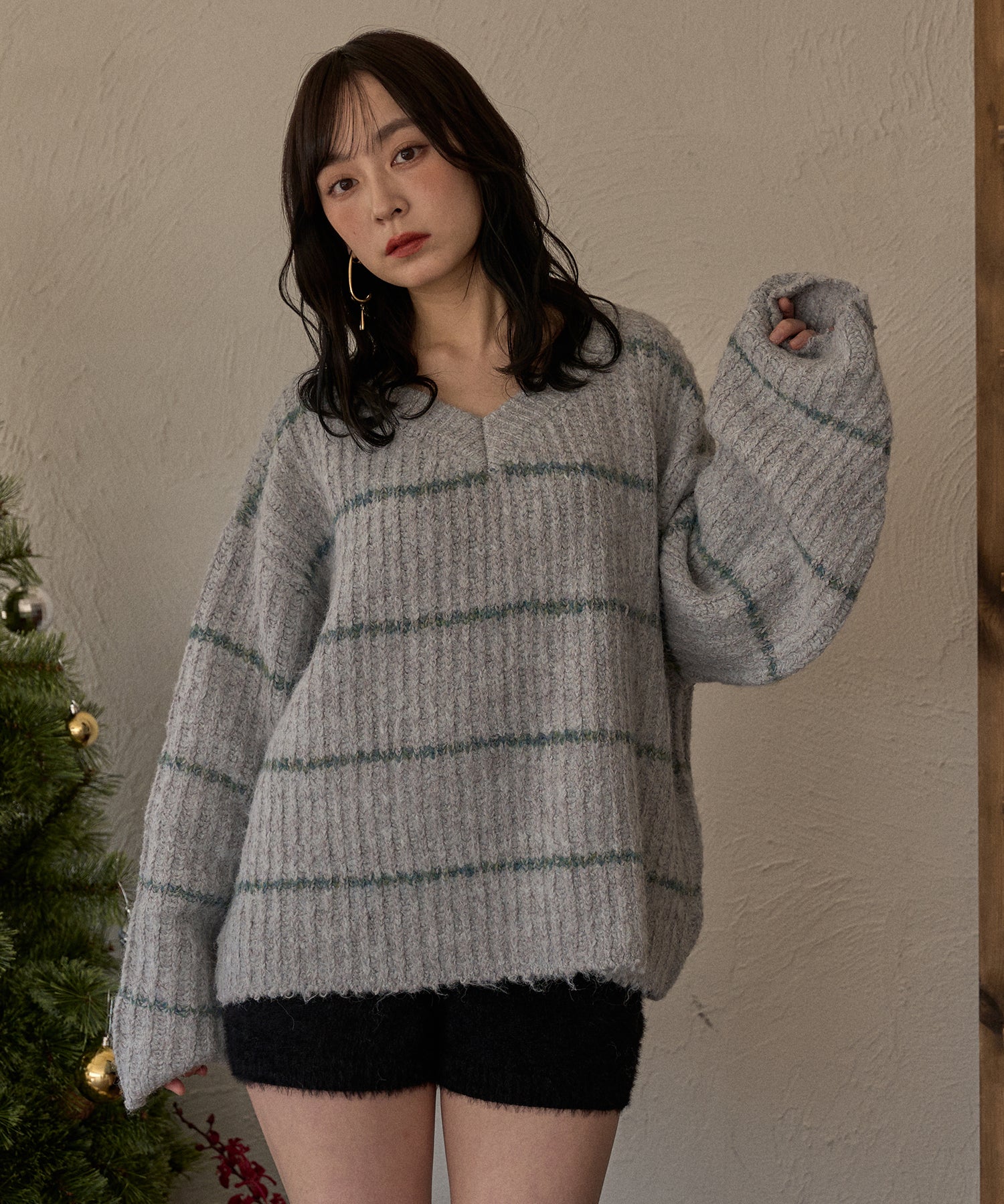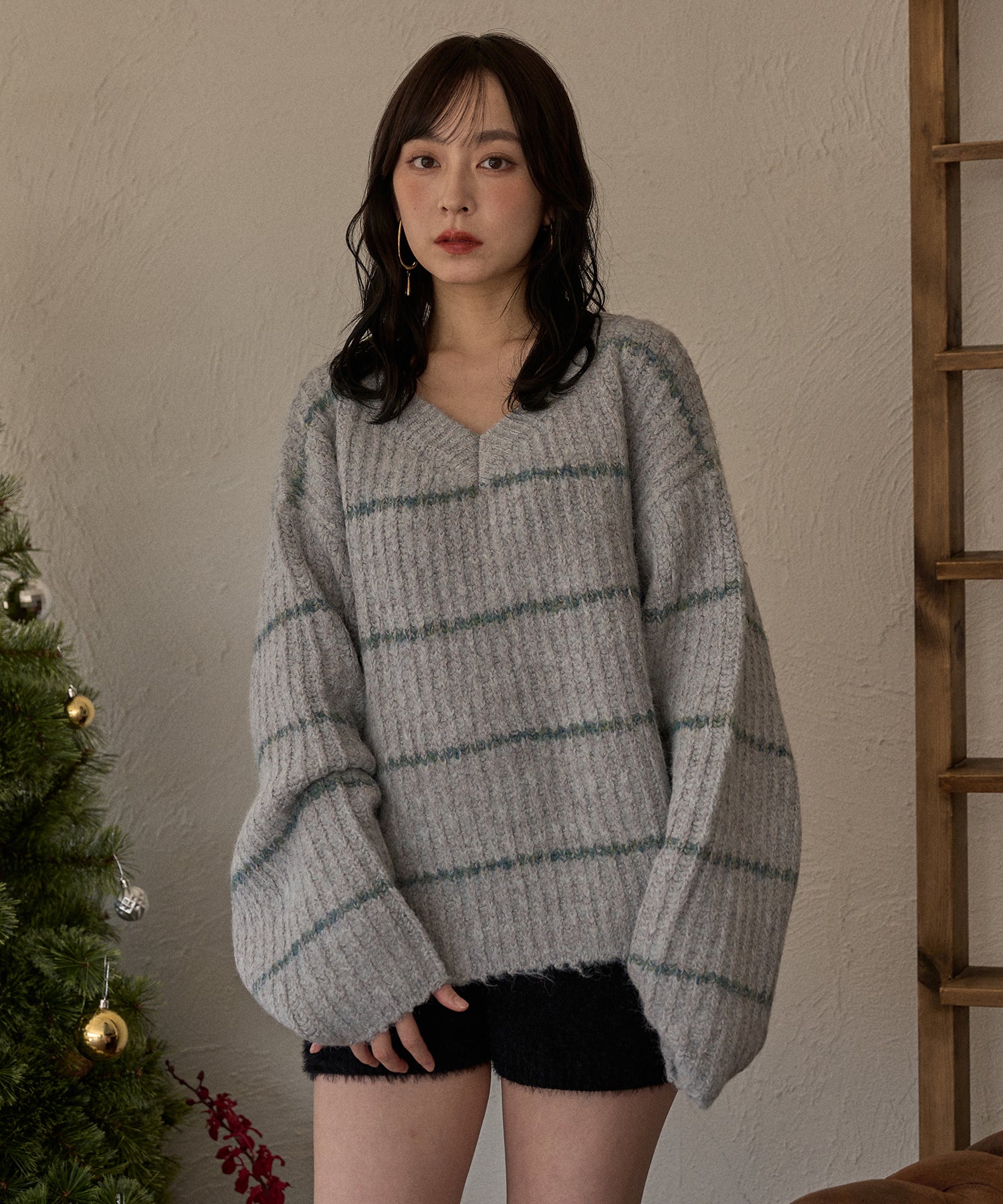 甘さのあるカジュアルなボーダー柄のVネックニット。