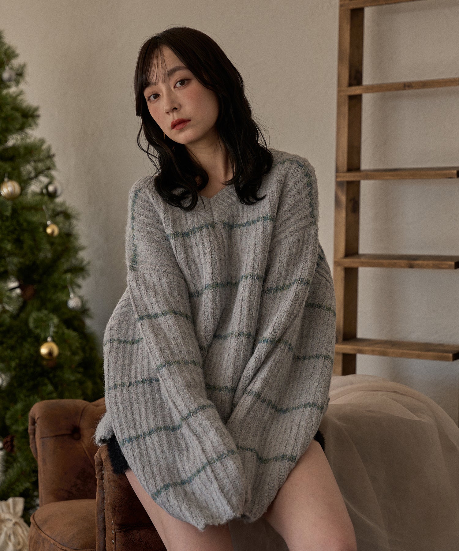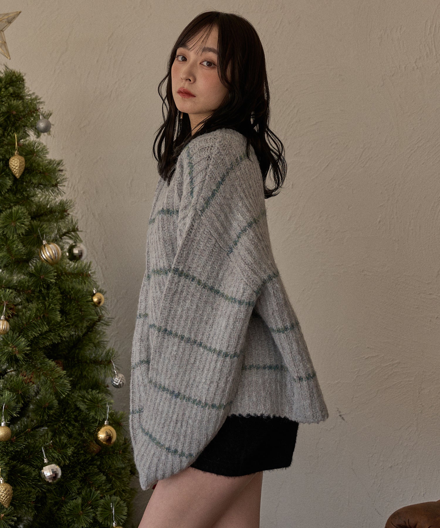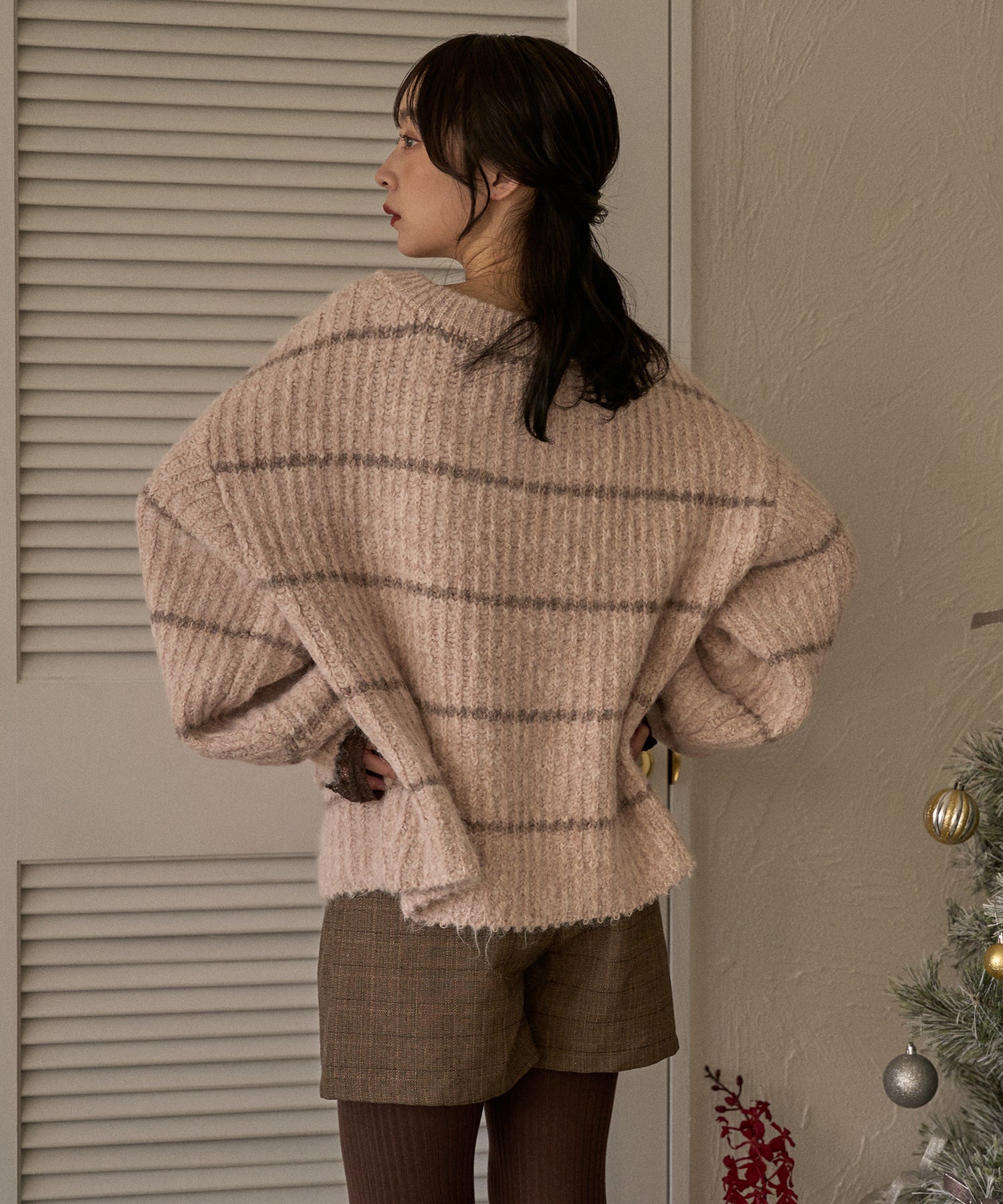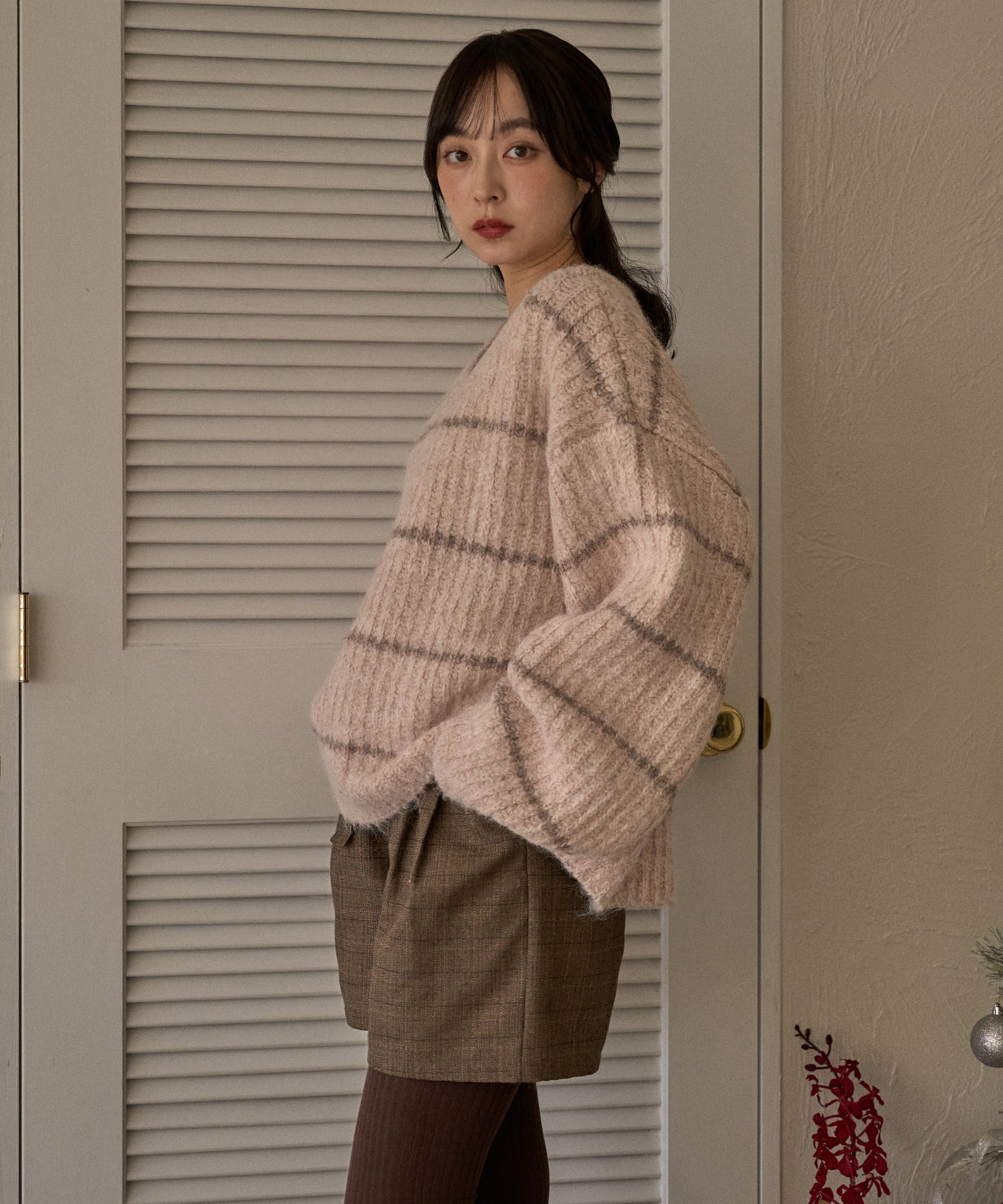 甘さのあるカジュアルなボーダー柄のVネックニット。