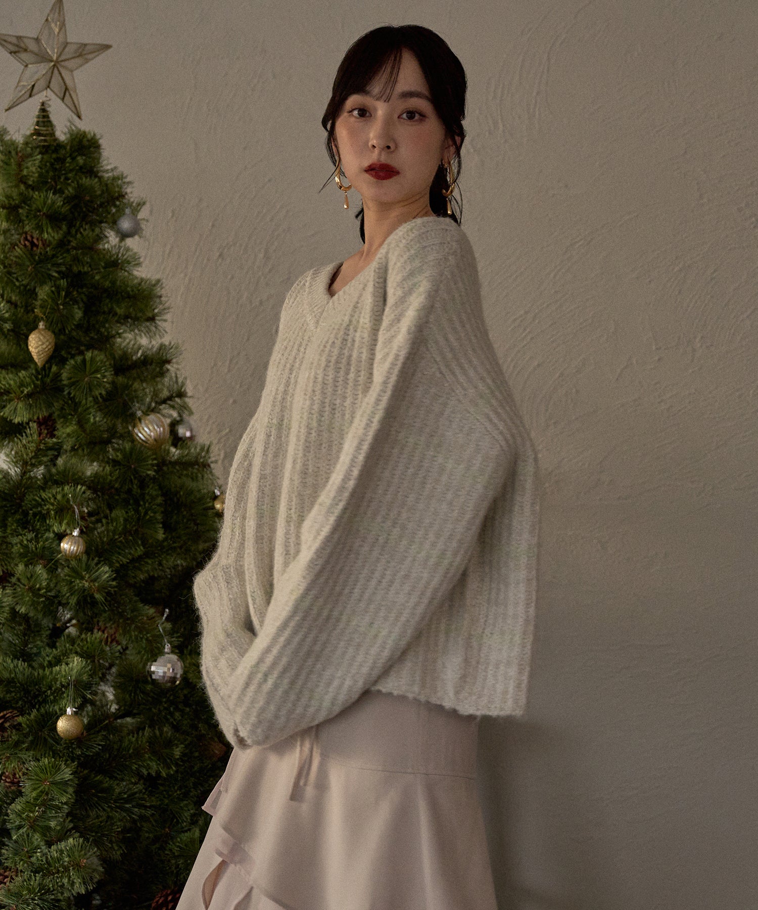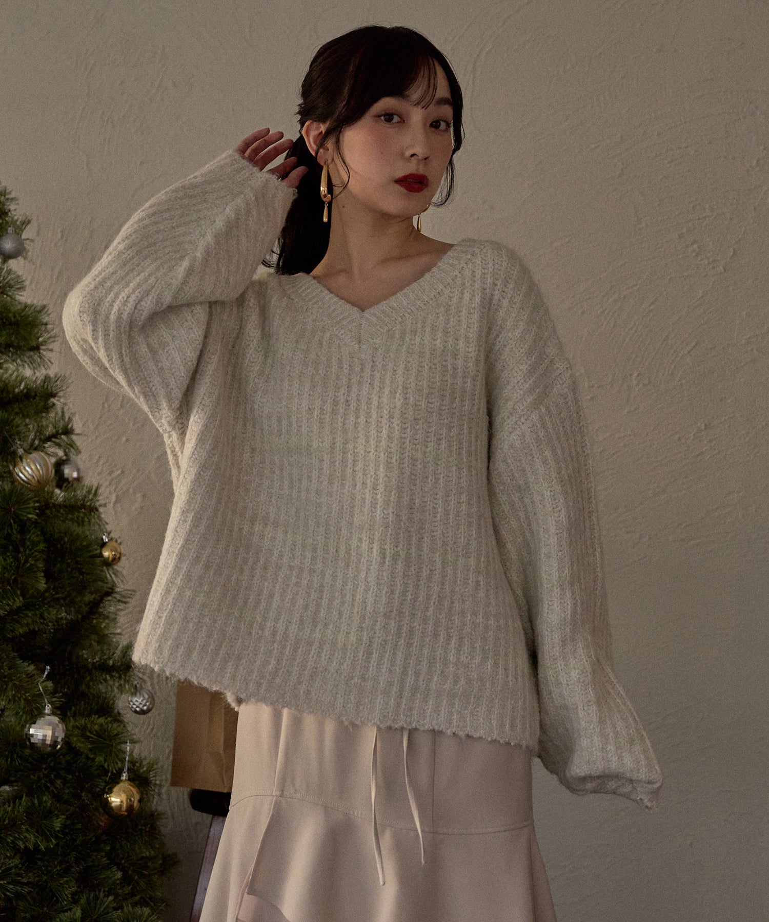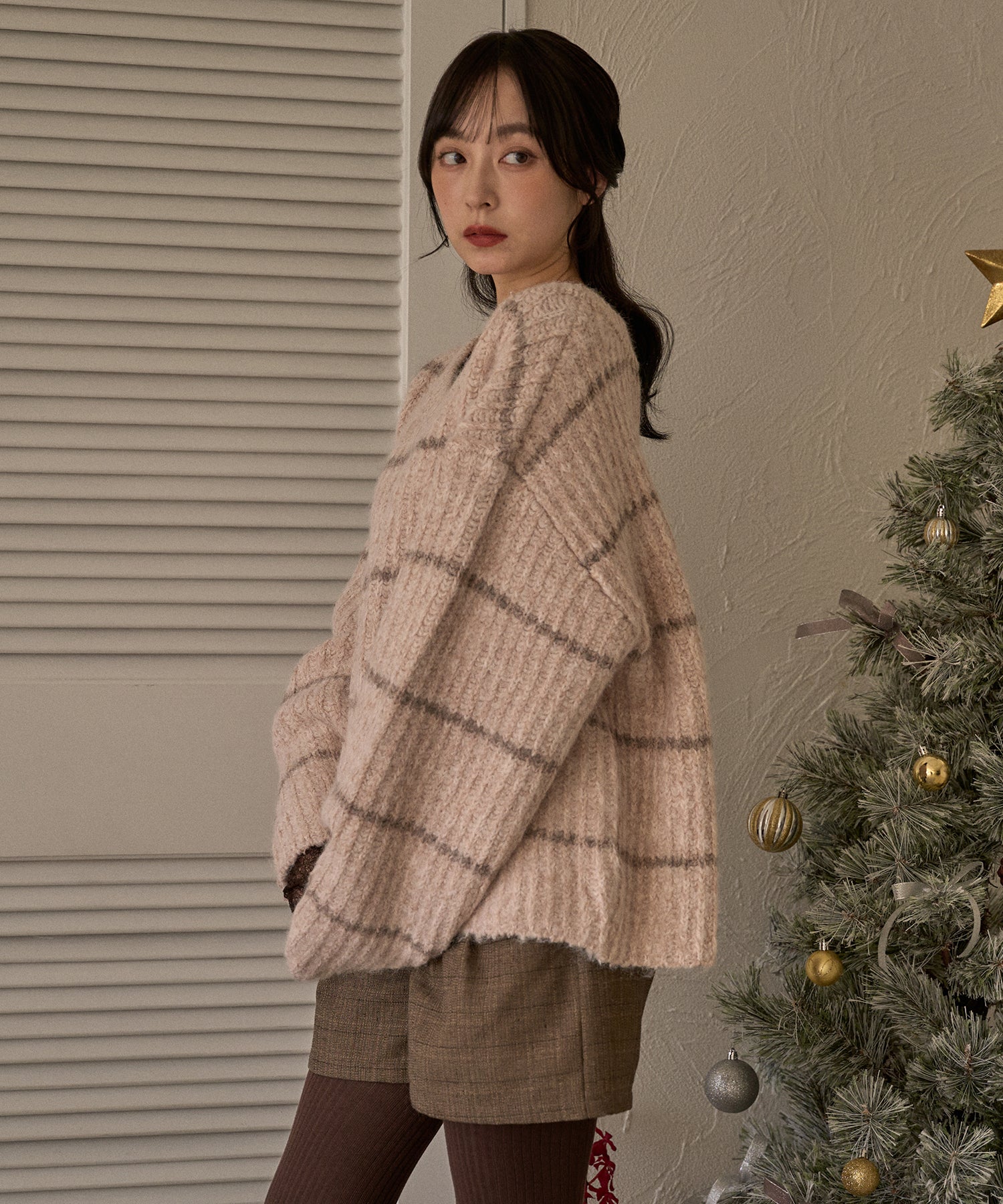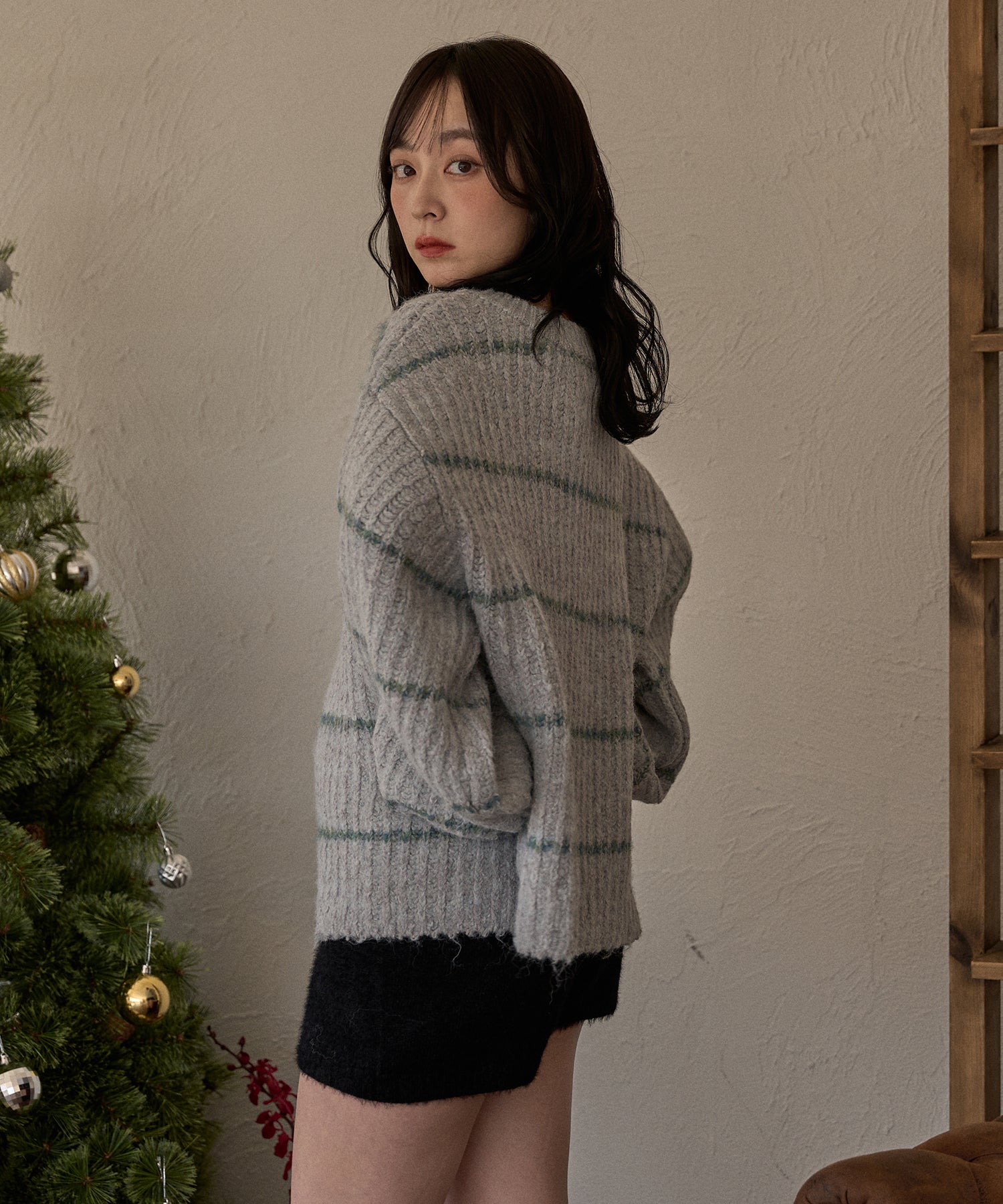 甘さのあるカジュアルなボーダー柄のVネックニット。