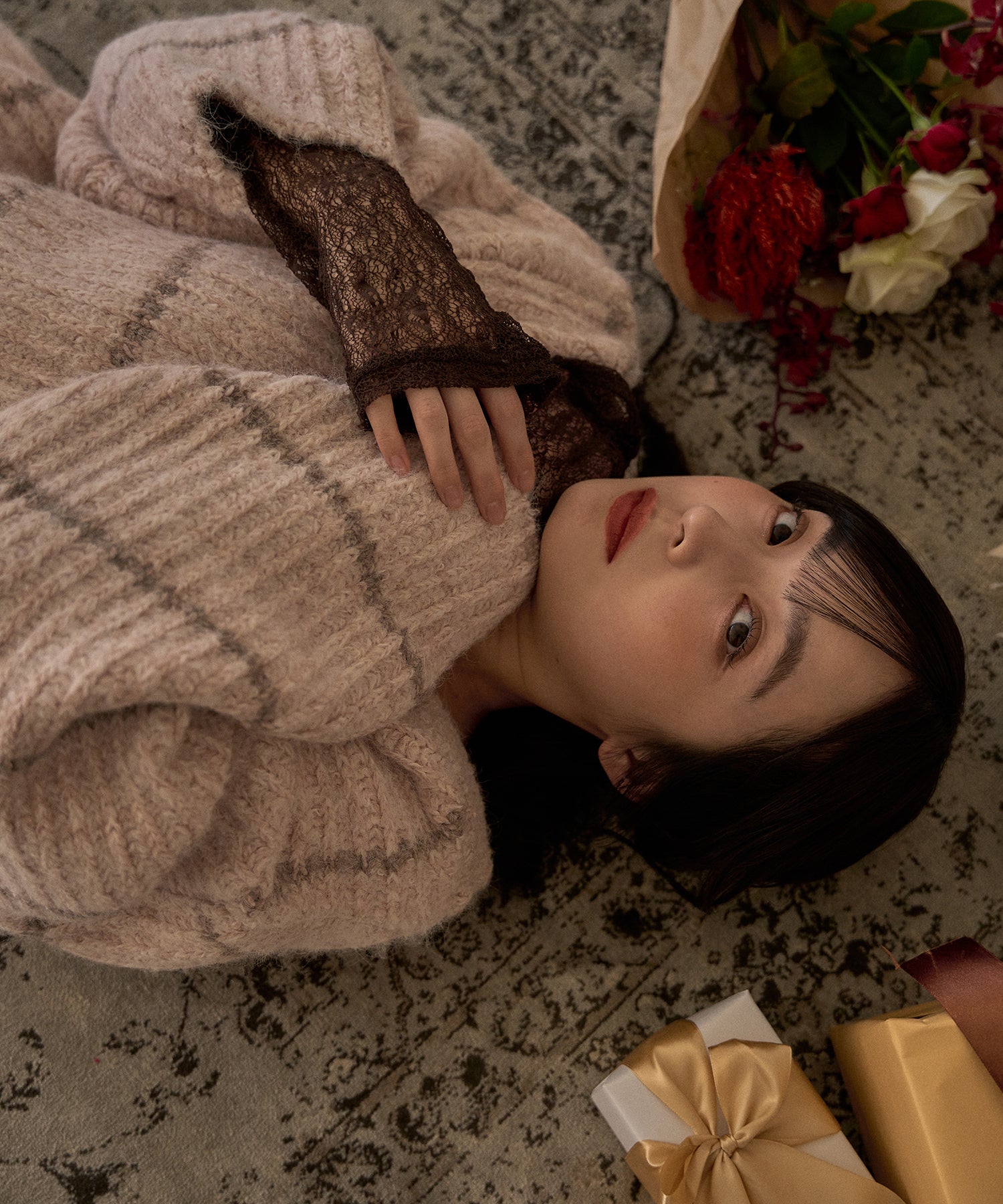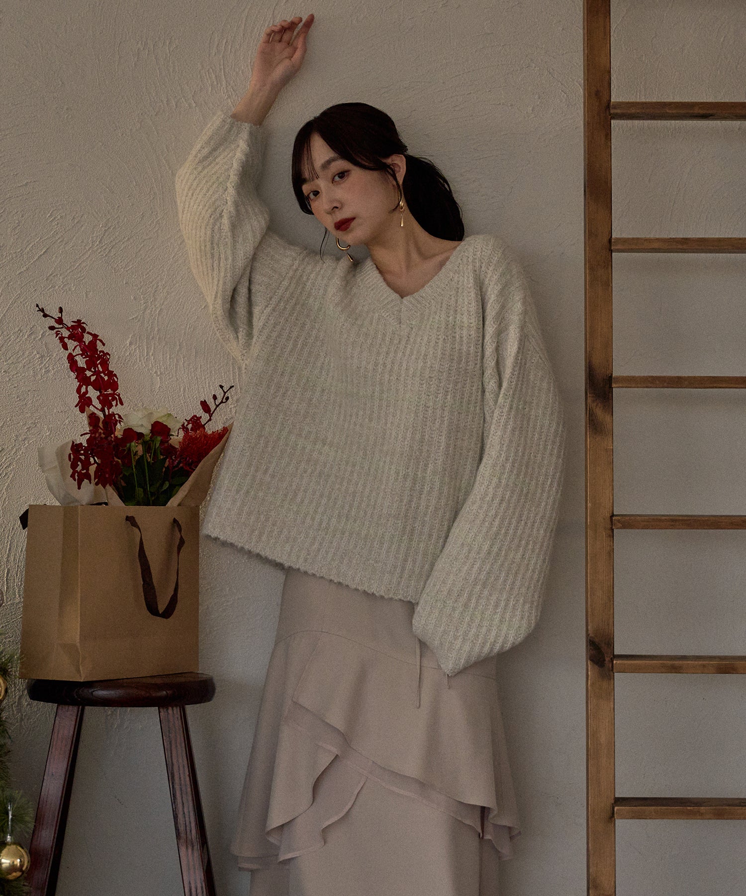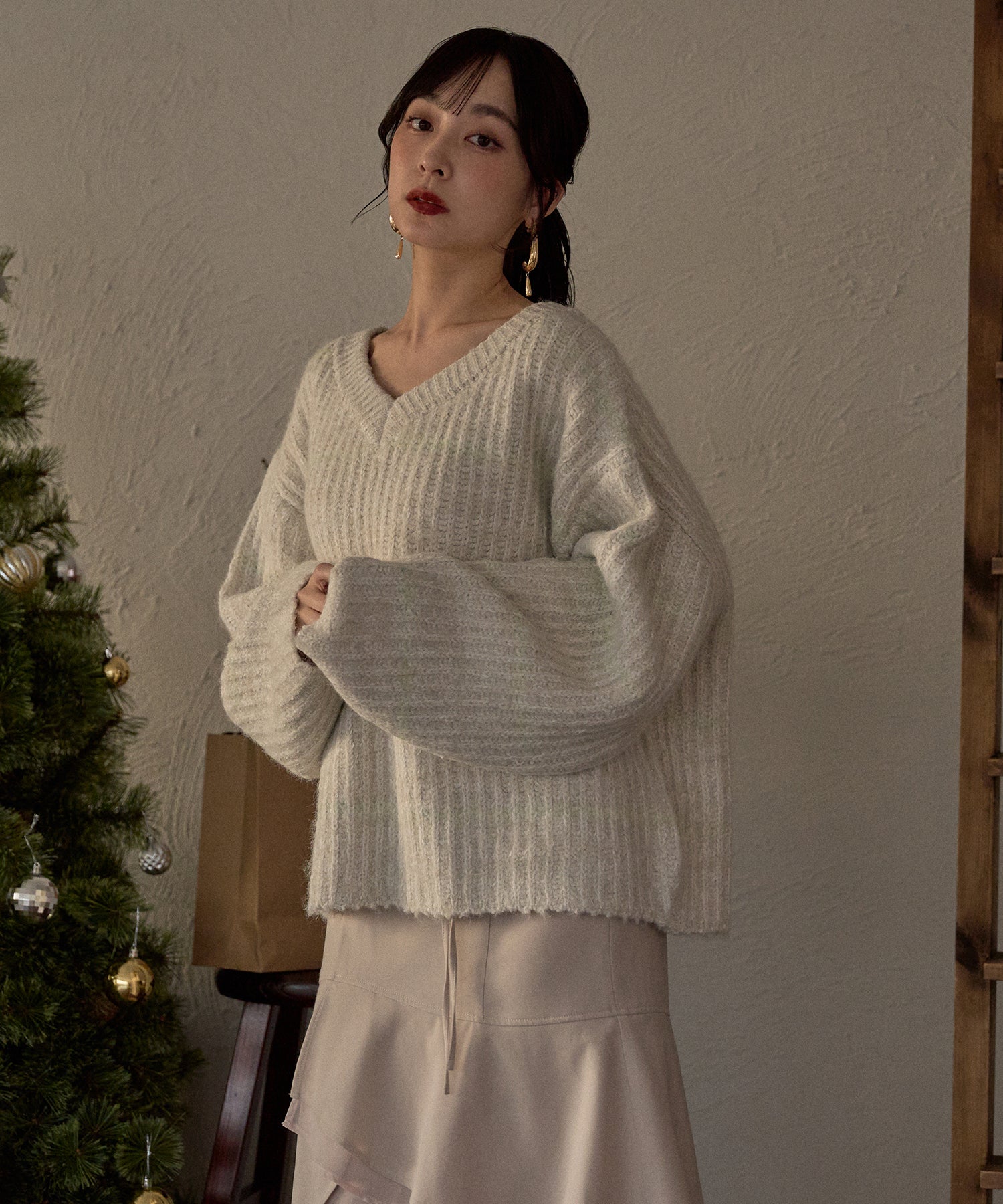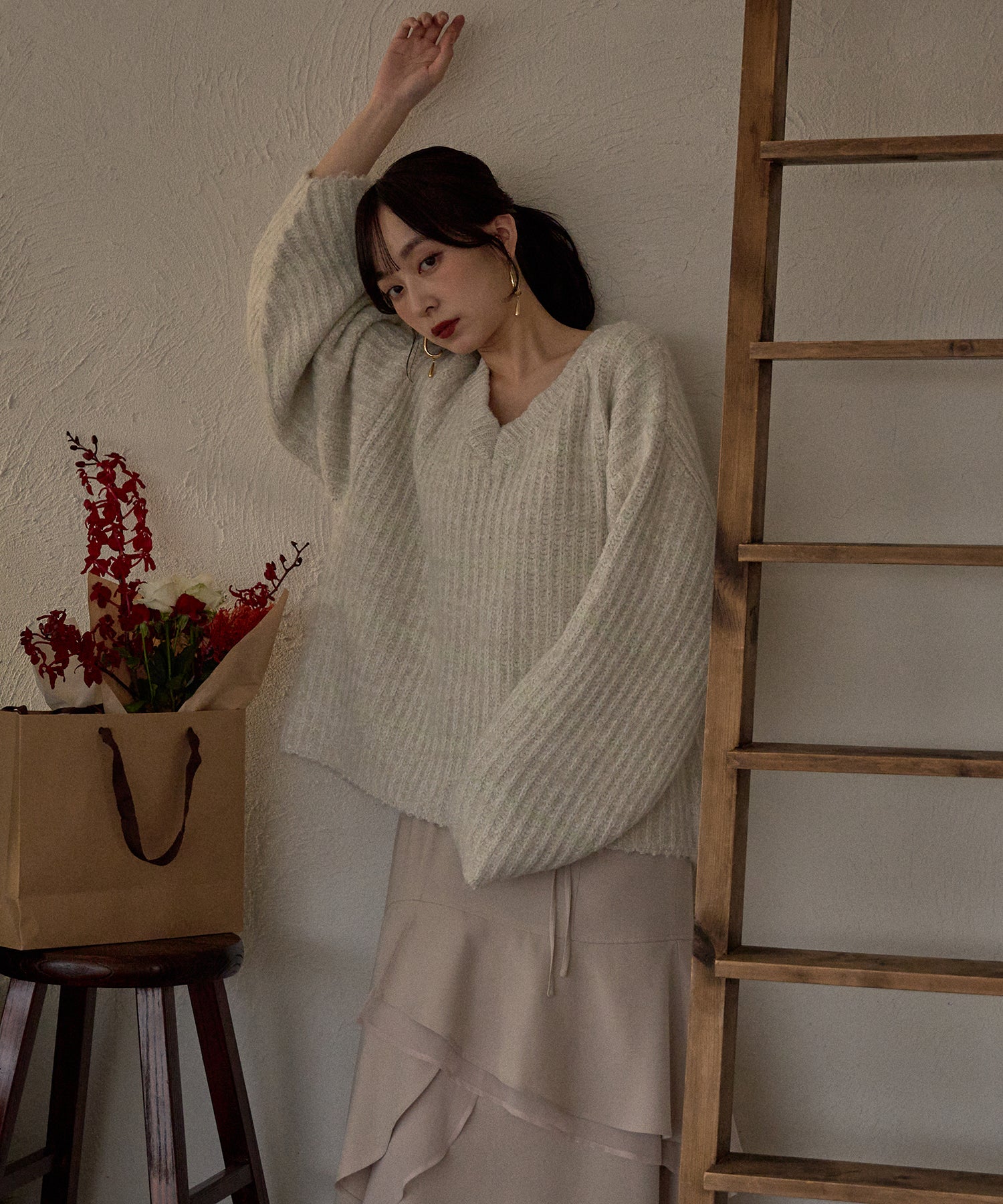 甘さのあるカジュアルなボーダー柄のVネックニット。