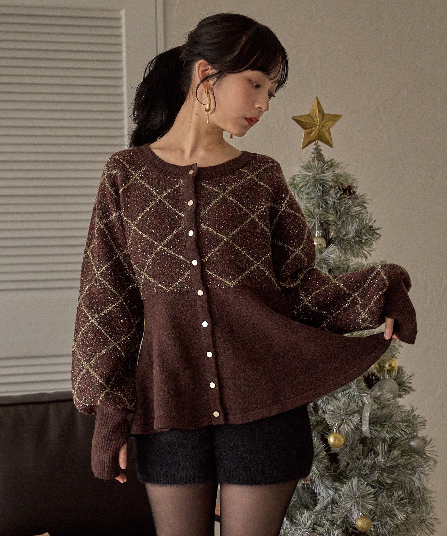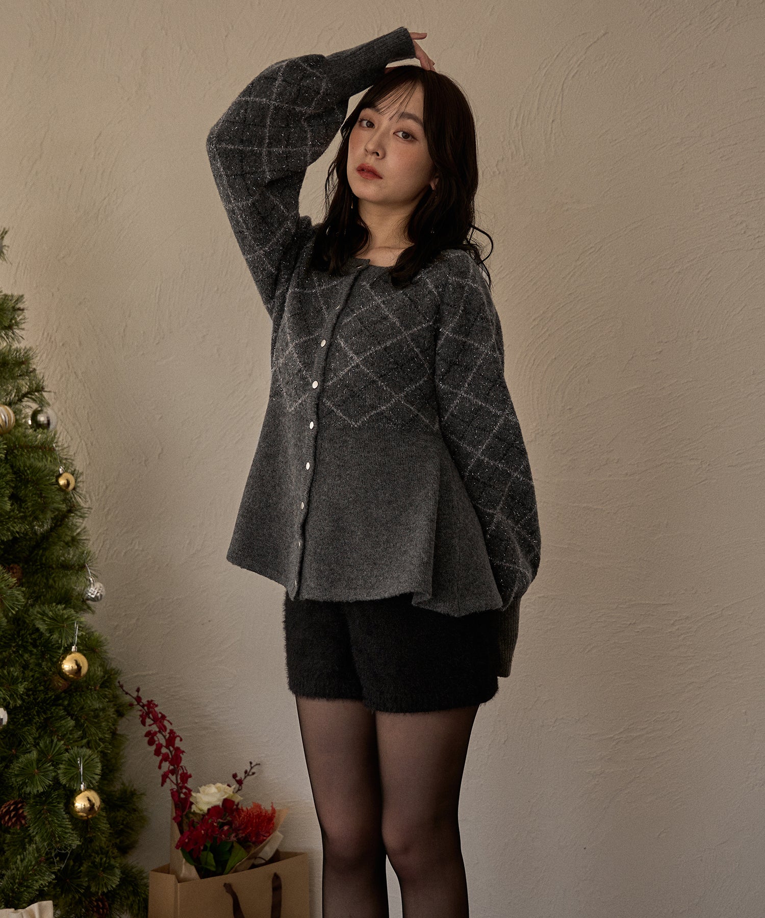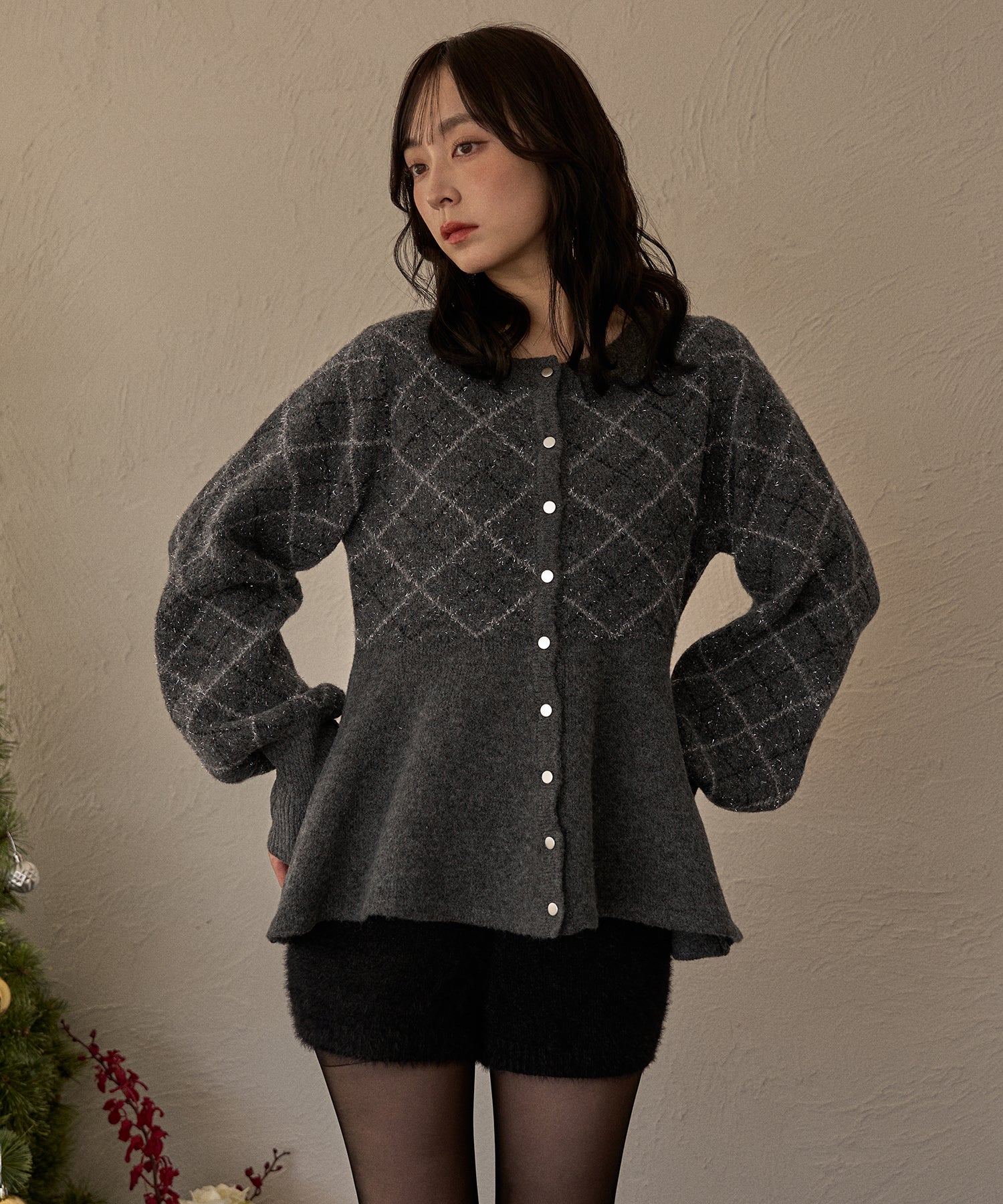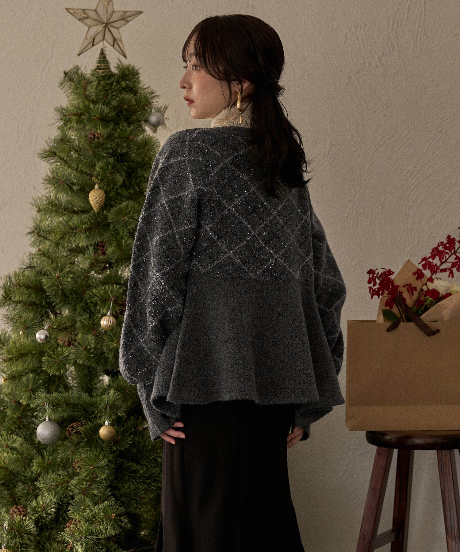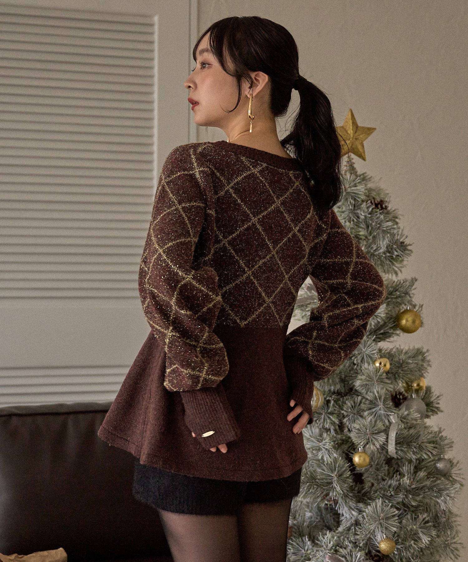 ラメ素材のラインが入ったアーガイル柄のペプラムニット。