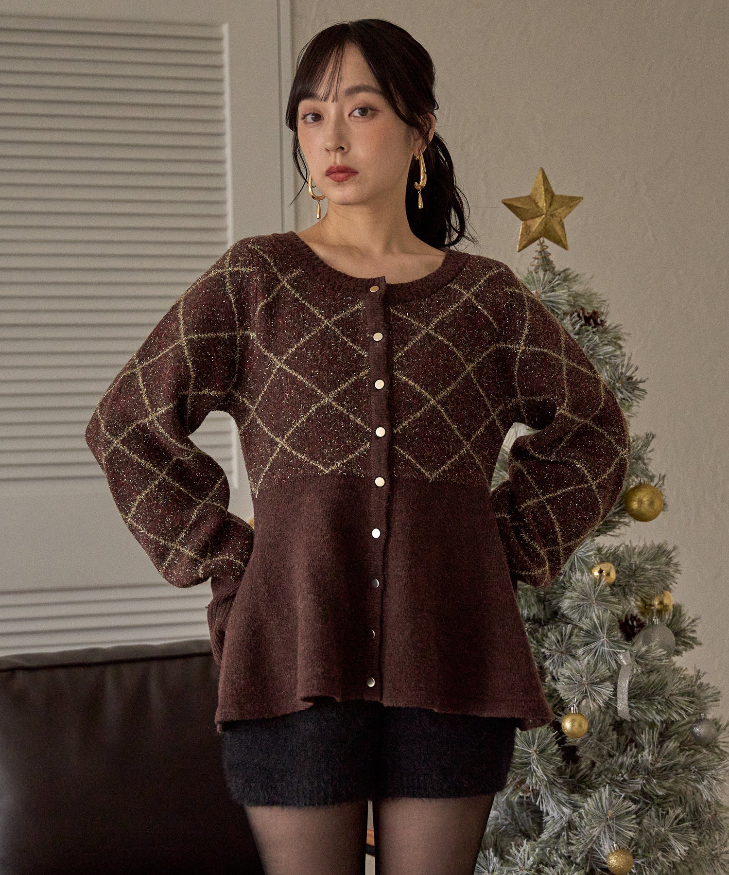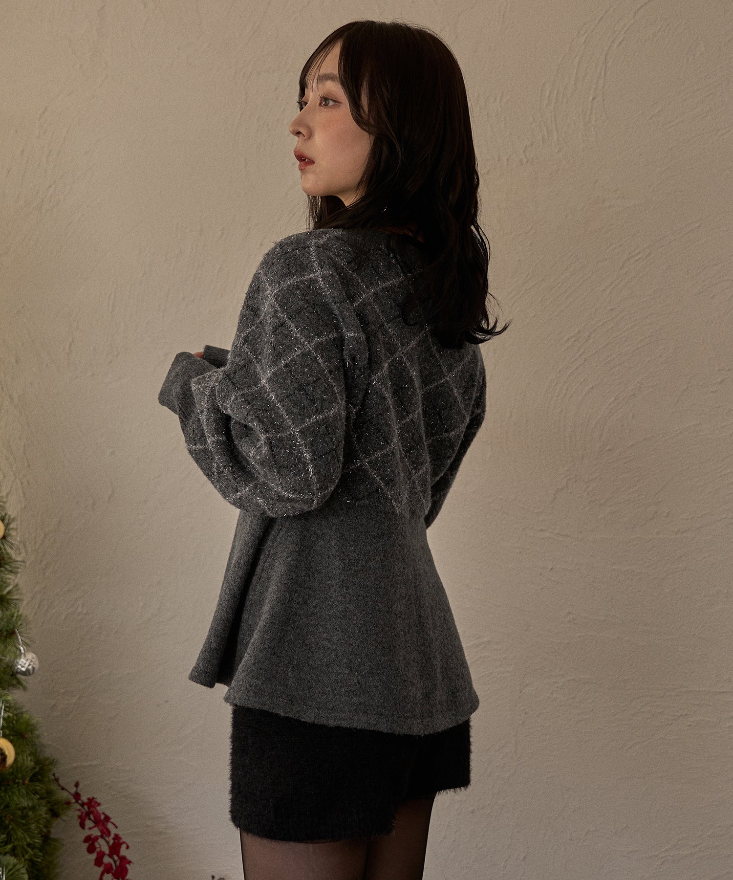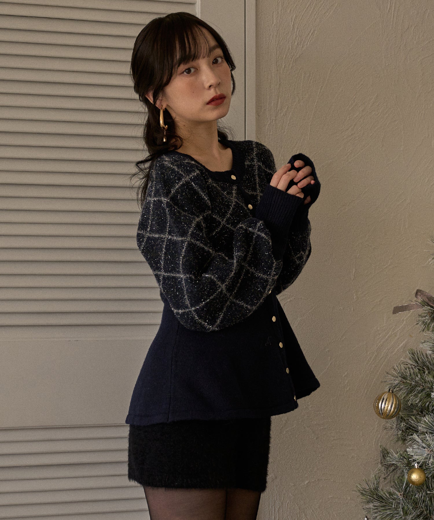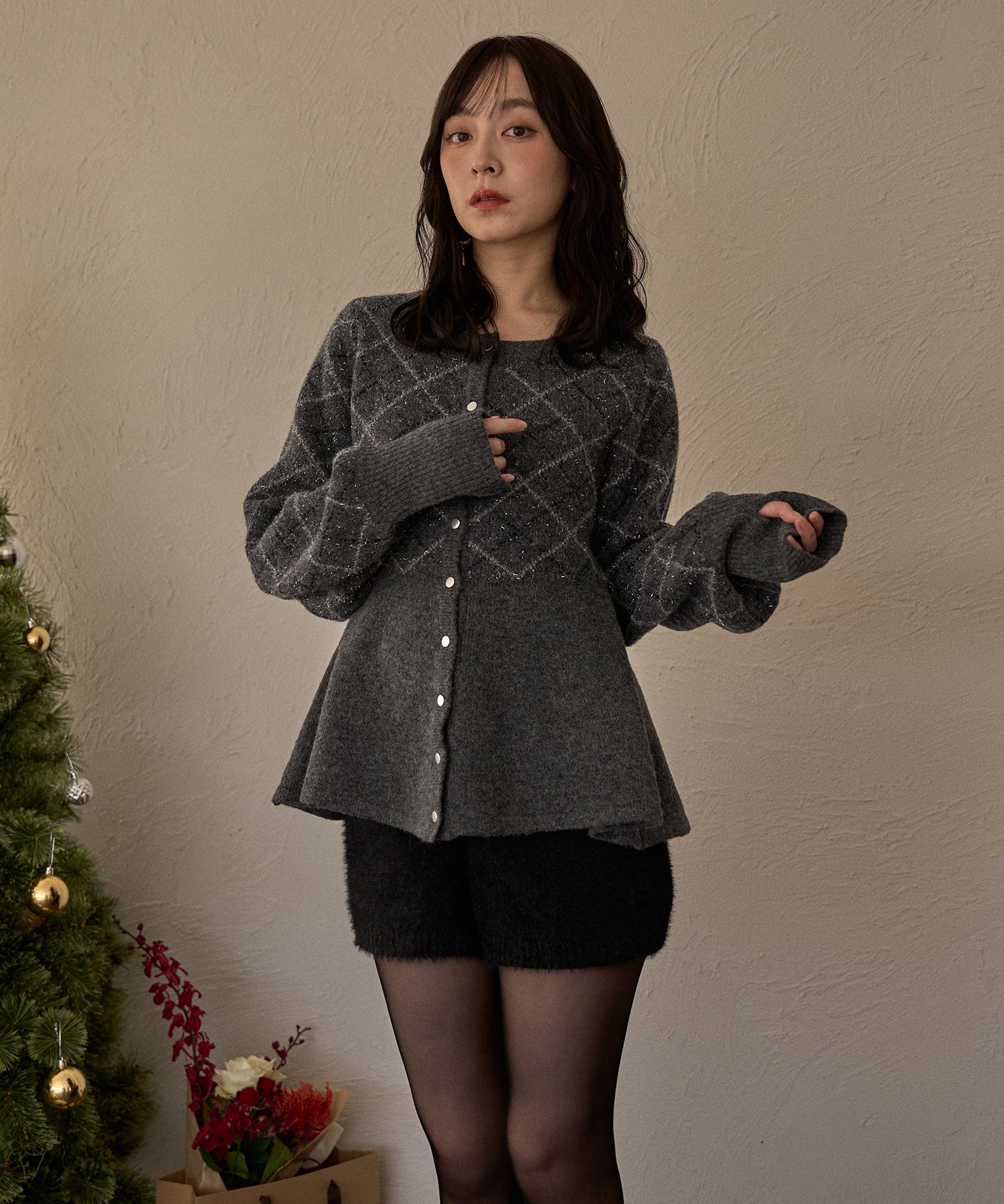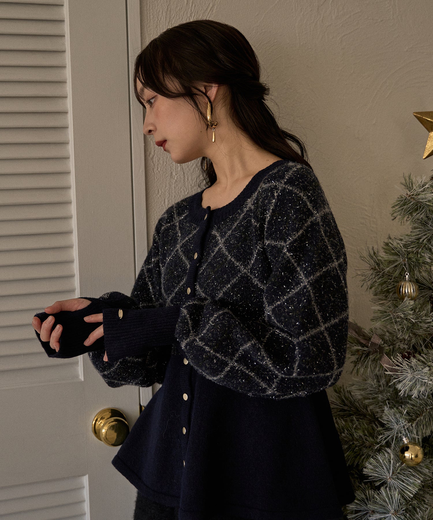 ラメ素材のラインが入ったアーガイル柄のペプラムニット。