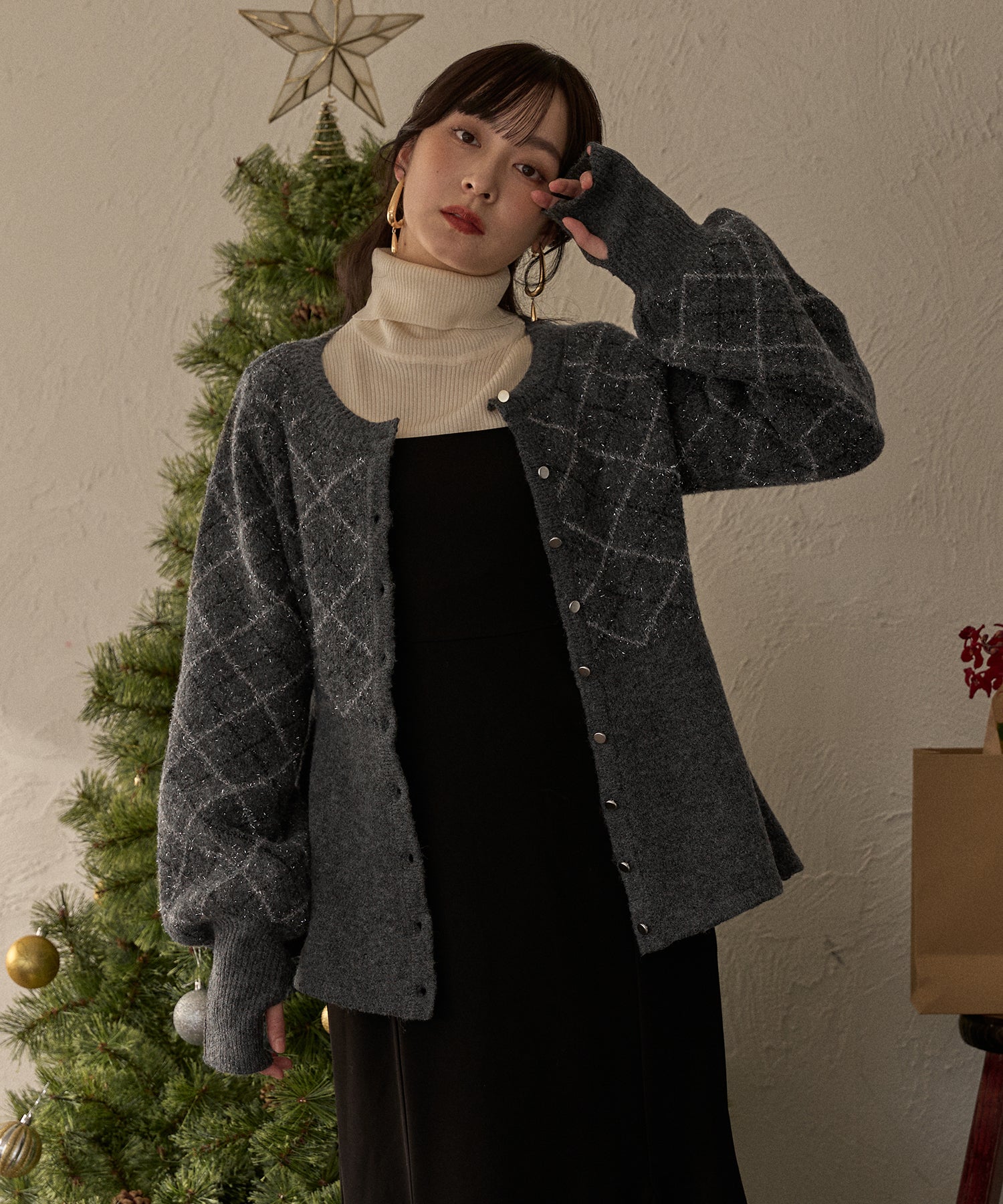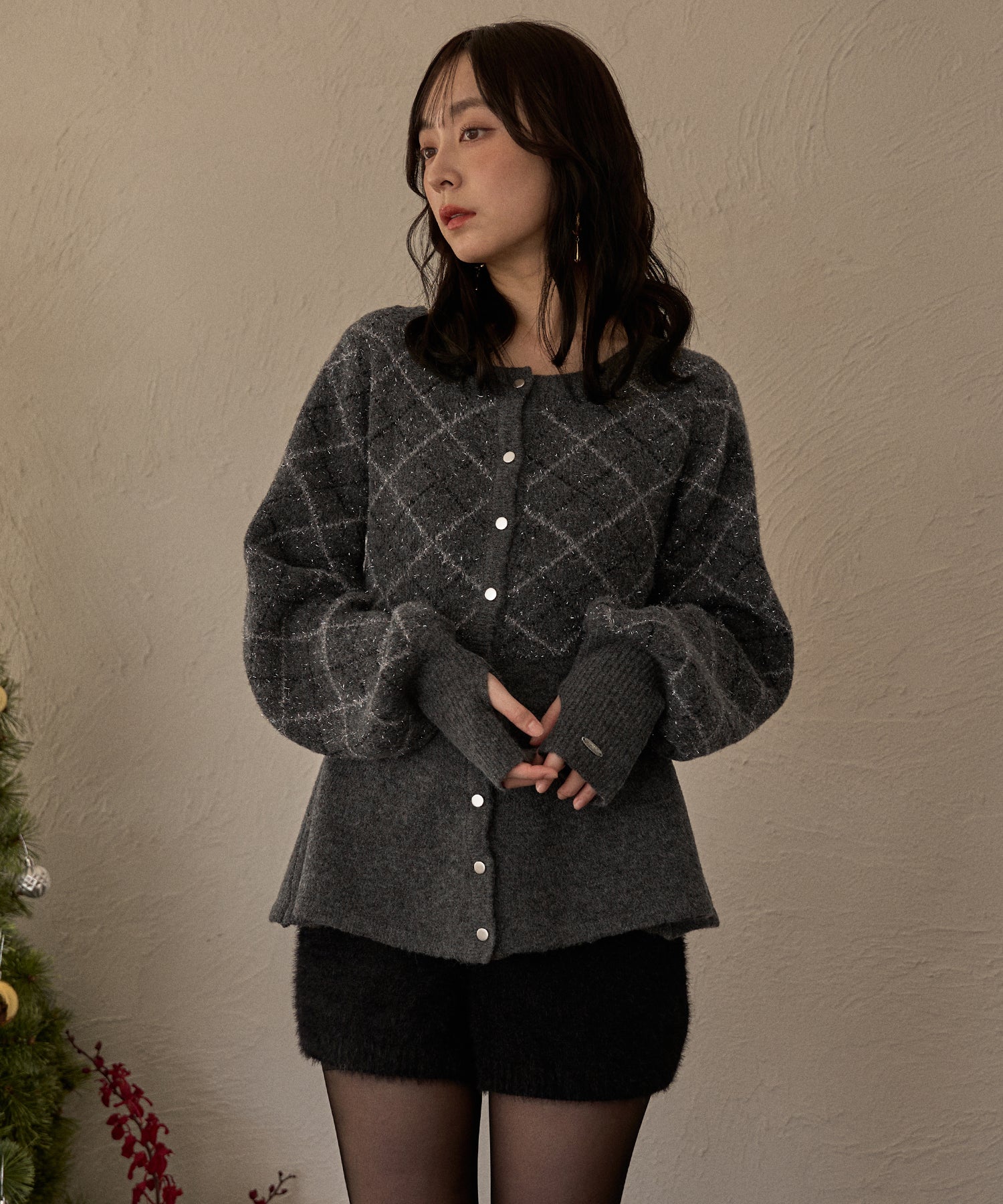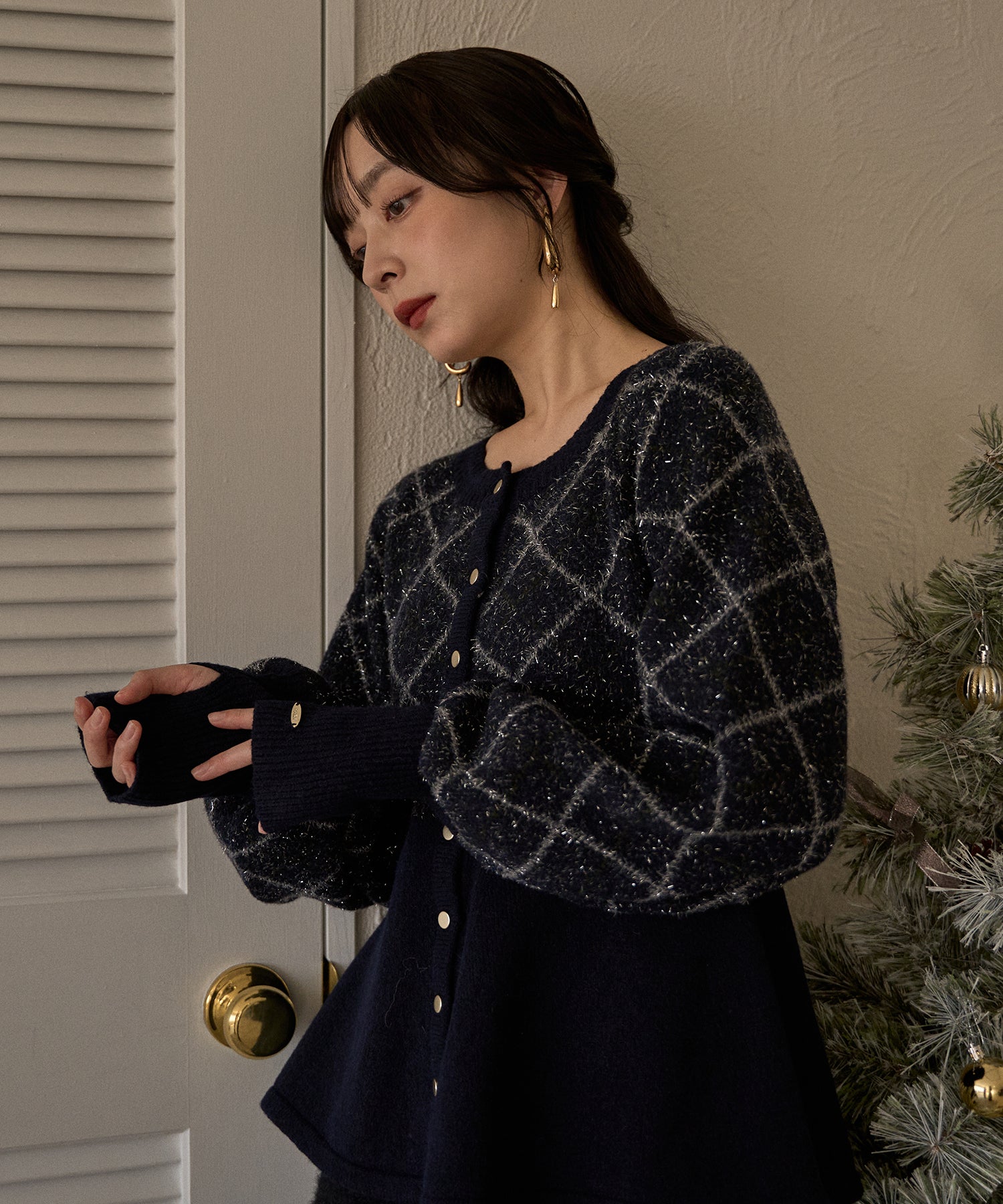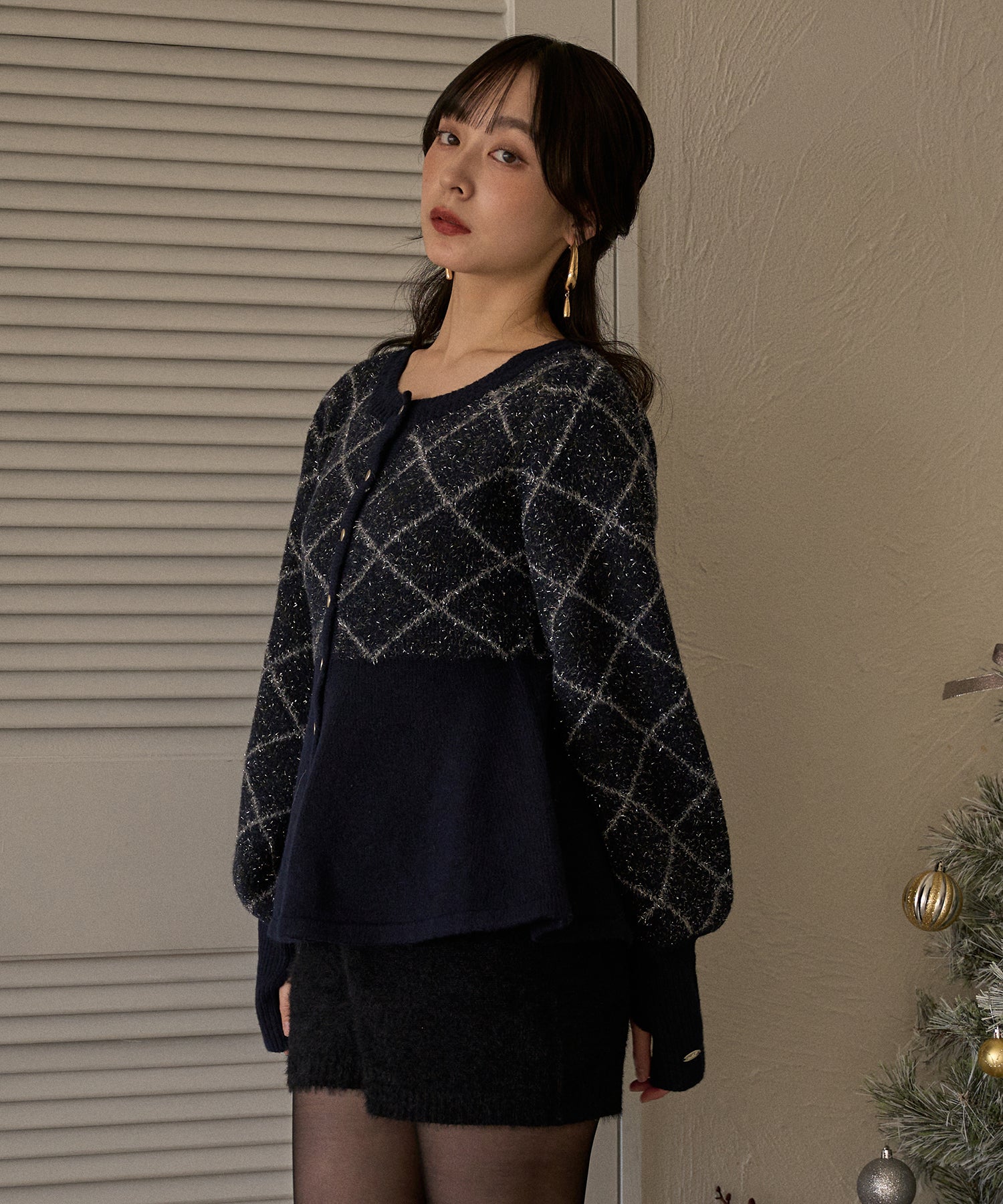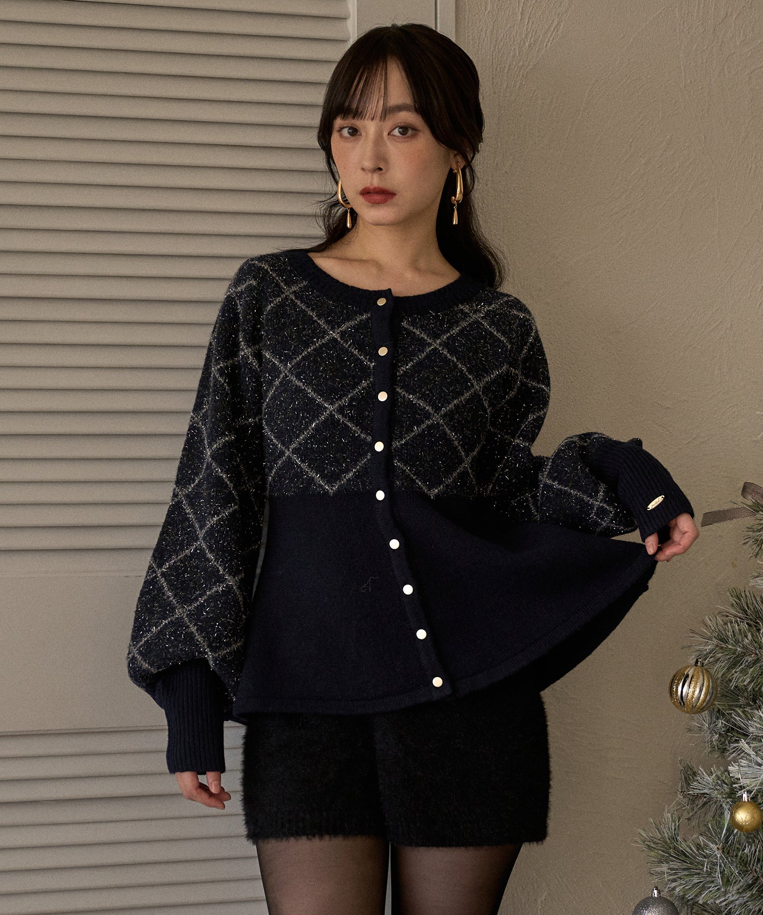 ラメ素材のラインが入ったアーガイル柄のペプラムニット。