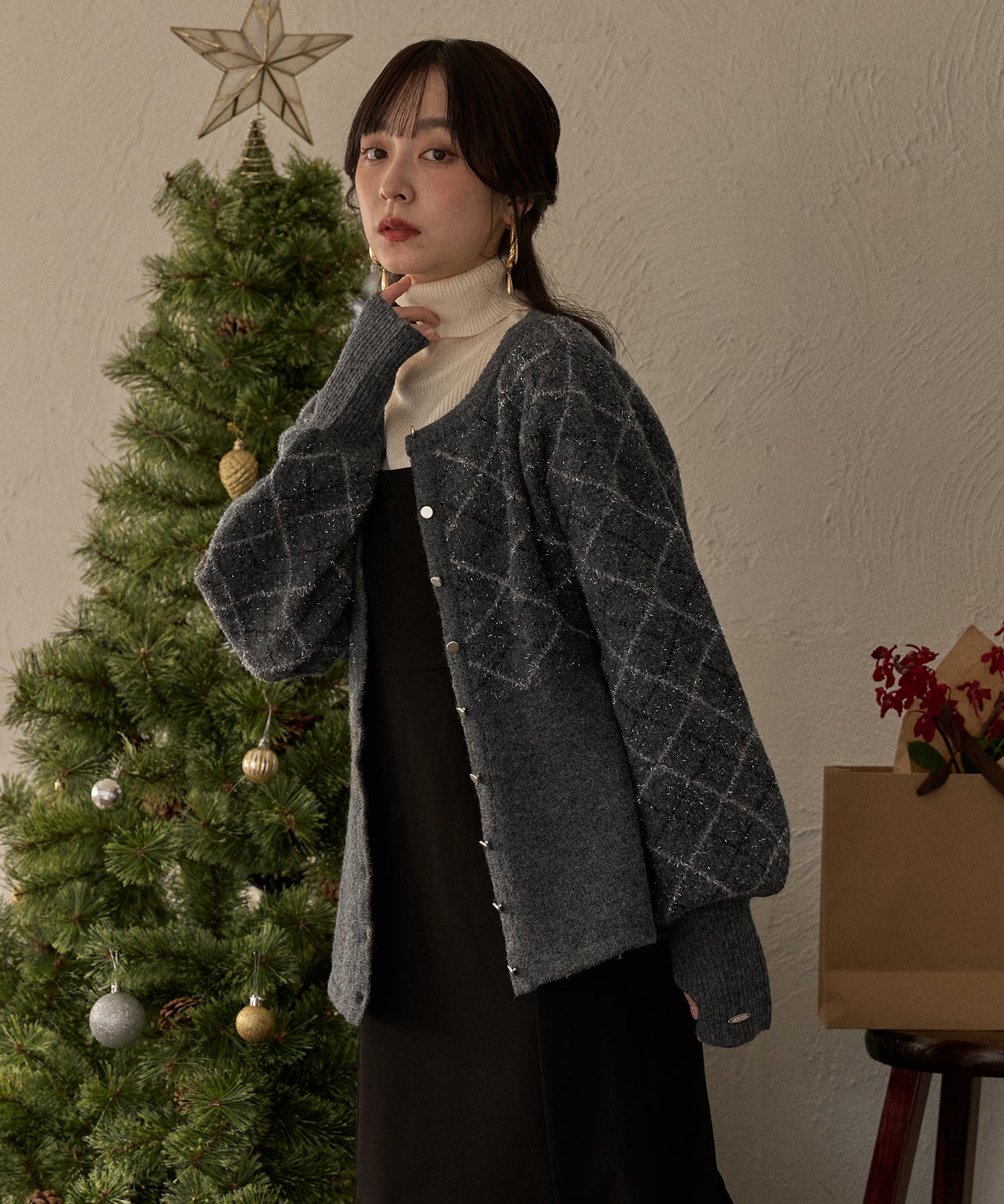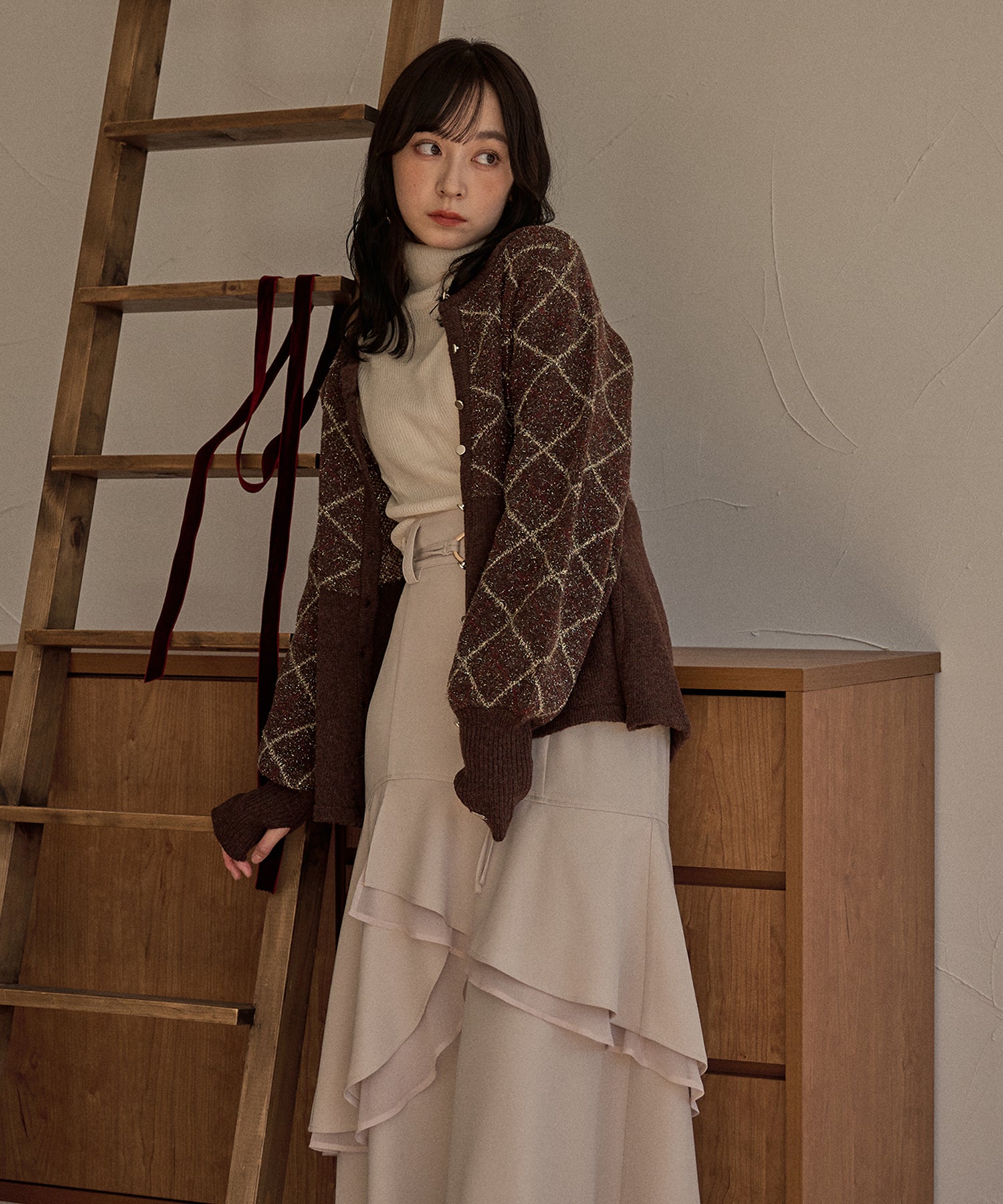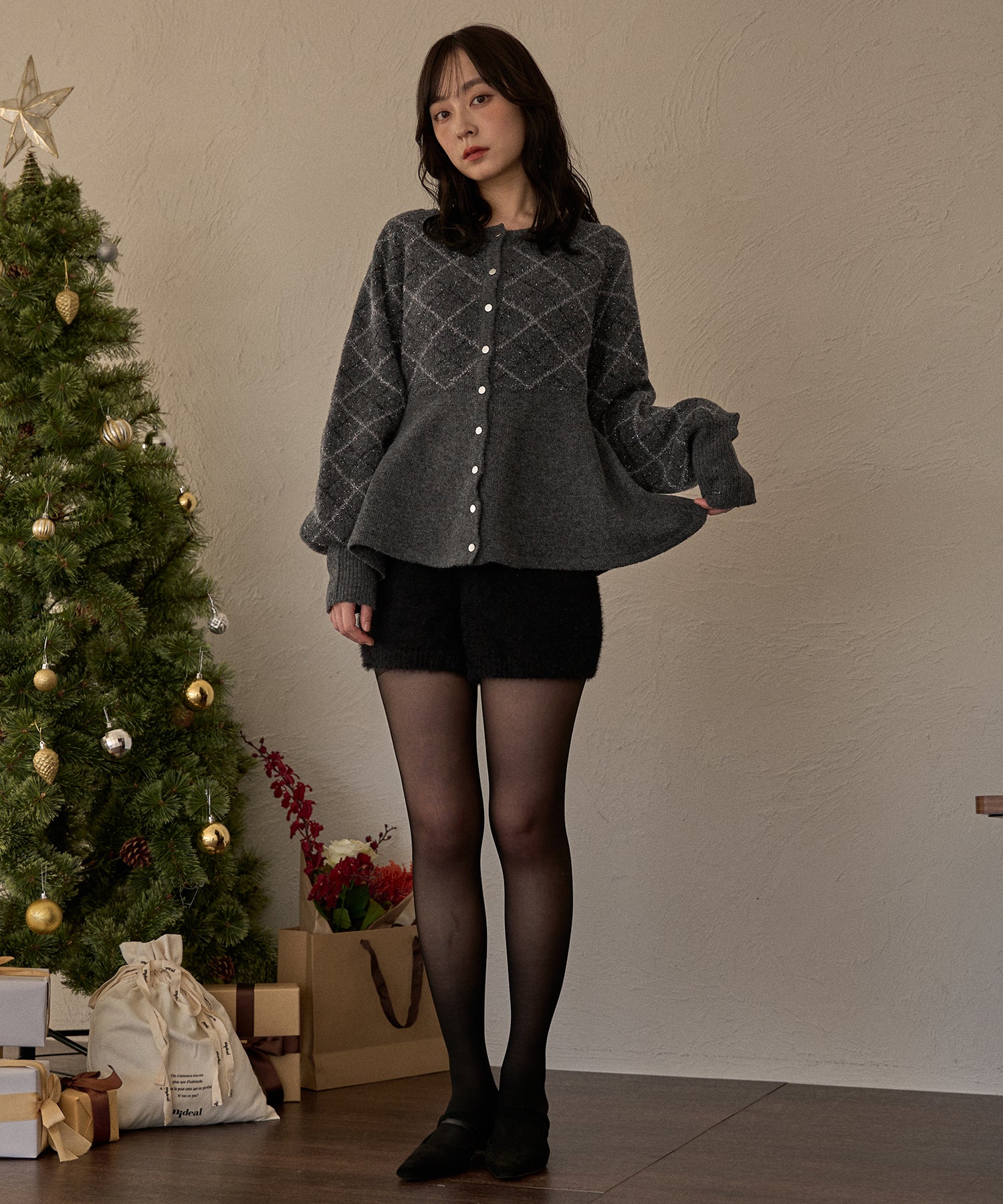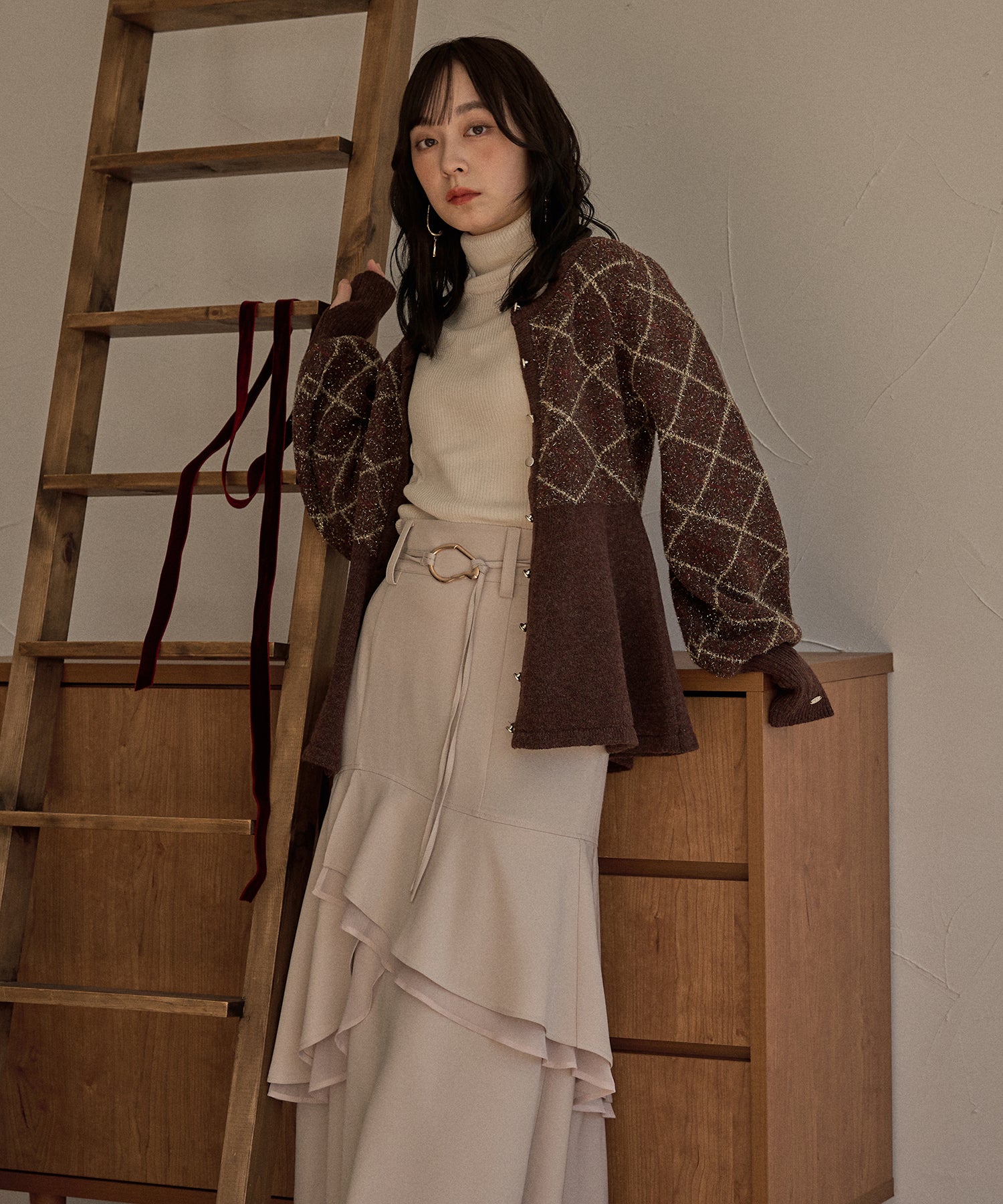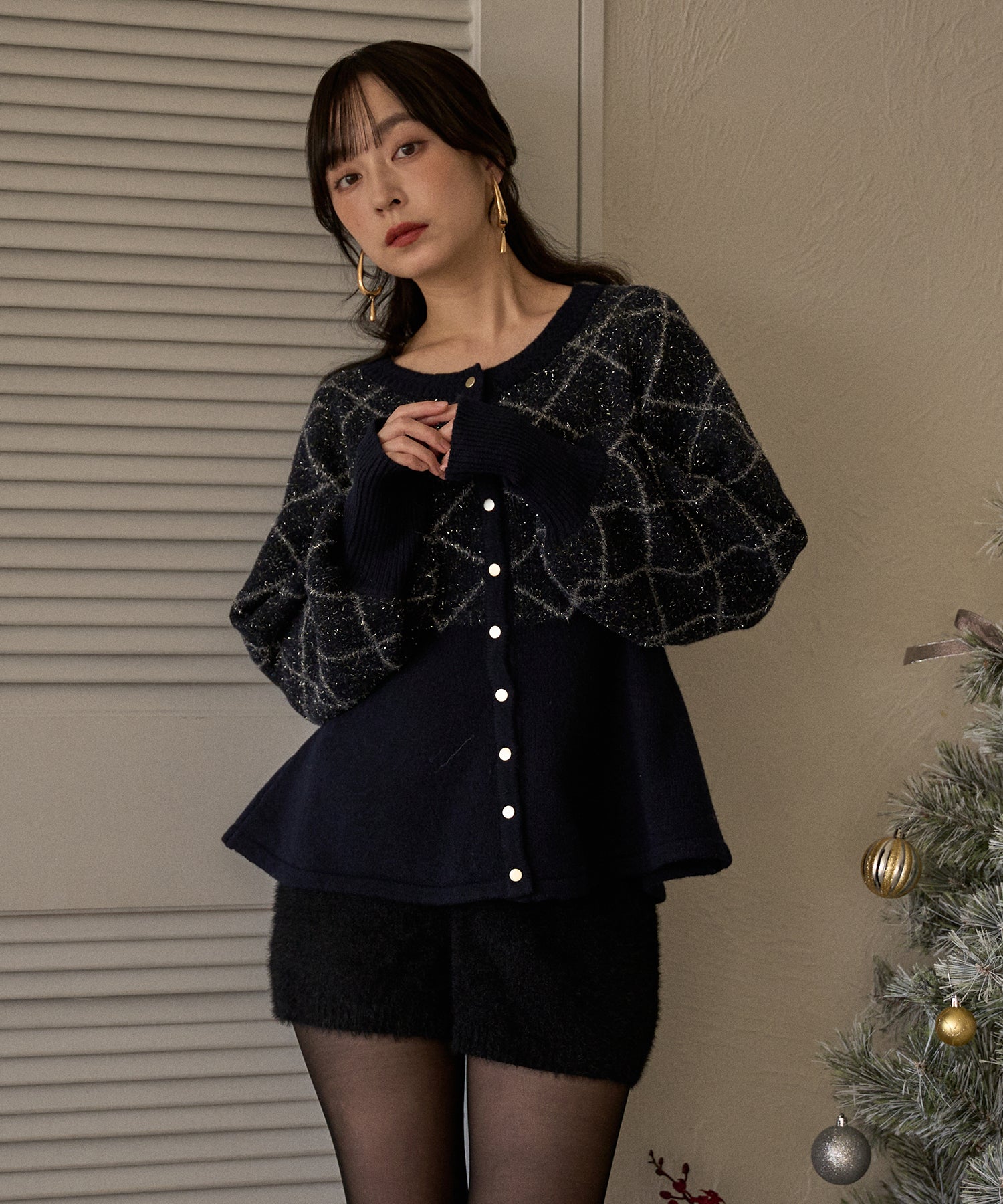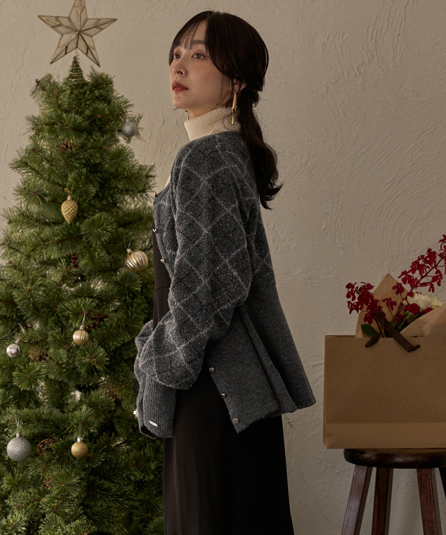 ラメ素材のラインが入ったアーガイル柄のペプラムニット。