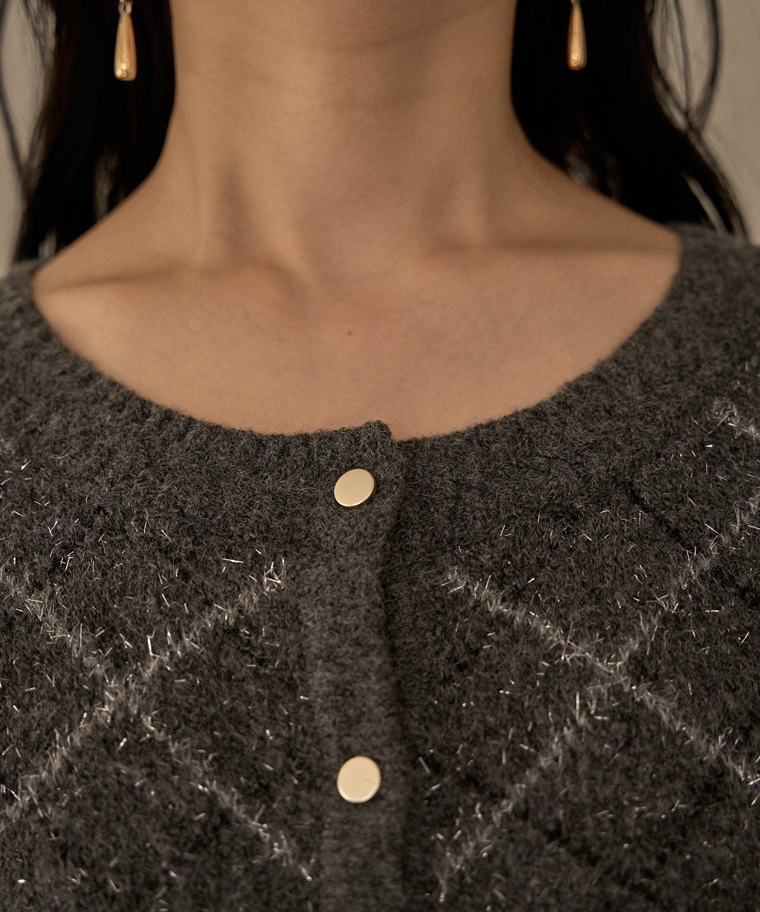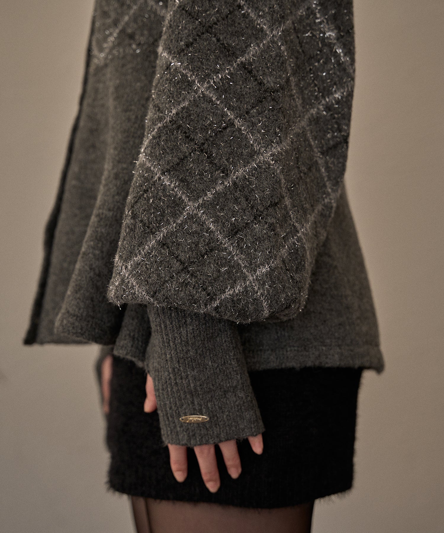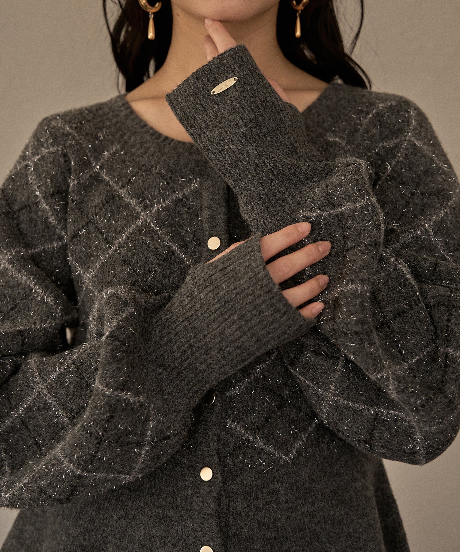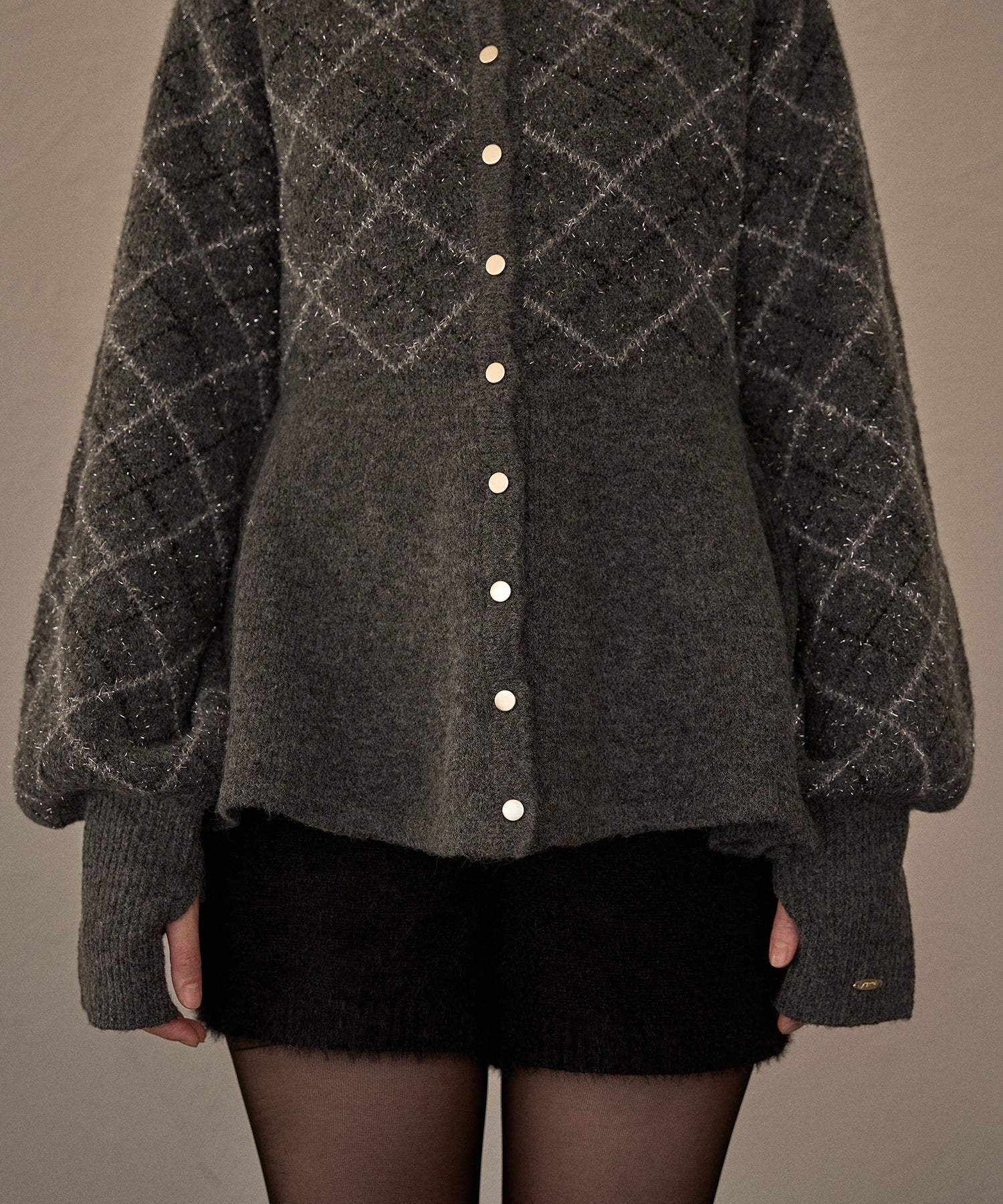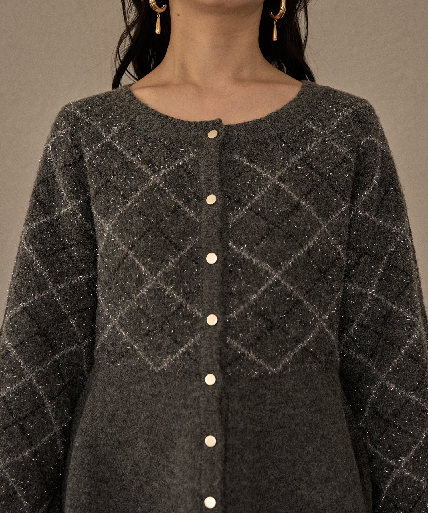 ラメ素材のラインが入ったアーガイル柄のペプラムニット。