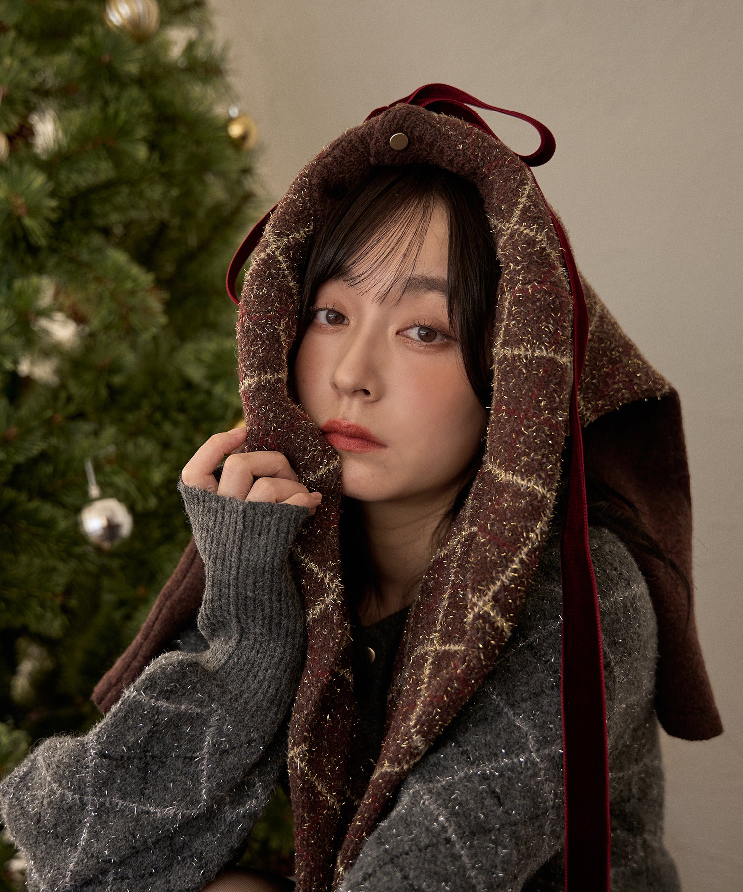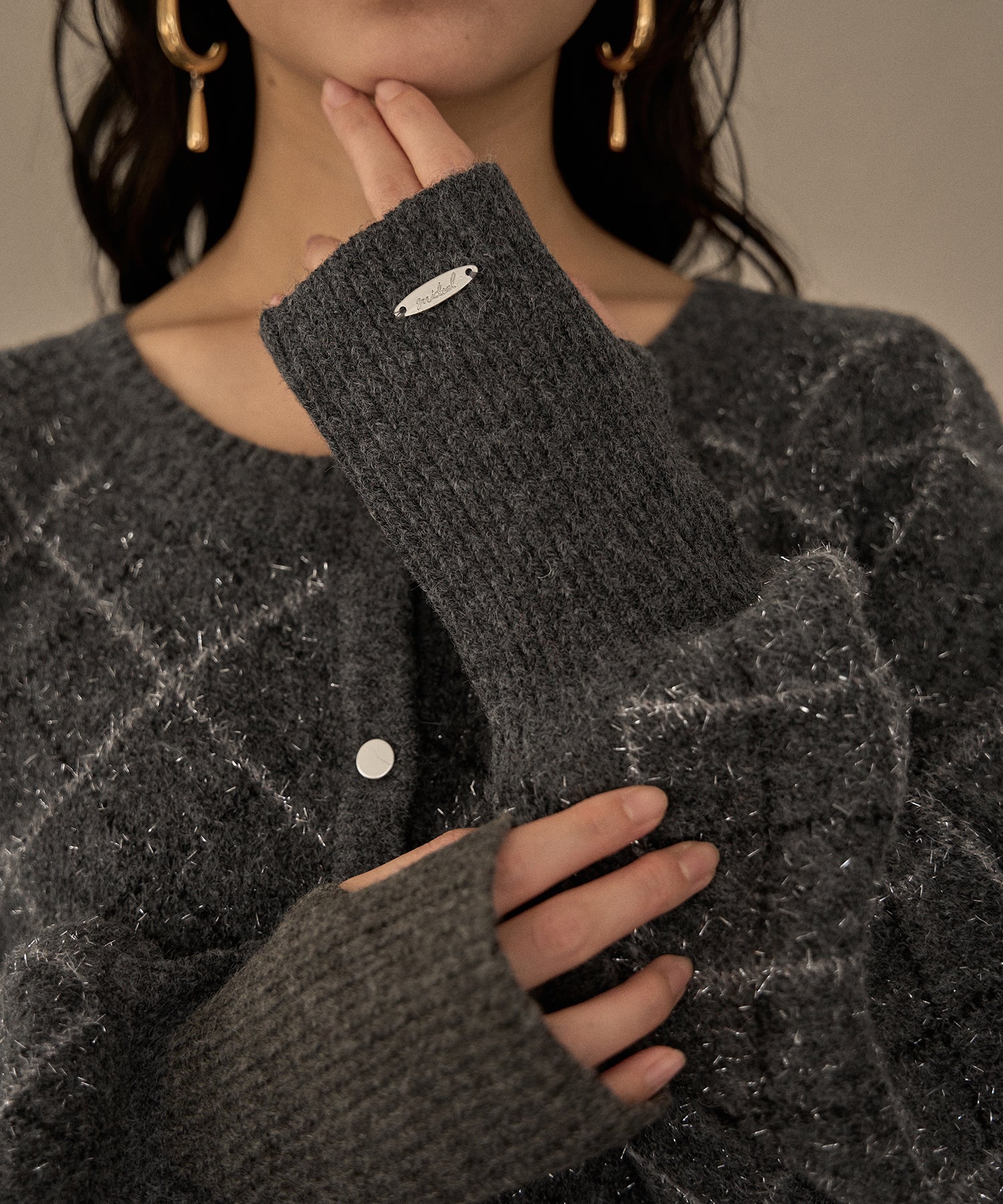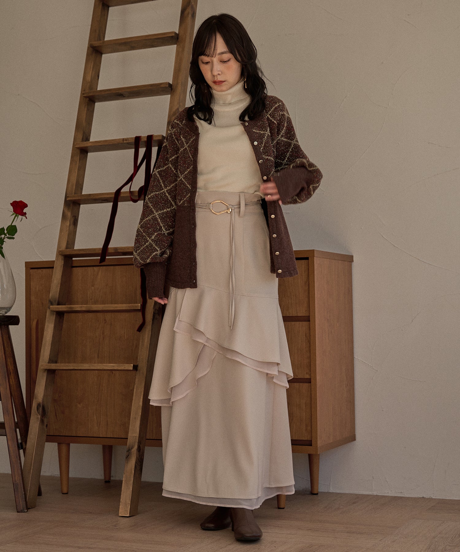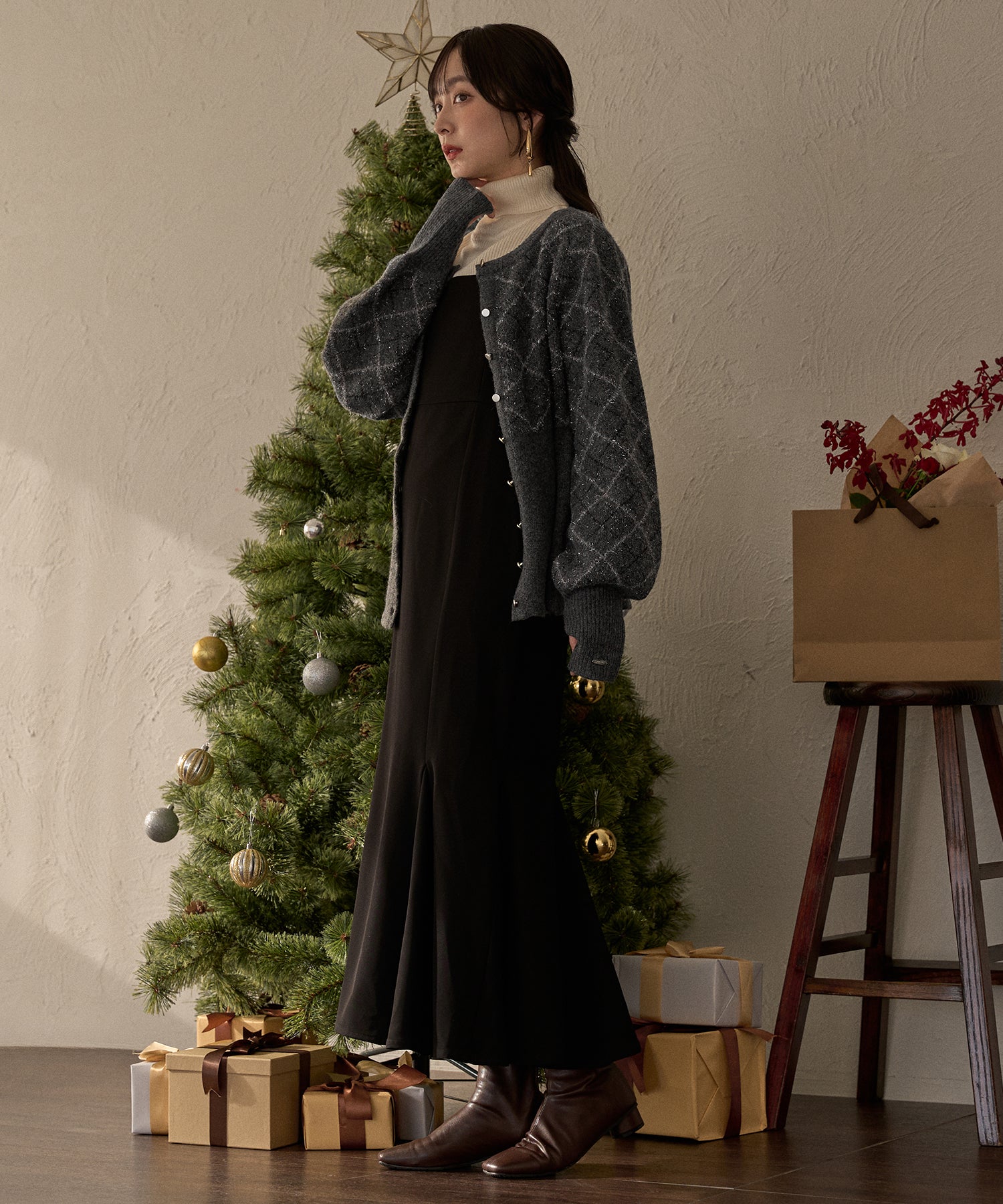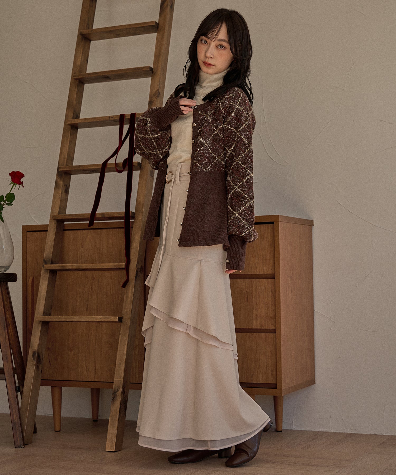 ラメ素材のラインが入ったアーガイル柄のペプラムニット。