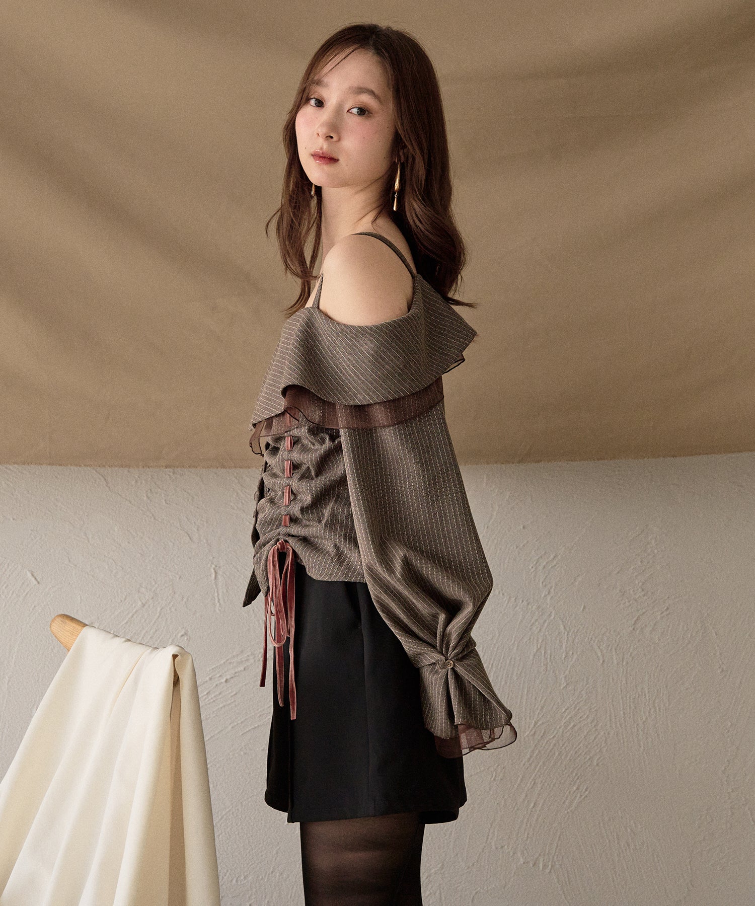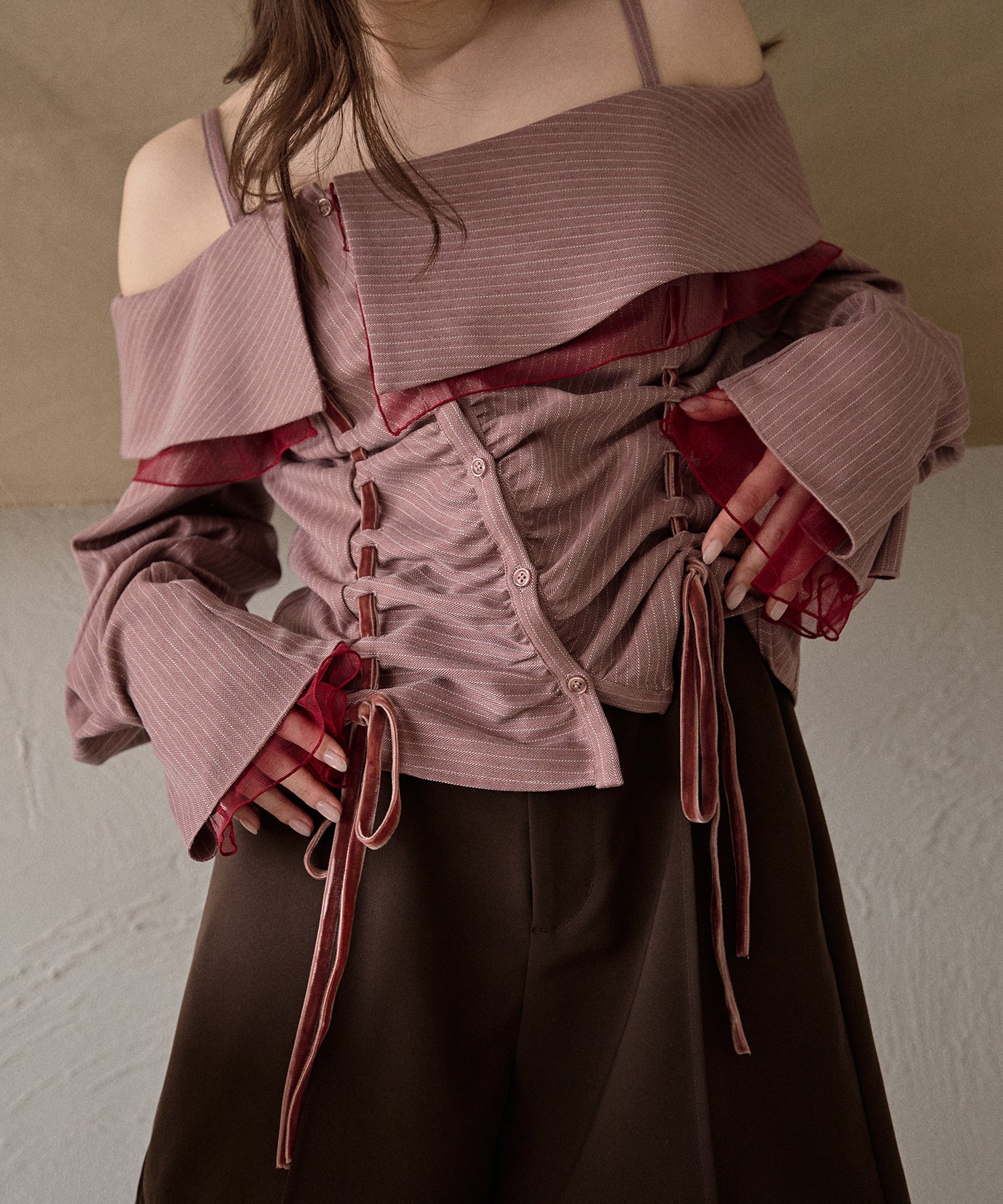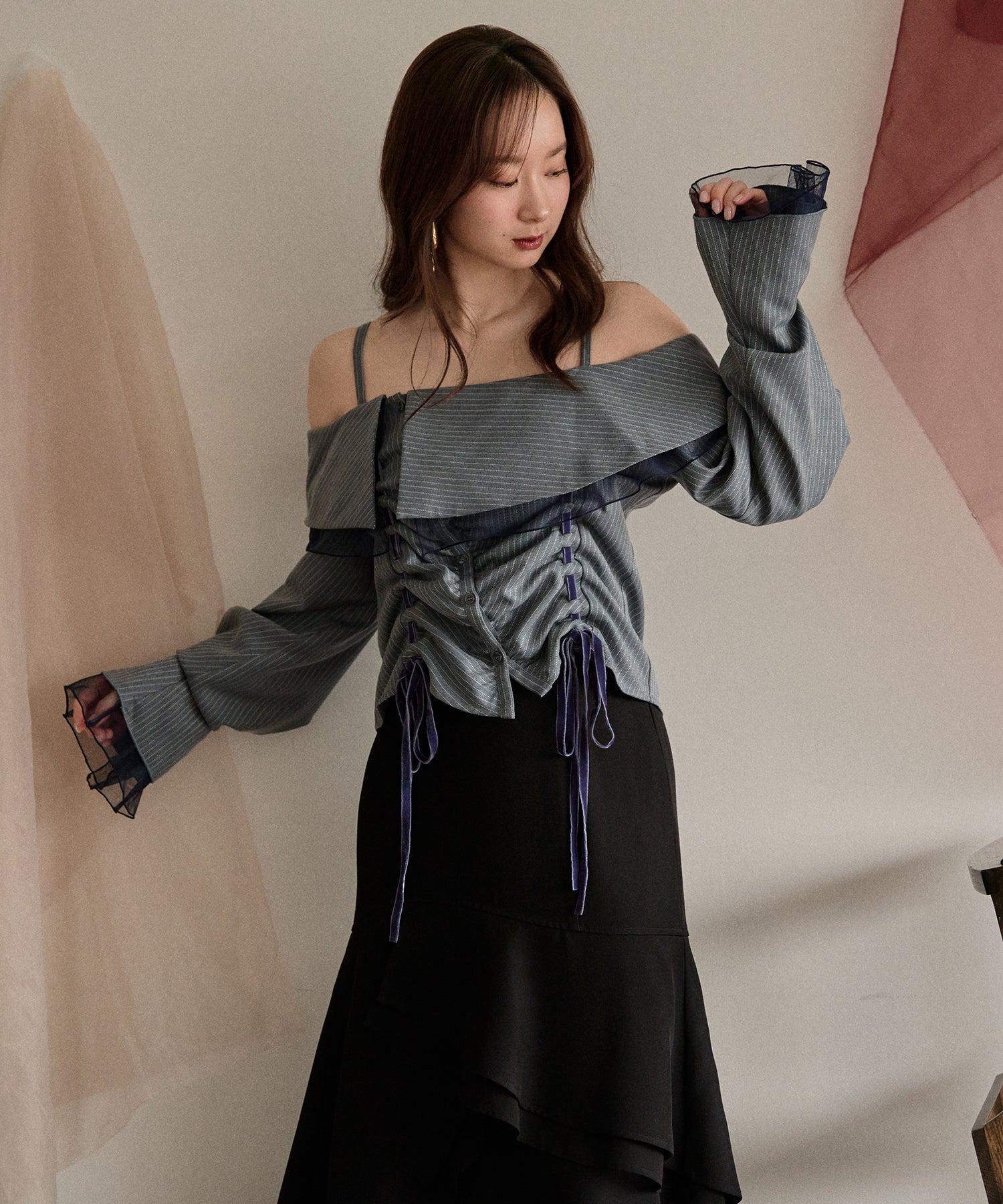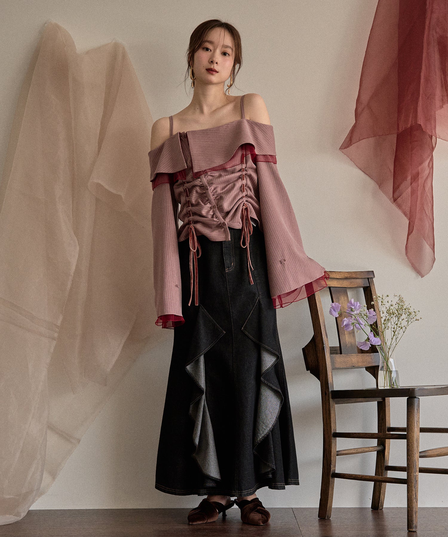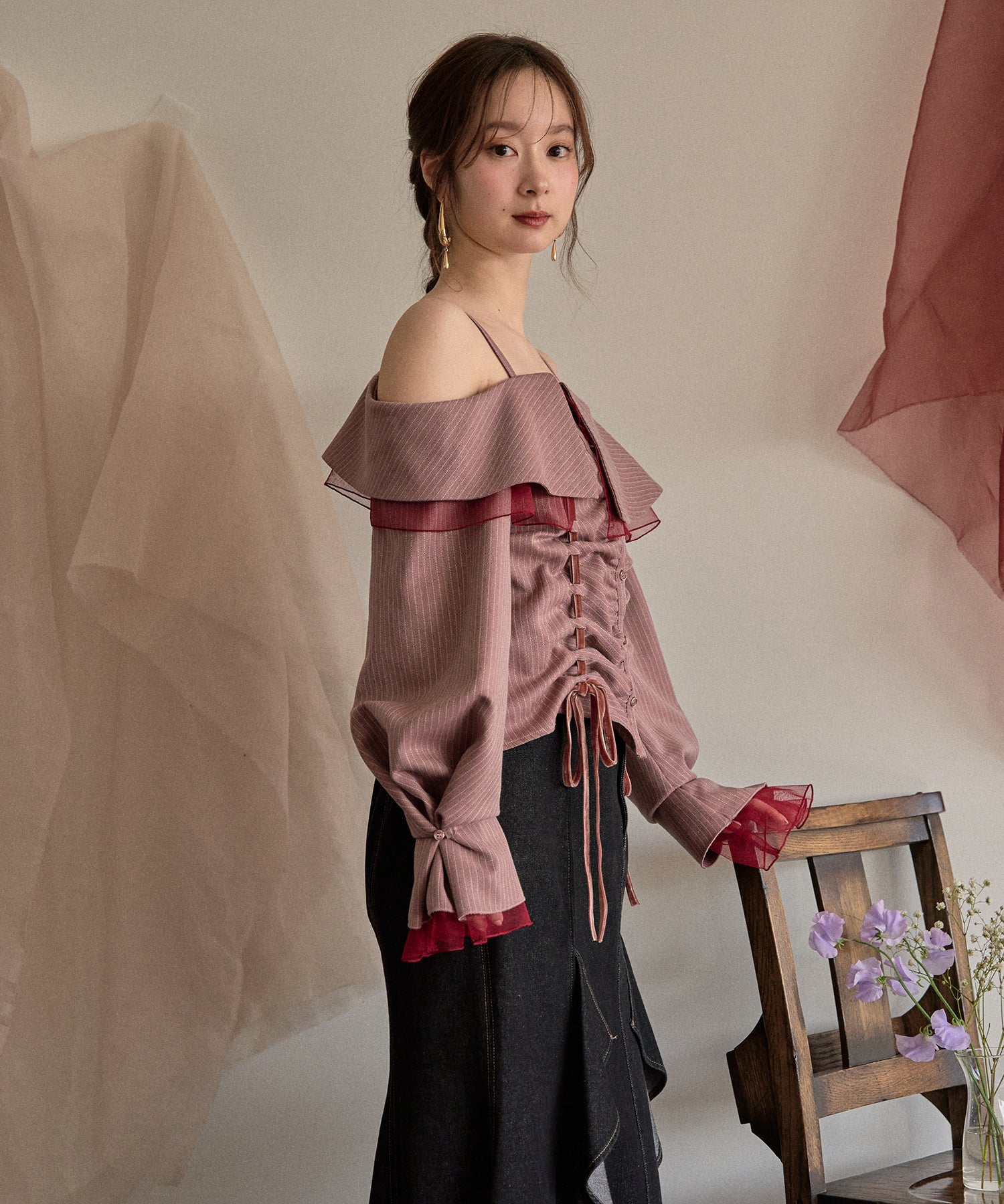 frill offshoulder stitch ribbon tops / フリルオフショルダーステッチリボントップス