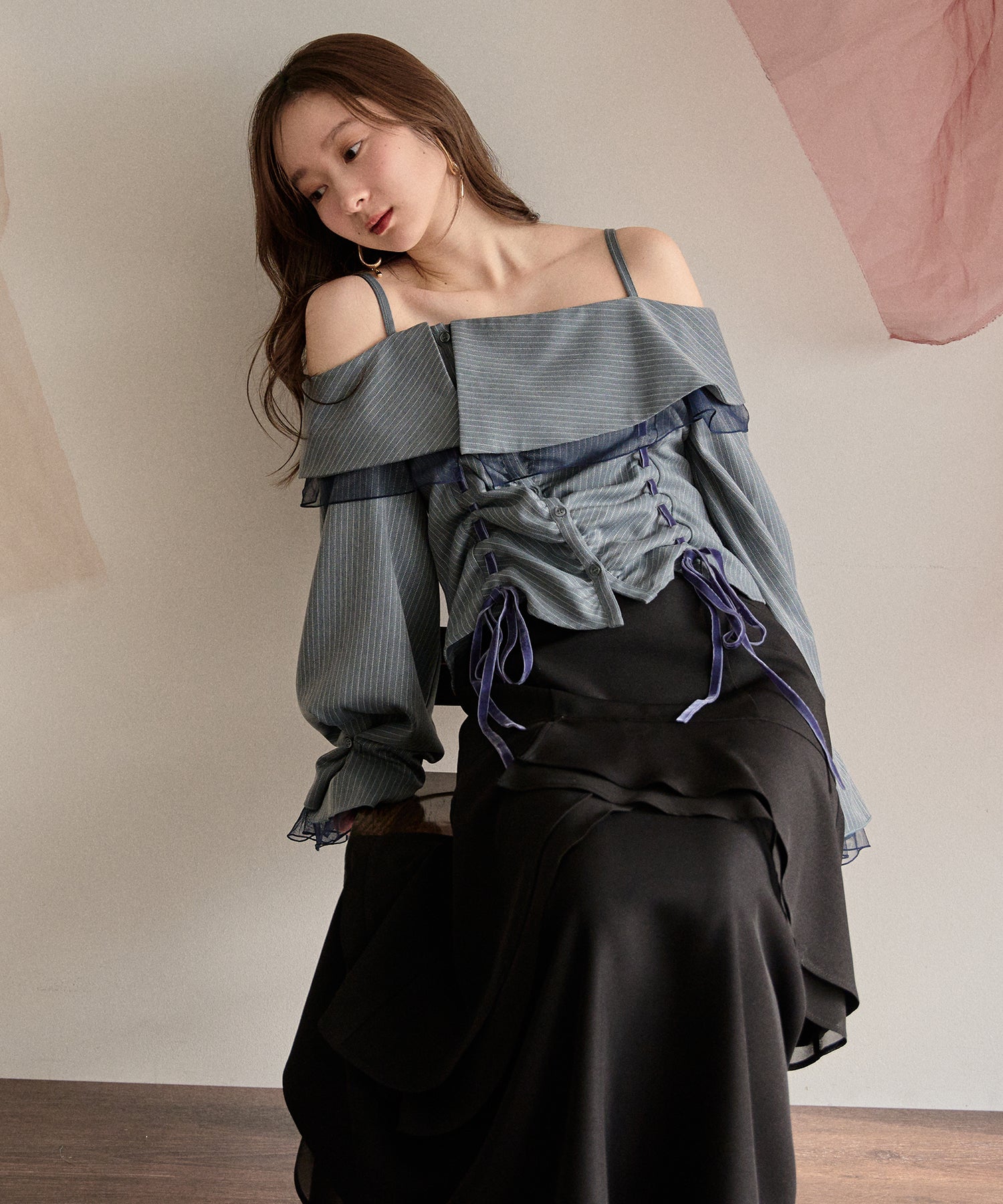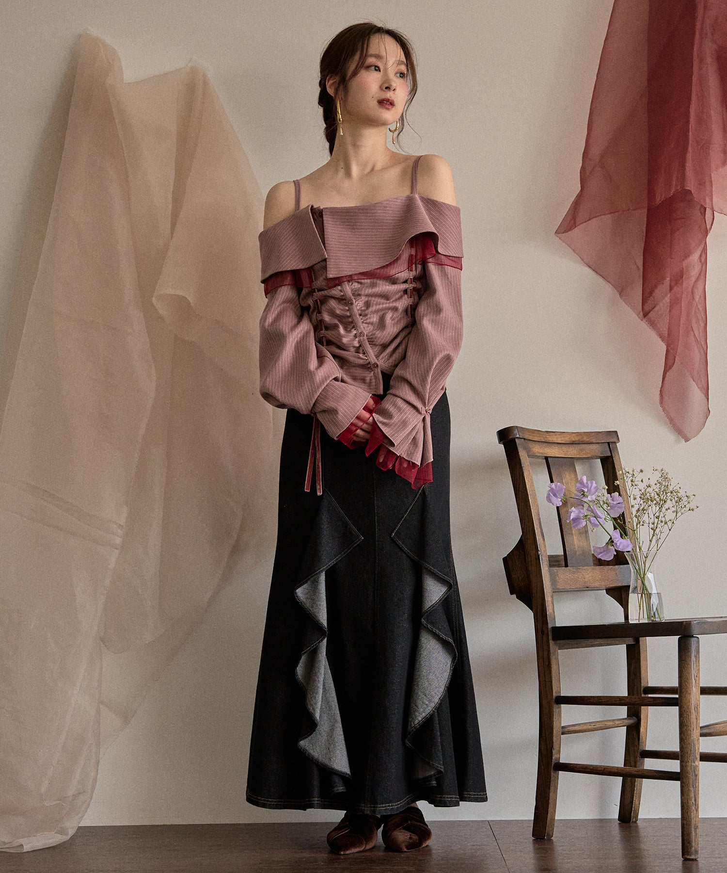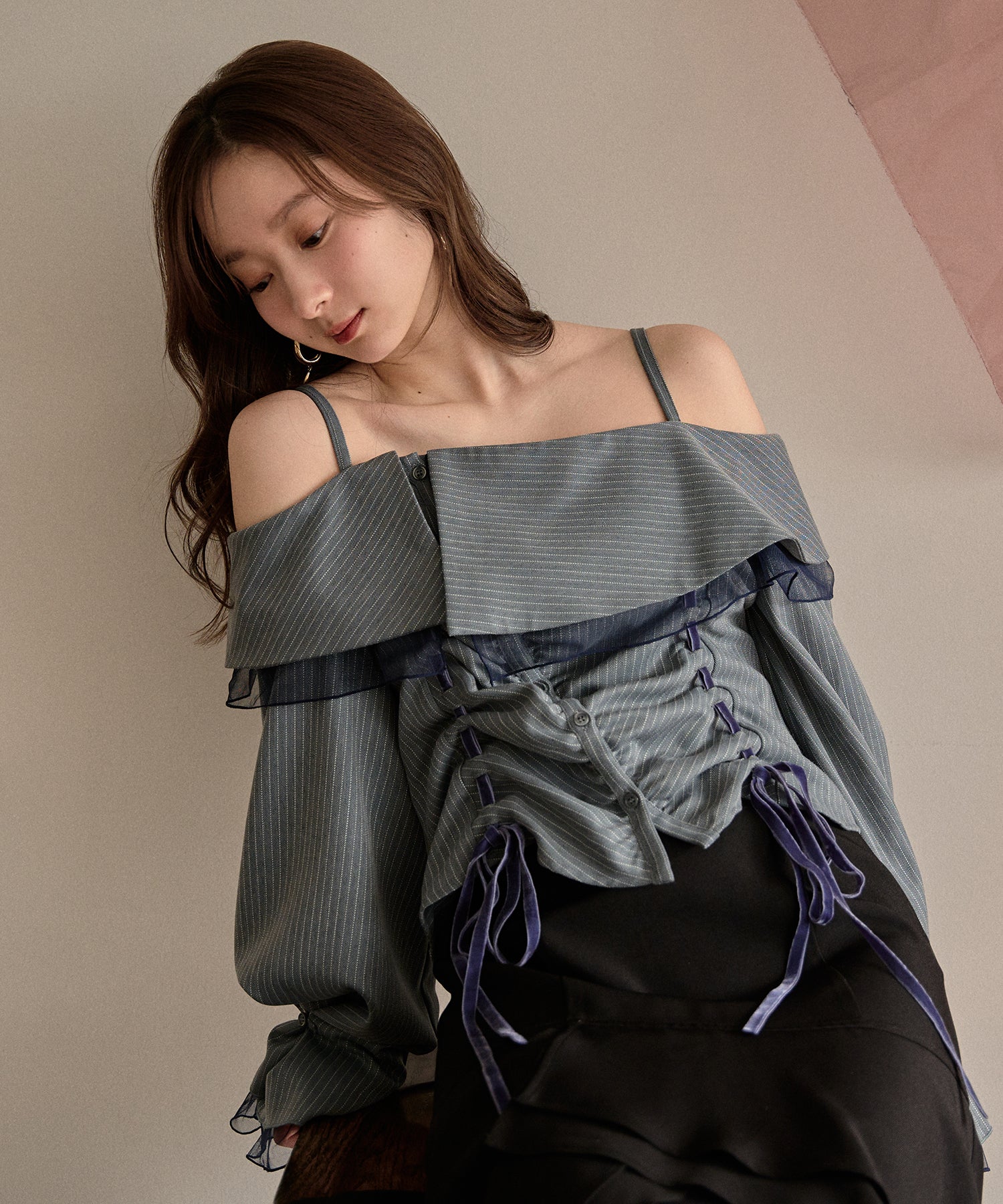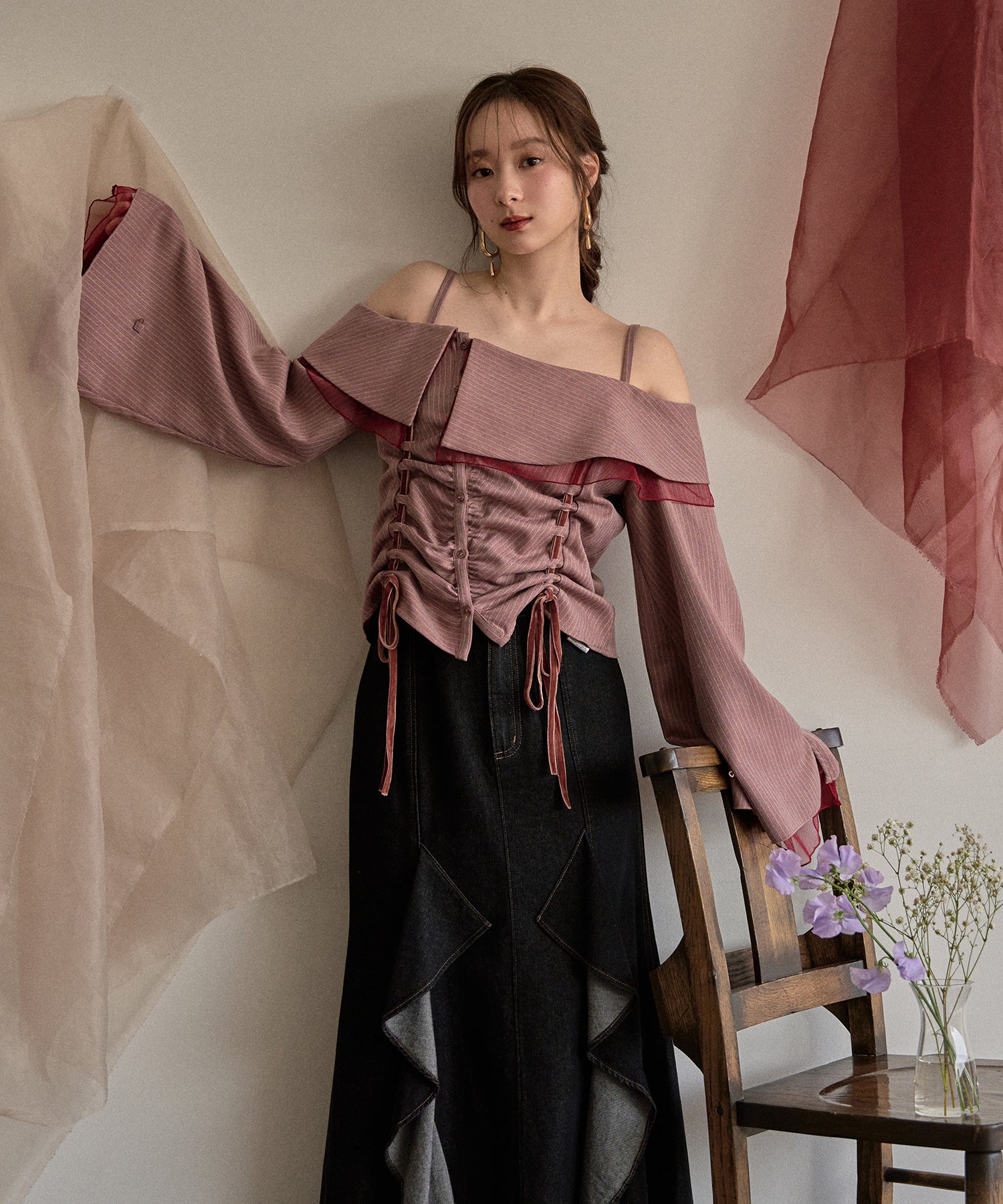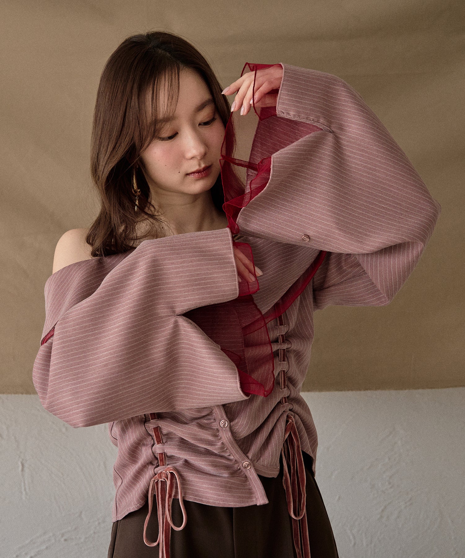 frill offshoulder stitch ribbon tops / フリルオフショルダーステッチリボントップス