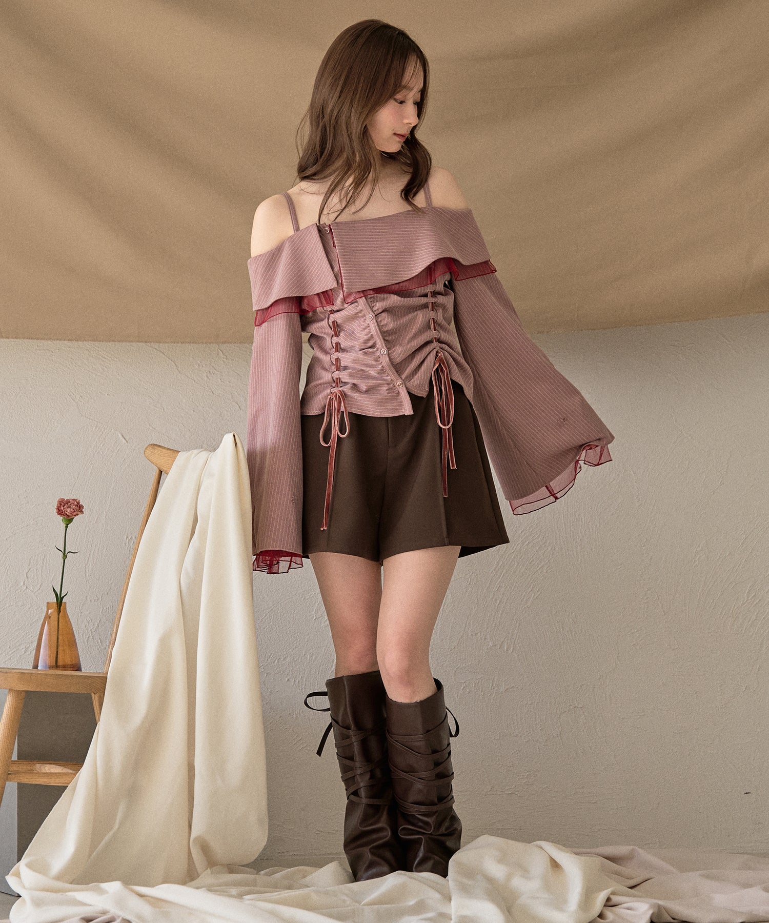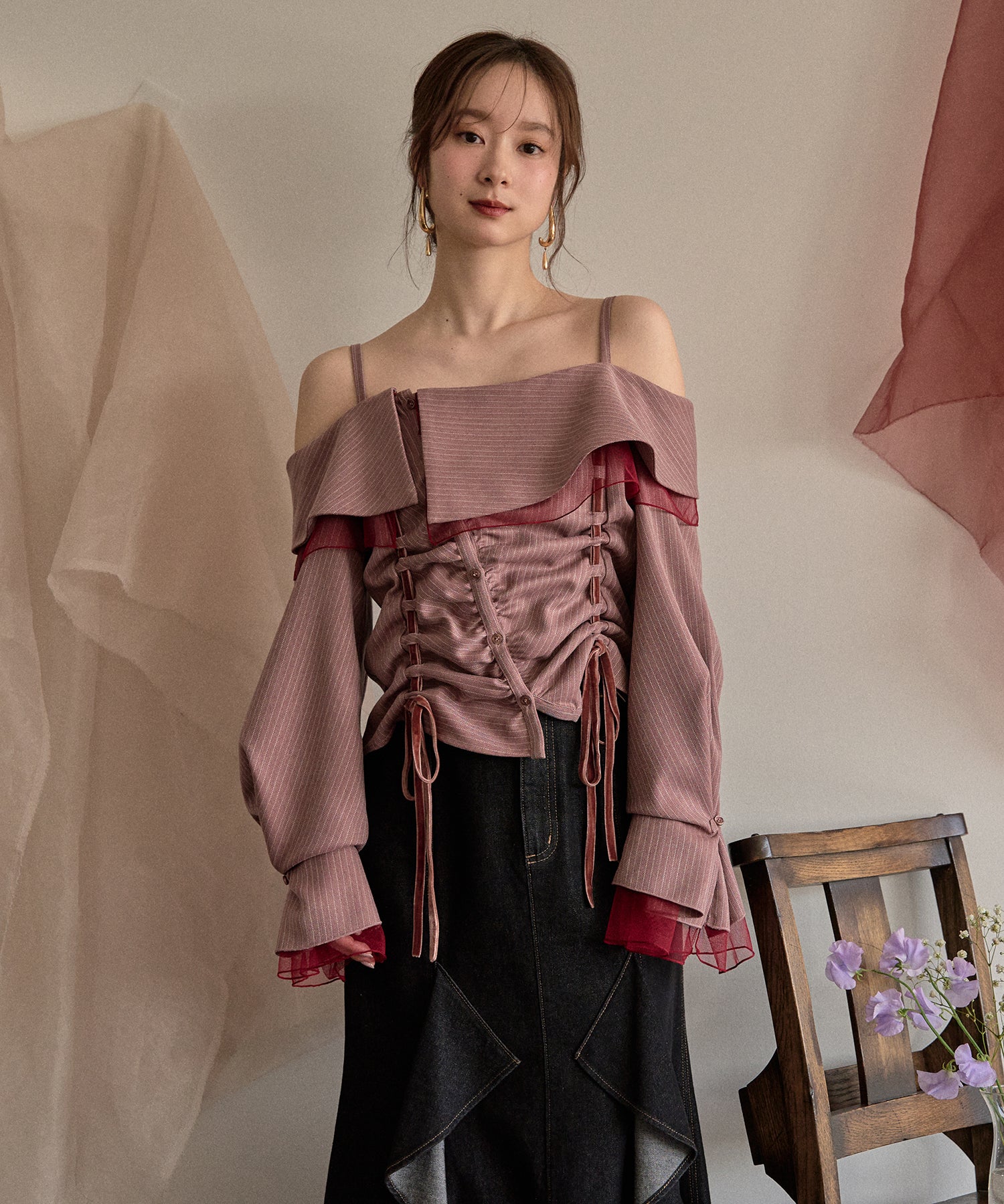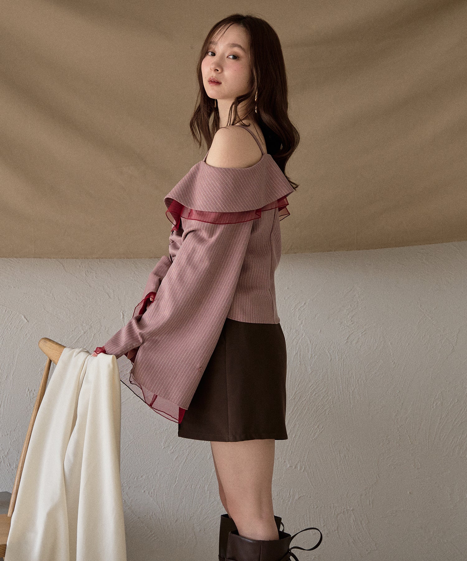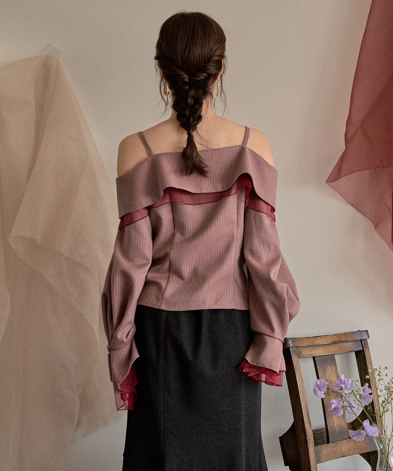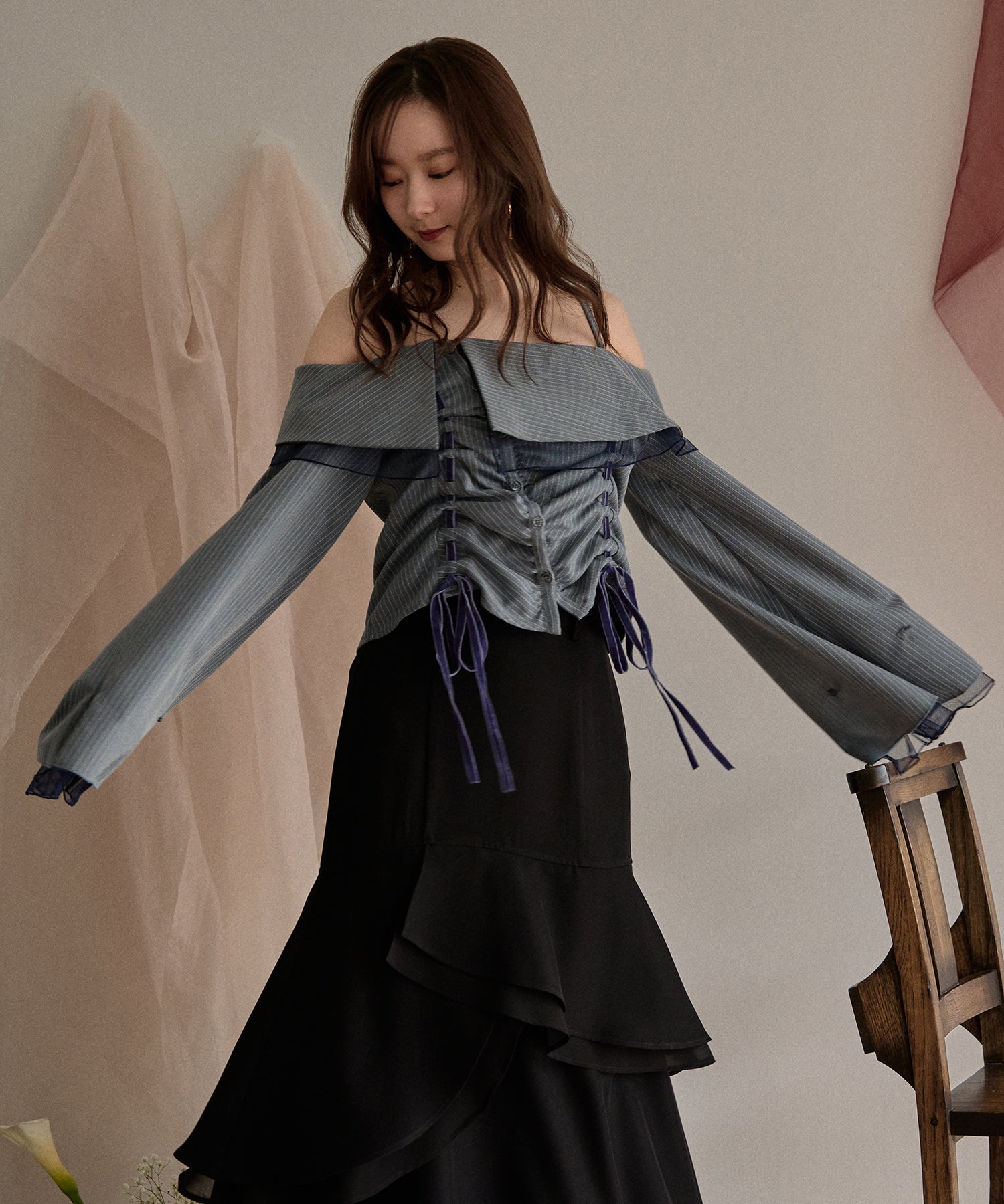 frill offshoulder stitch ribbon tops / フリルオフショルダーステッチリボントップス