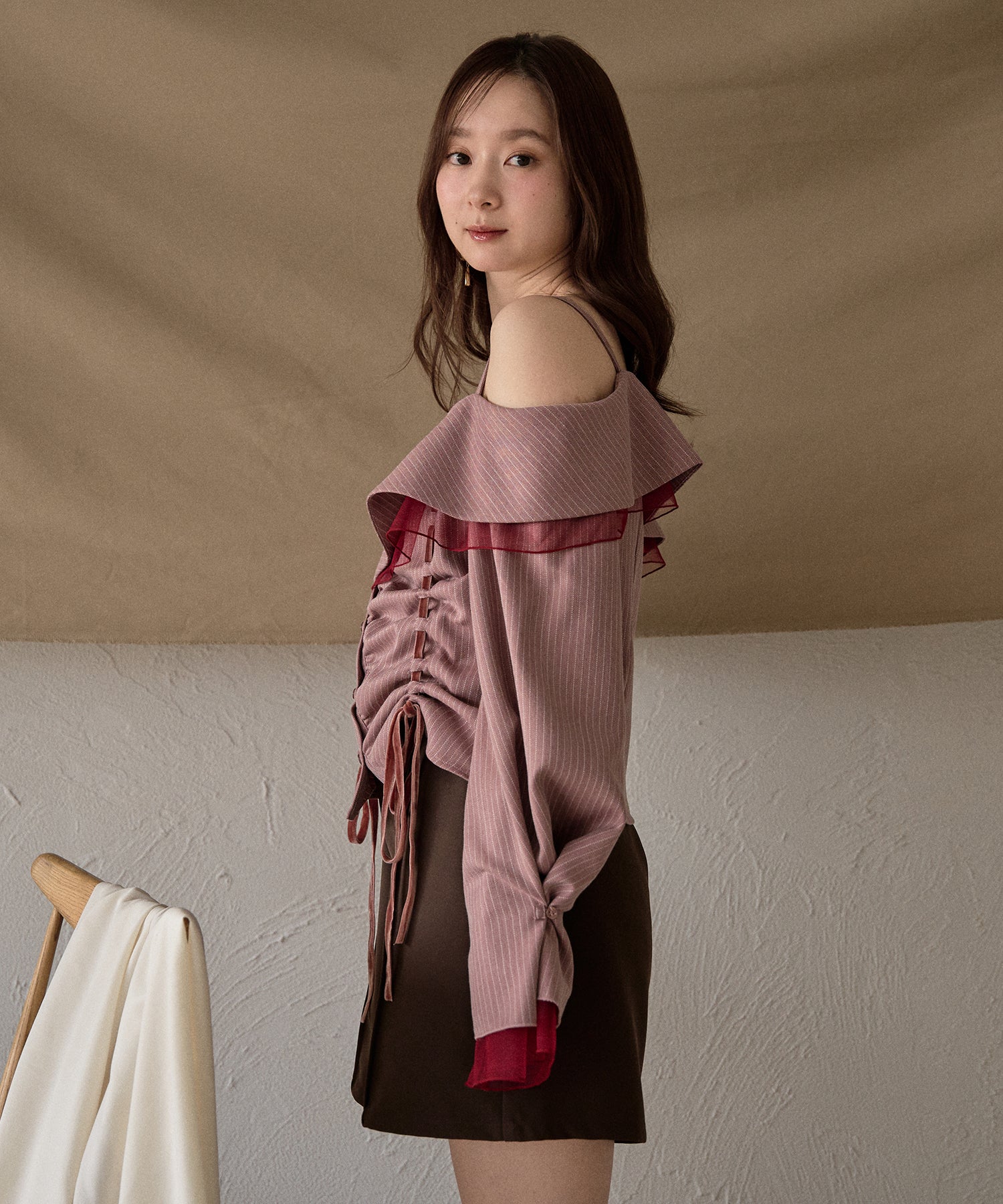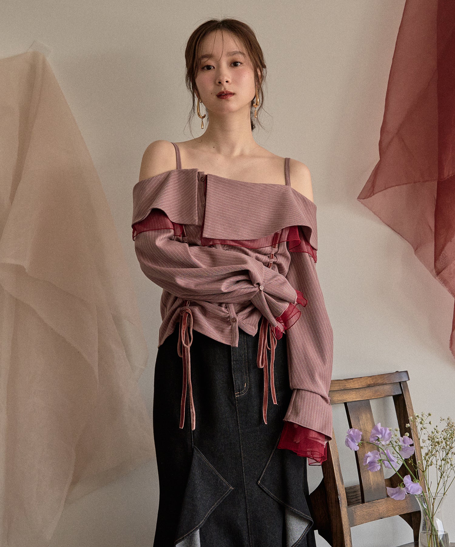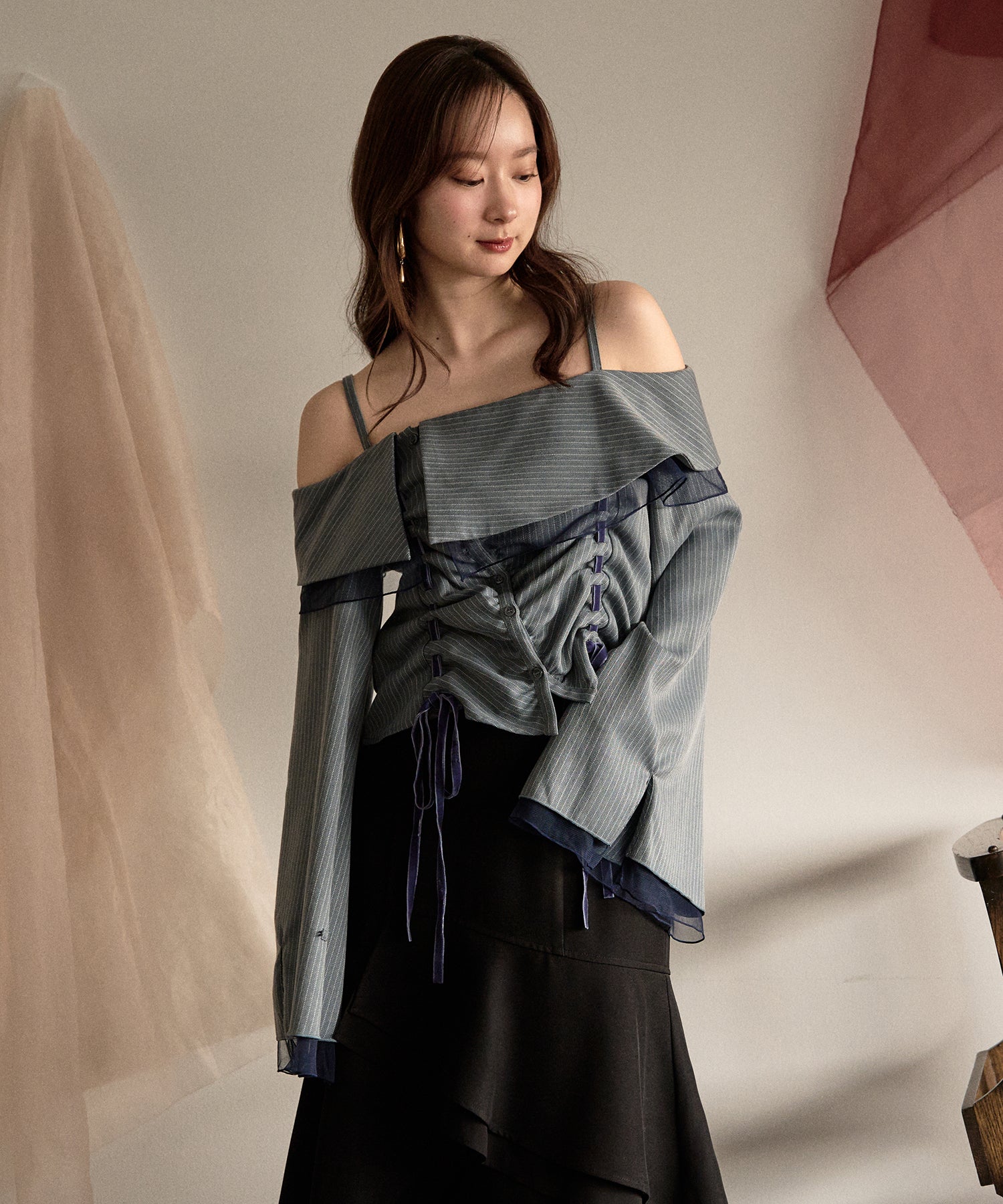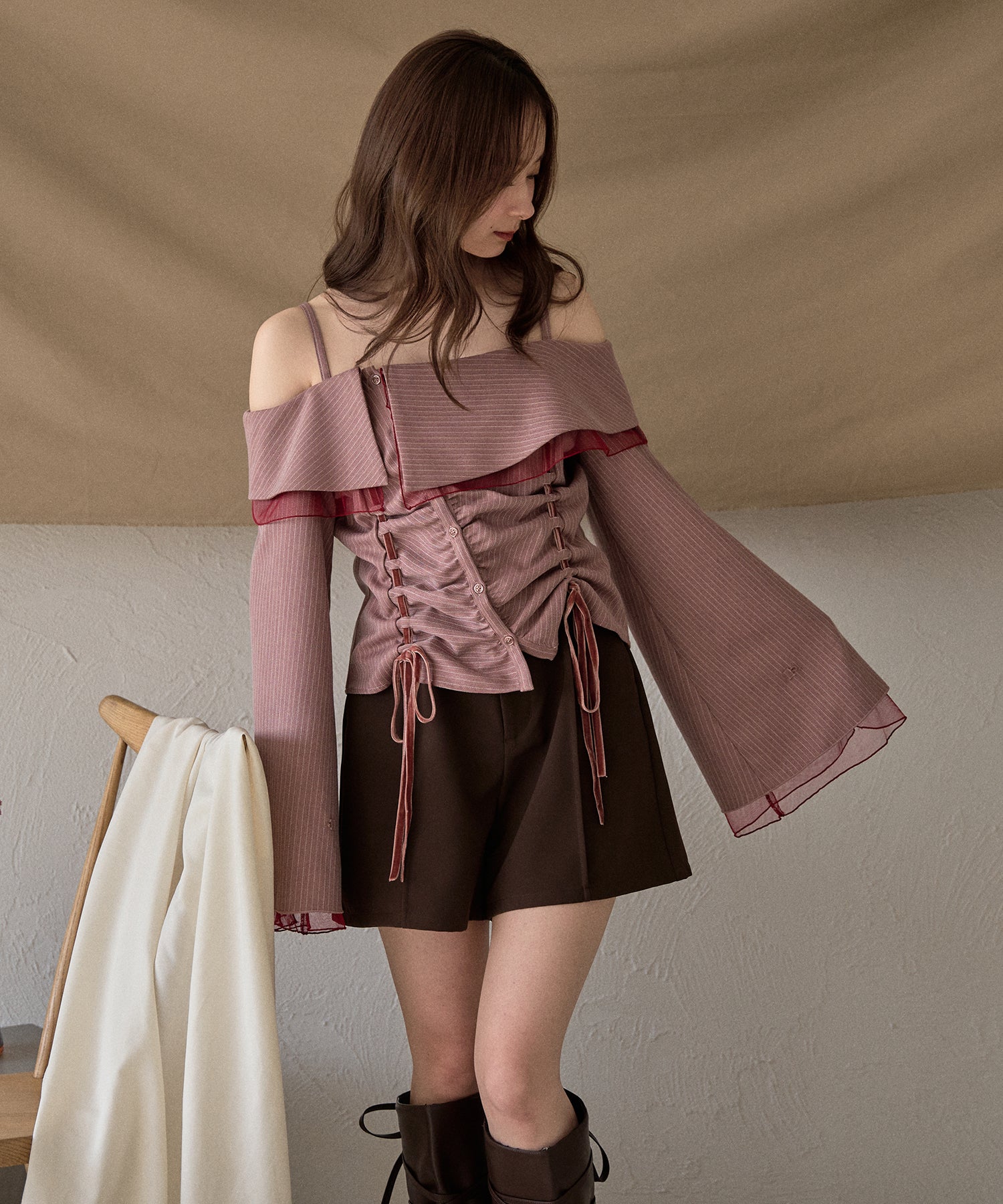 frill offshoulder stitch ribbon tops / フリルオフショルダーステッチリボントップス