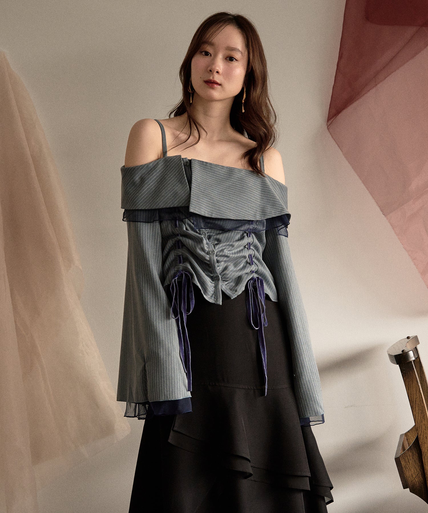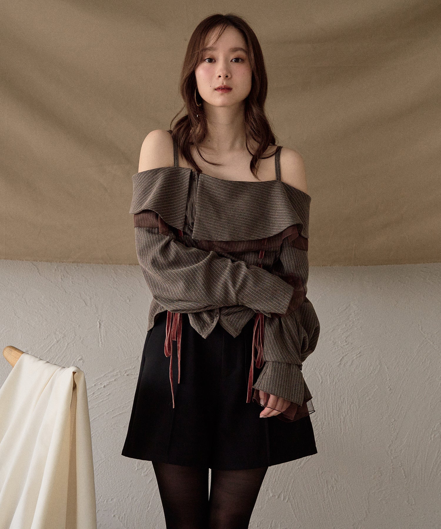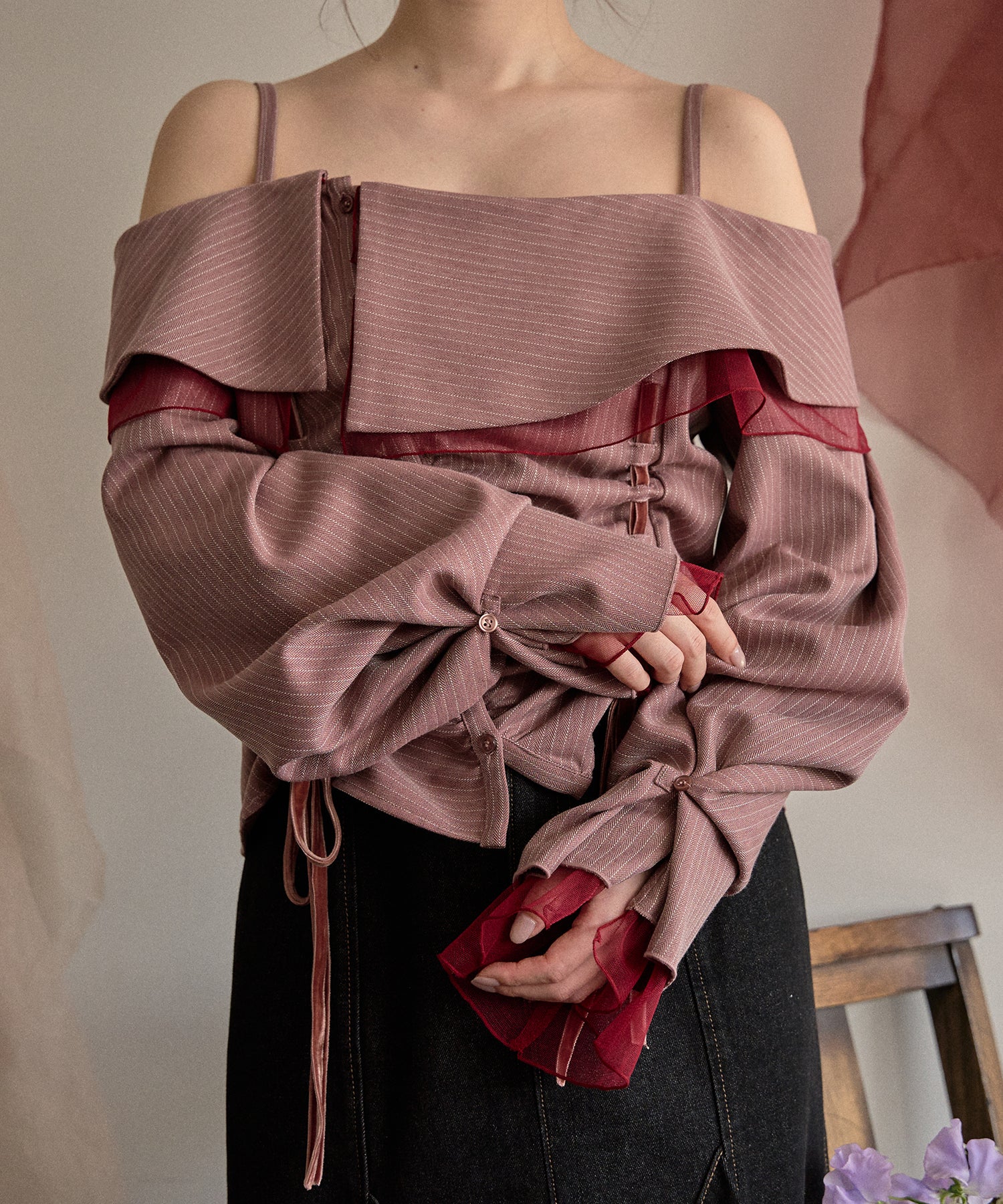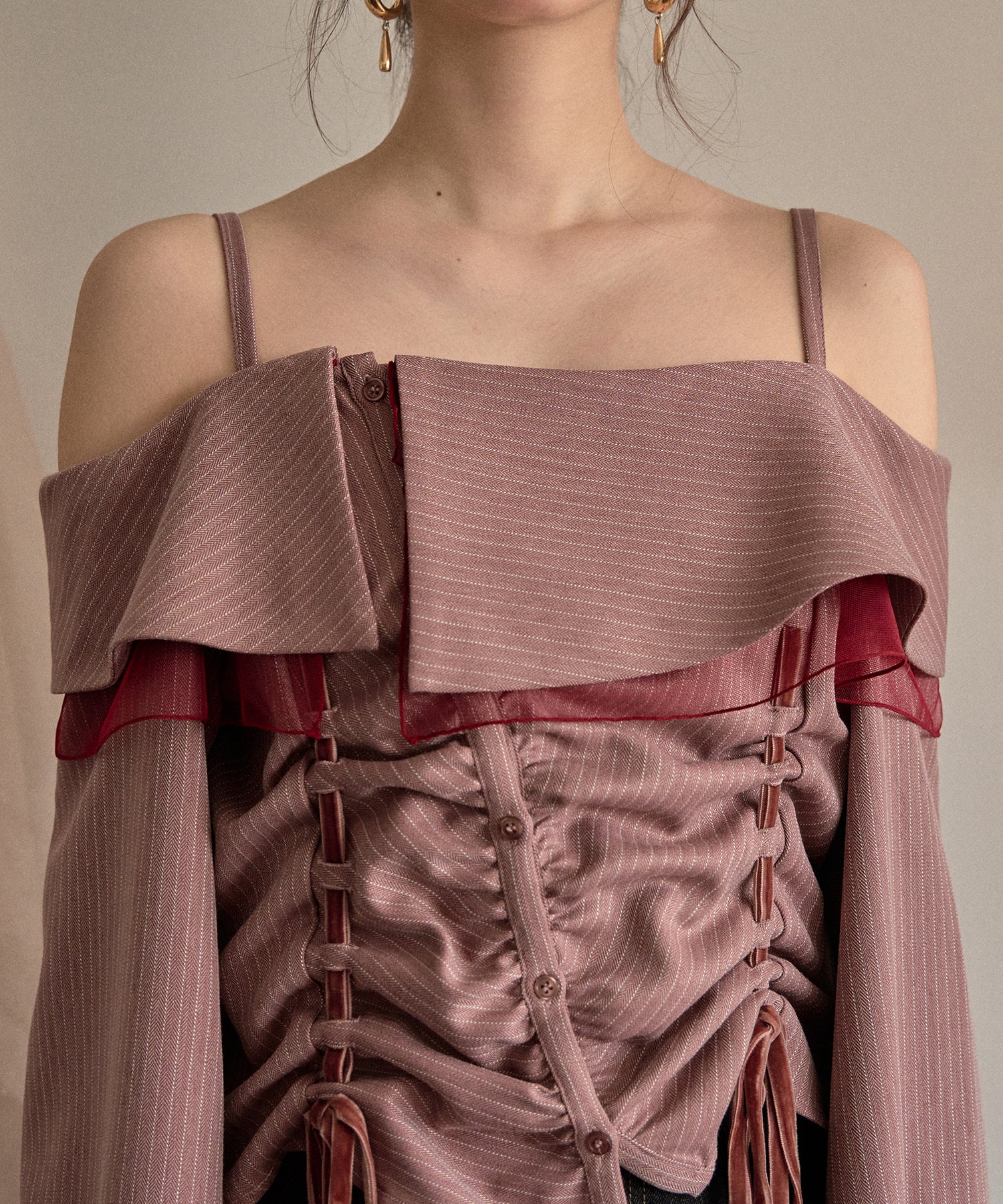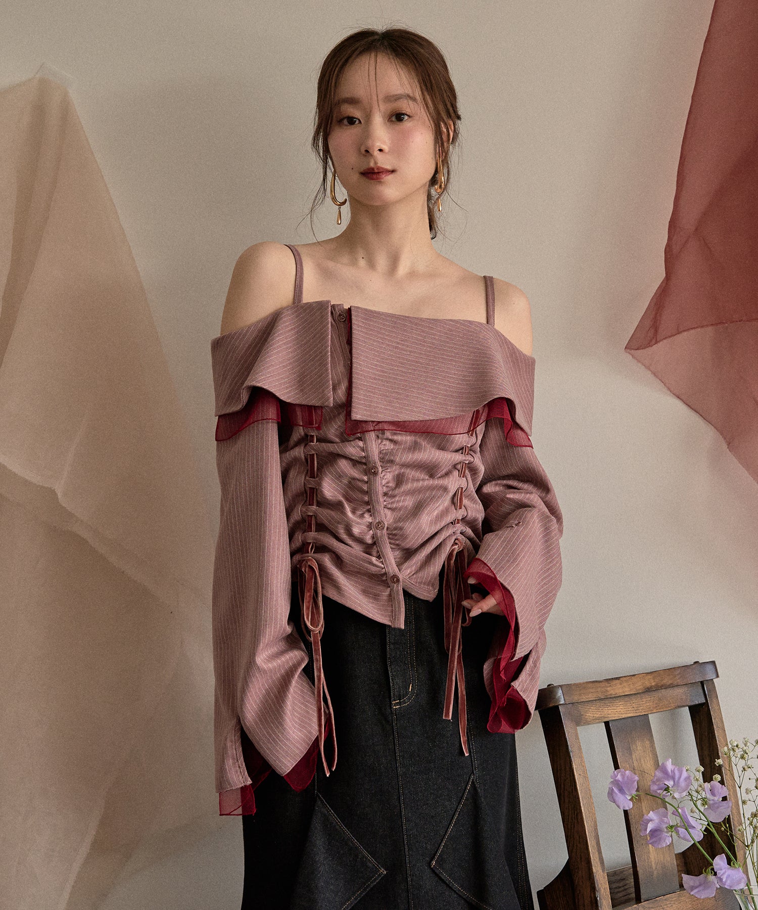 frill offshoulder stitch ribbon tops / フリルオフショルダーステッチリボントップス