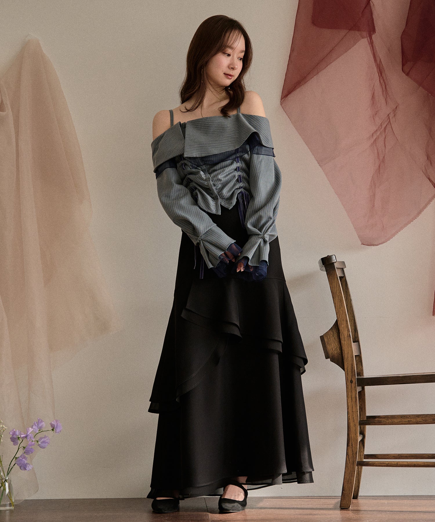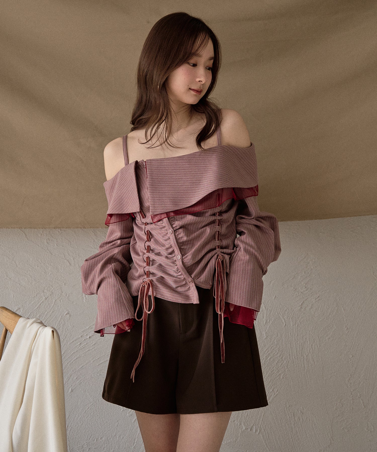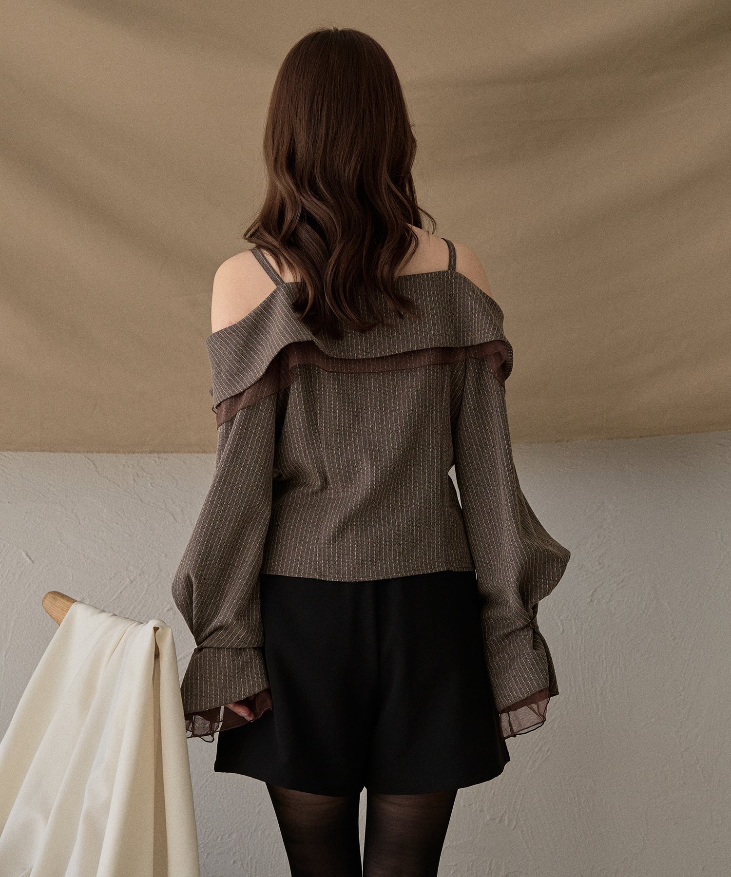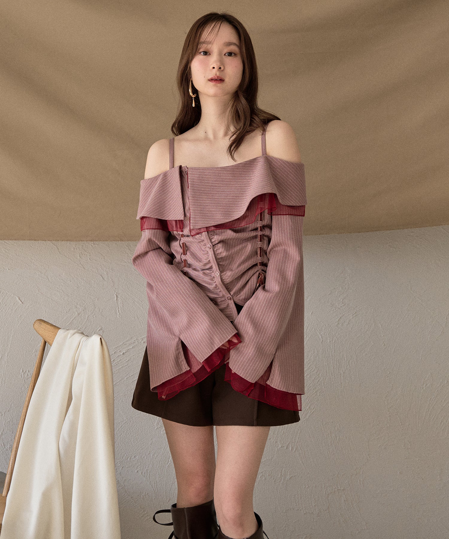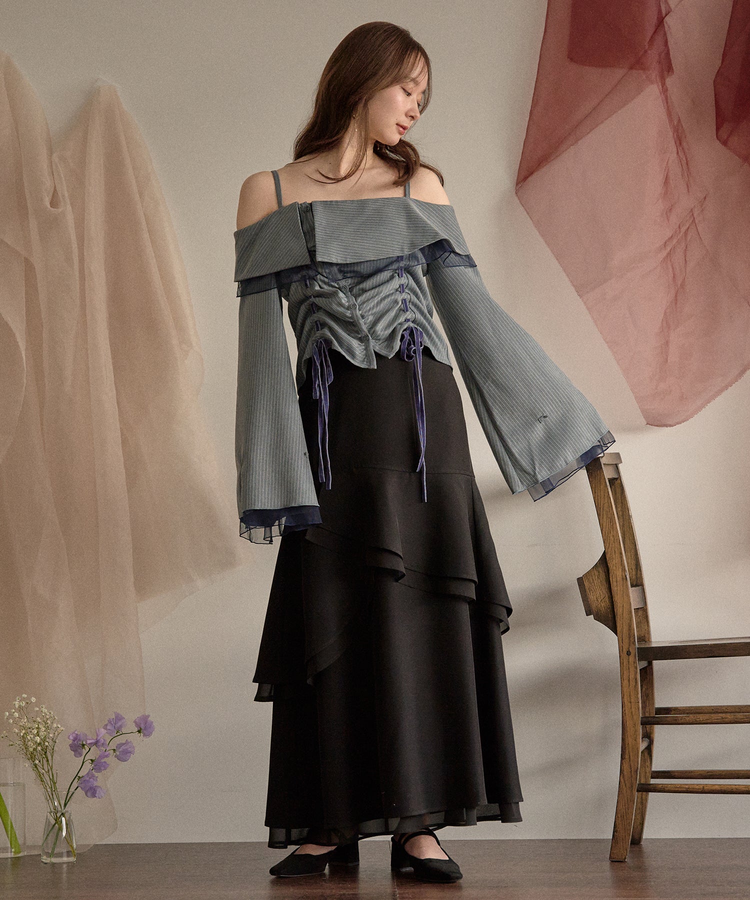 frill offshoulder stitch ribbon tops / フリルオフショルダーステッチリボントップス