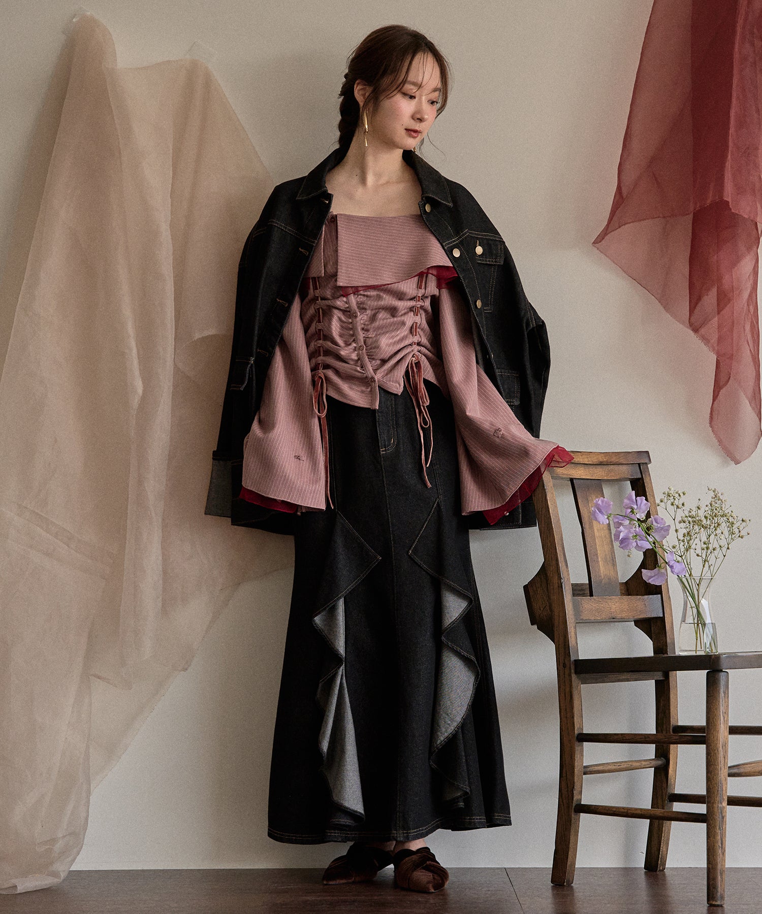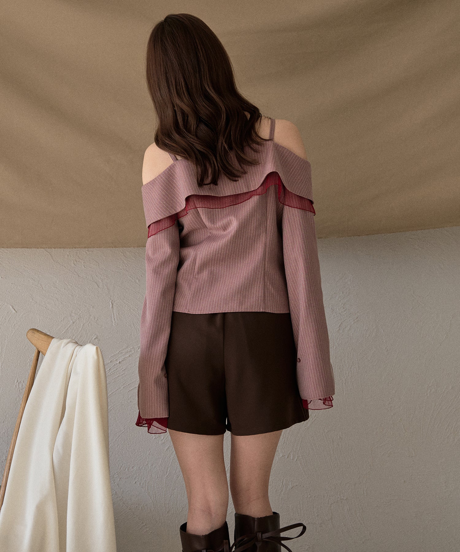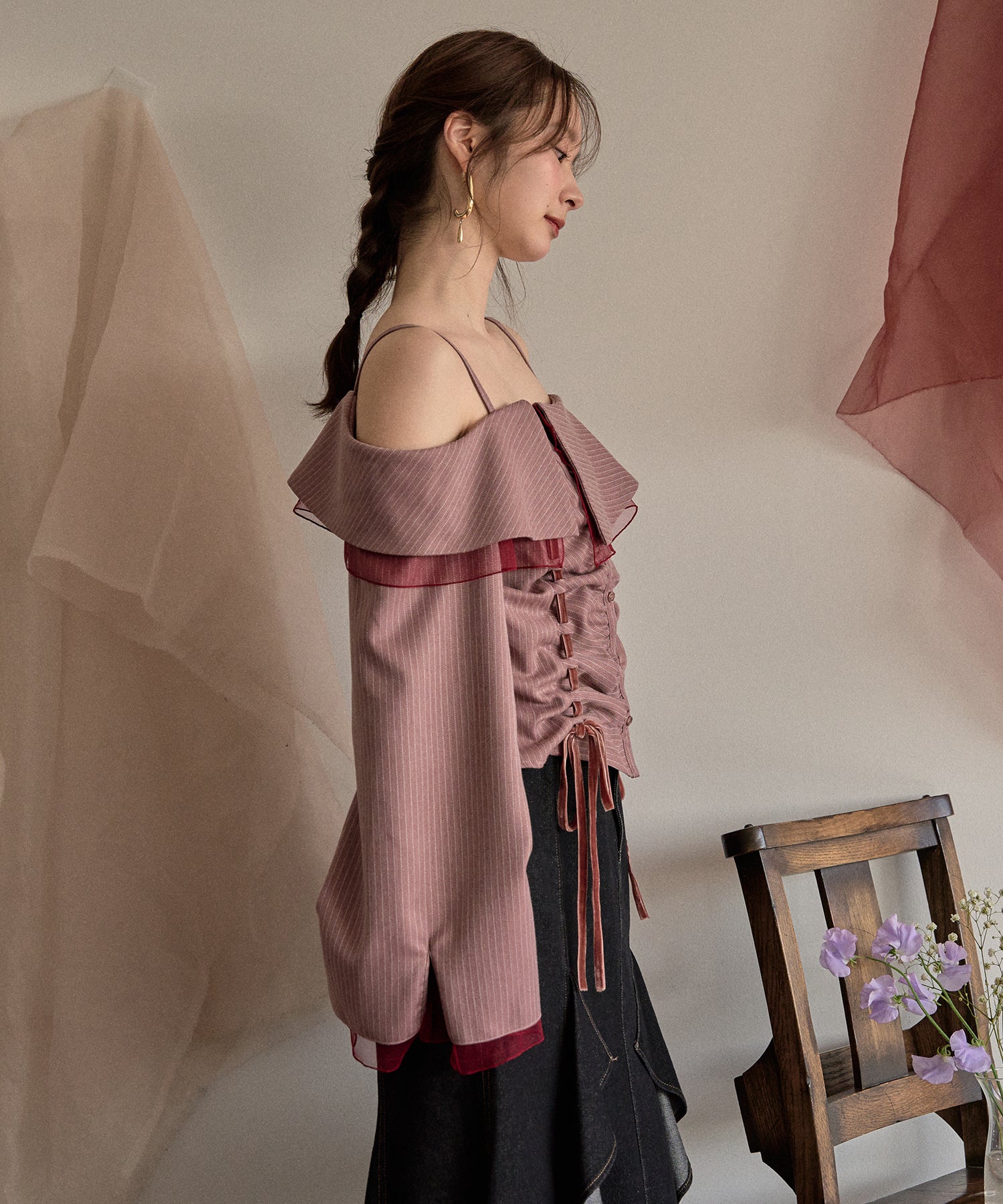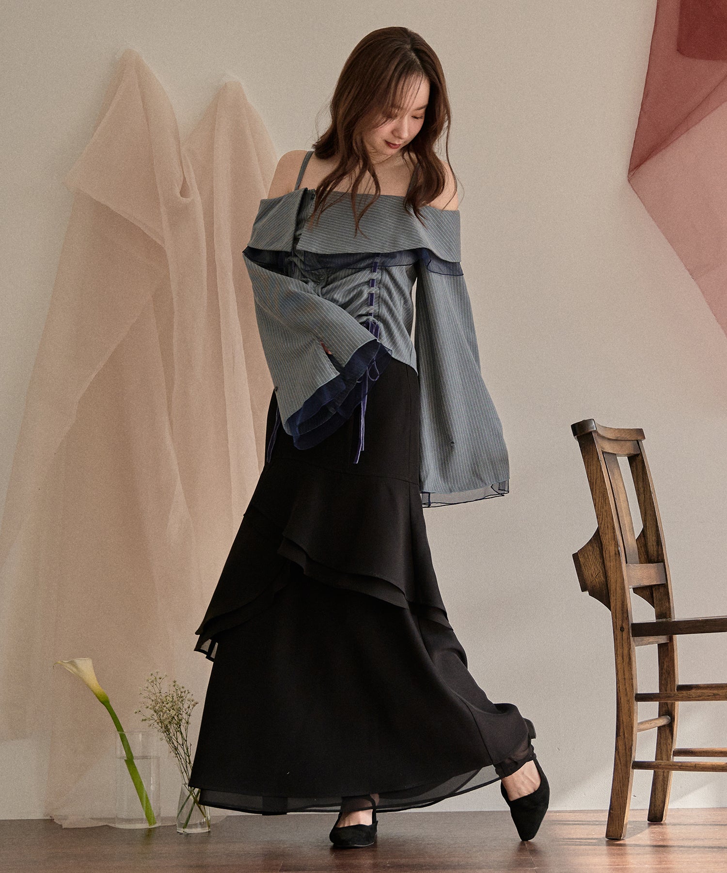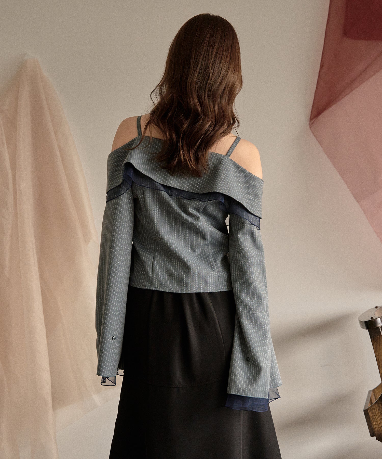 frill offshoulder stitch ribbon tops / フリルオフショルダーステッチリボントップス