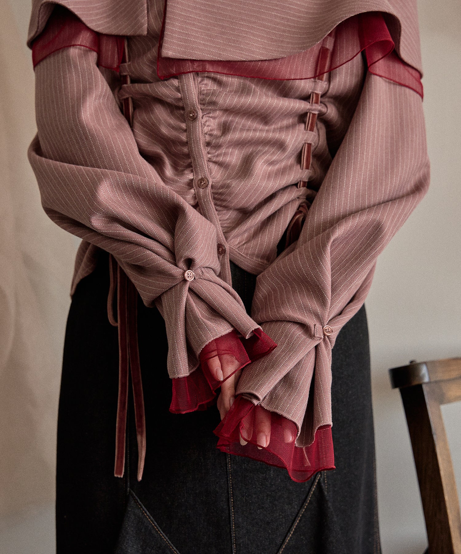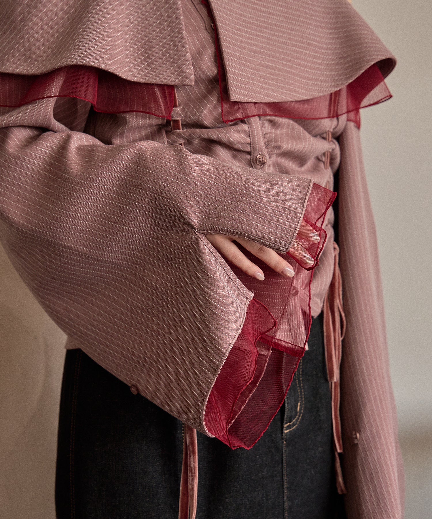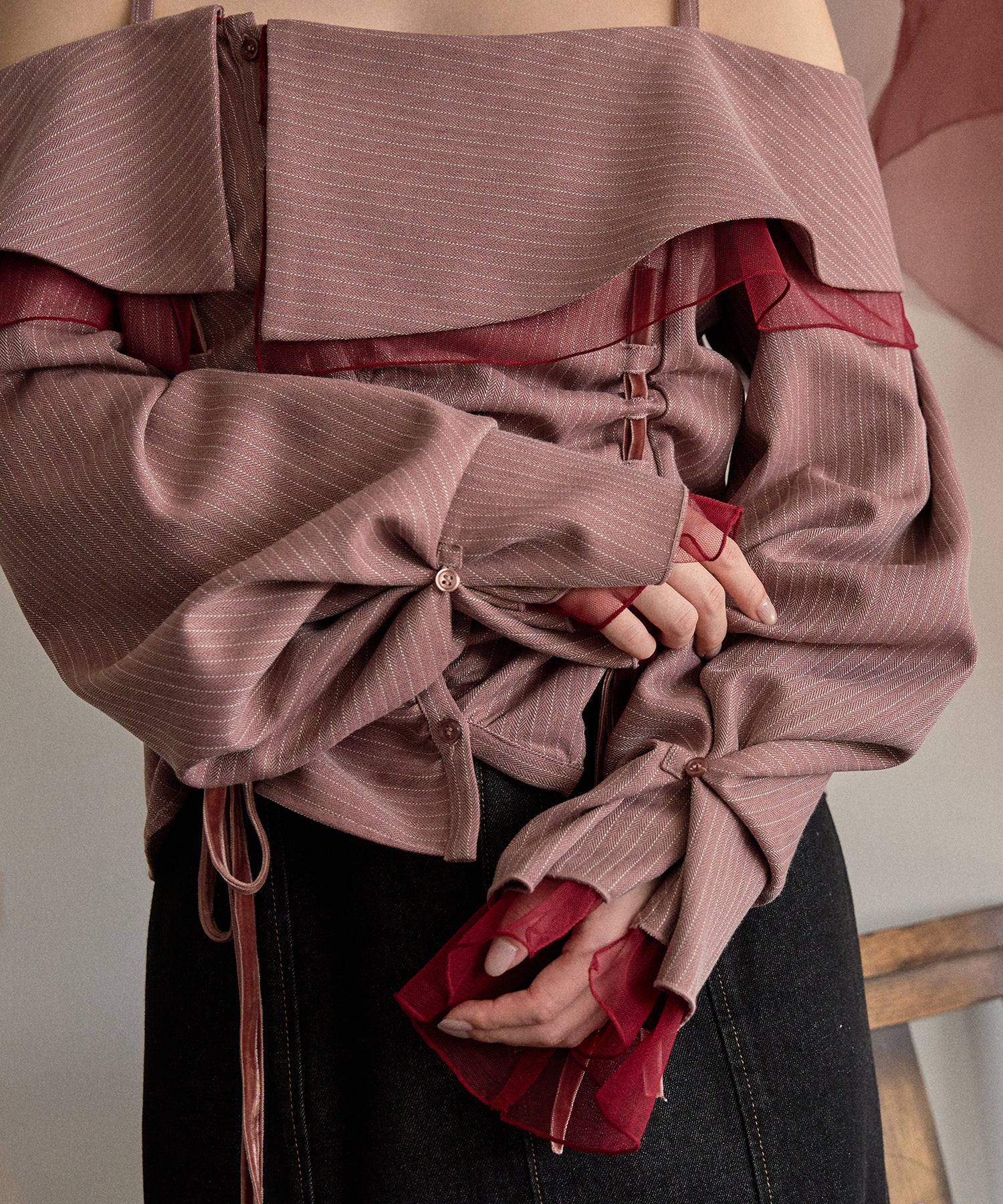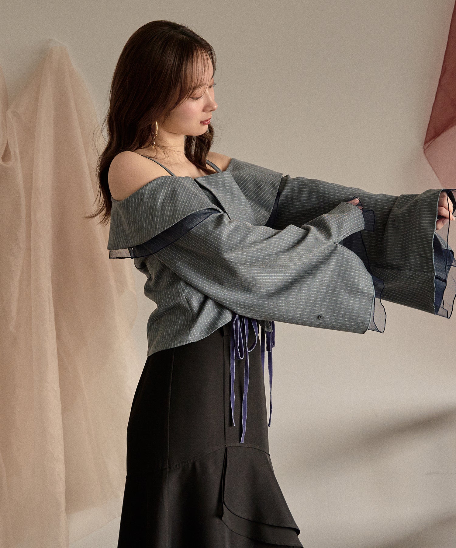 チュール素材とレイヤード風のボリューム袖にもフレア袖にもできるデザイン。