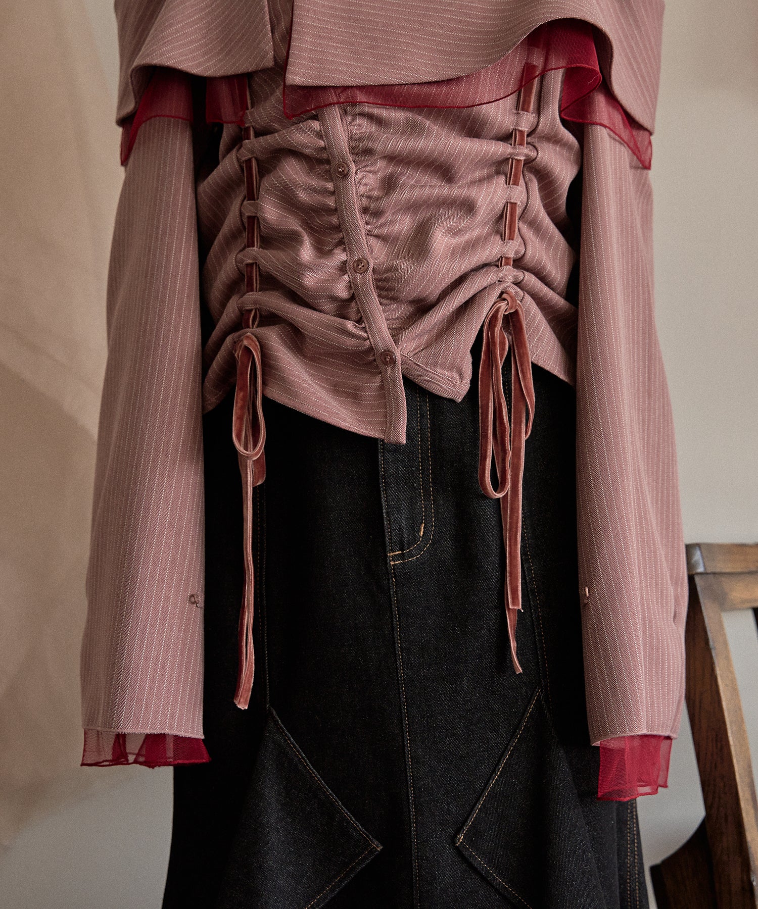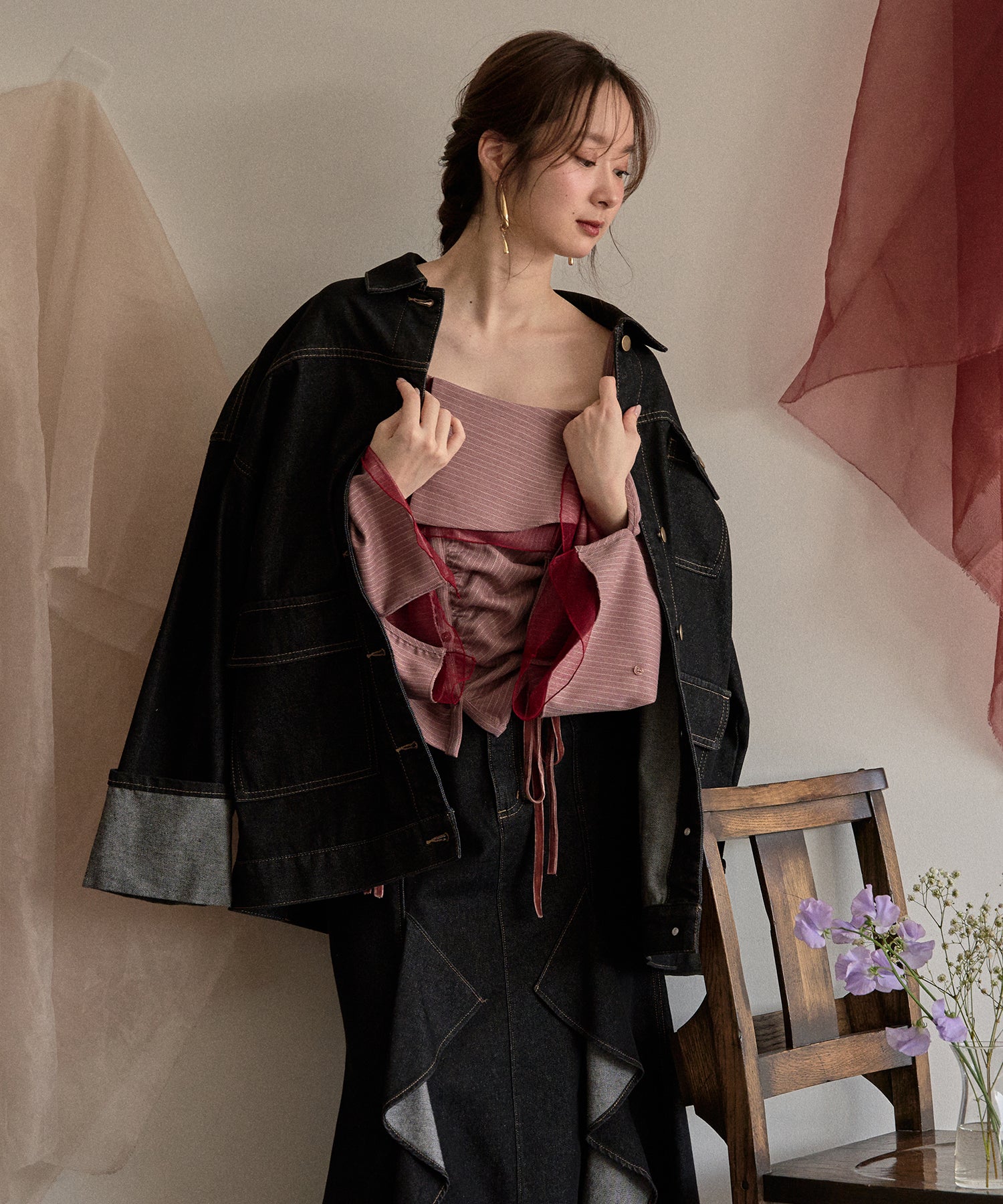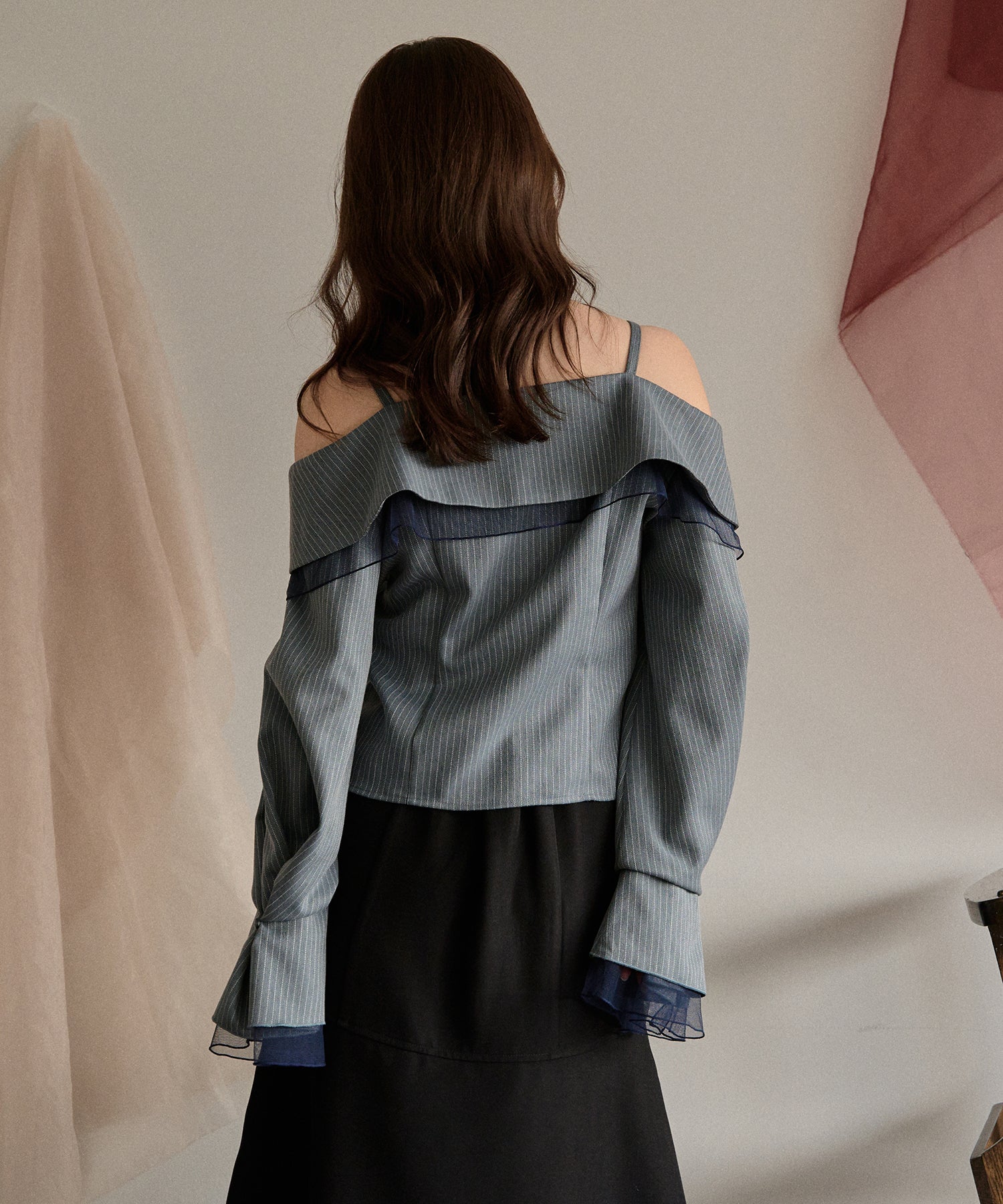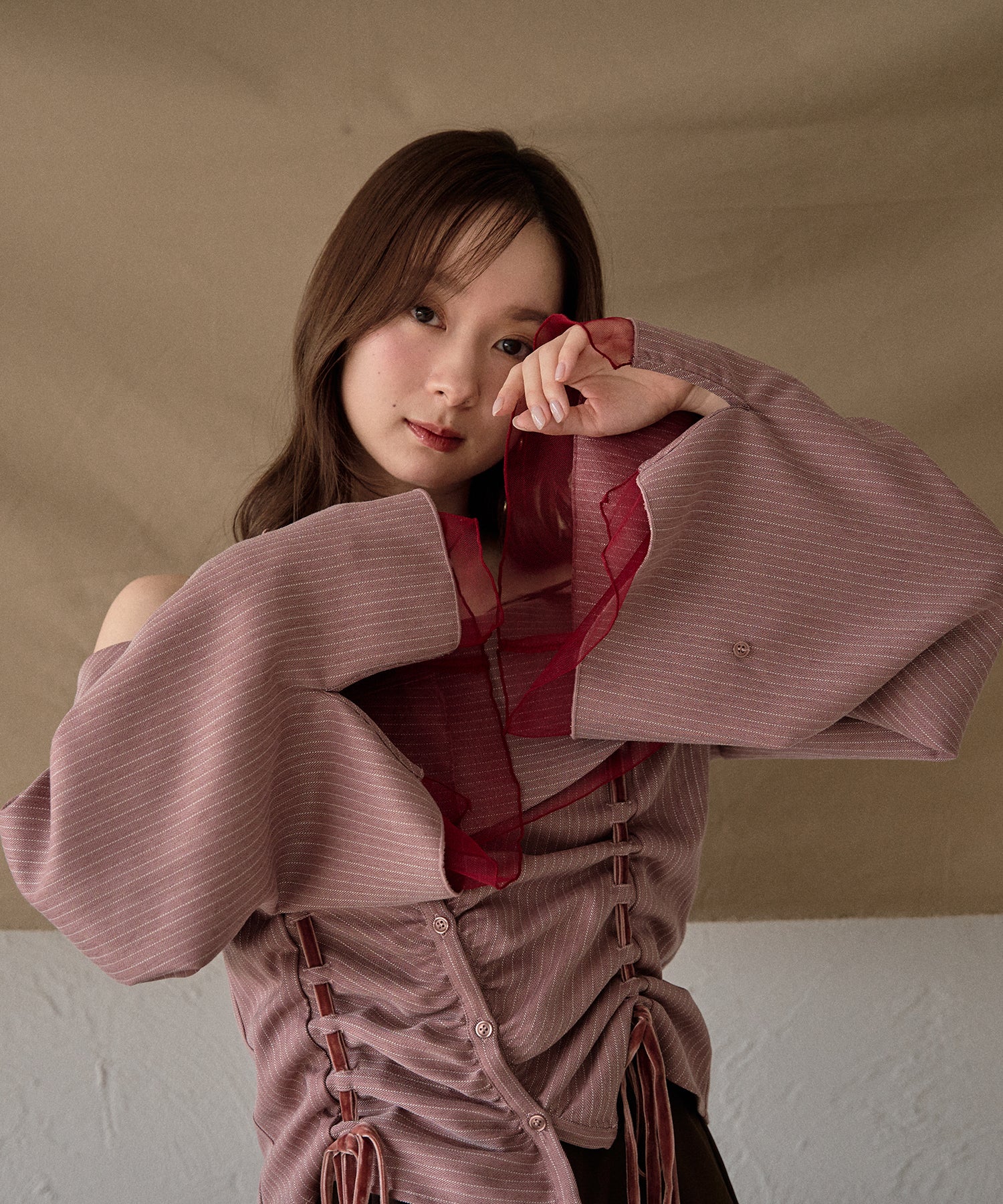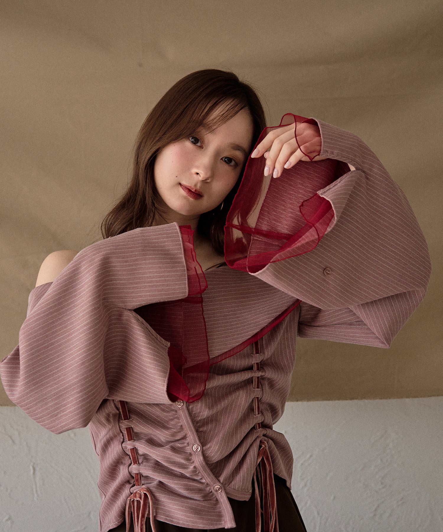チュール素材とレイヤード風のボリューム袖にもフレア袖にもできるデザイン。