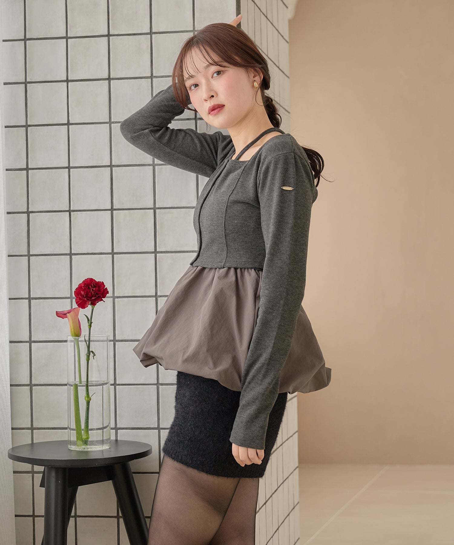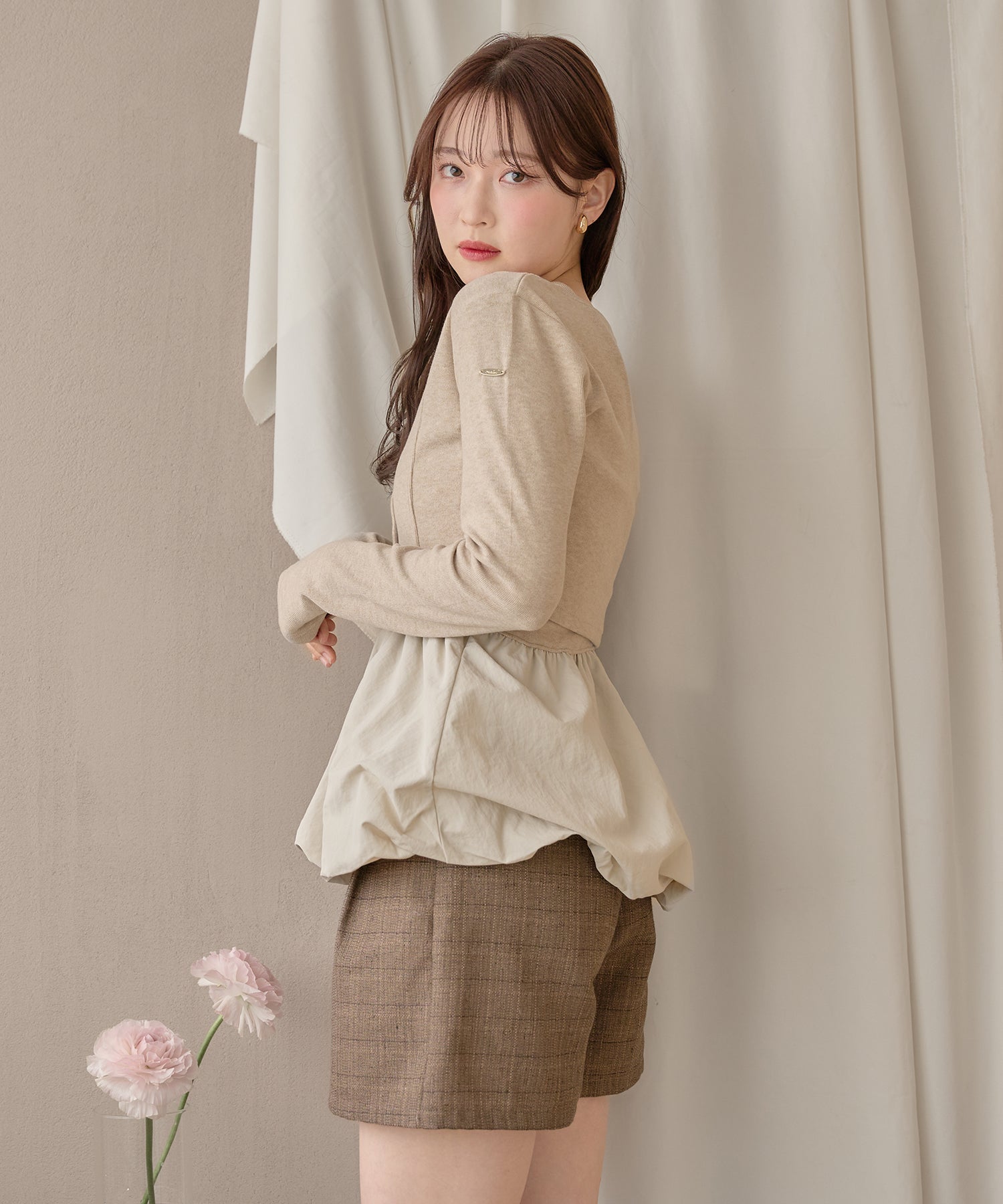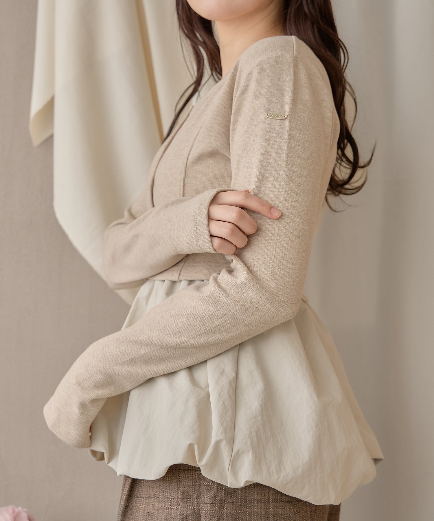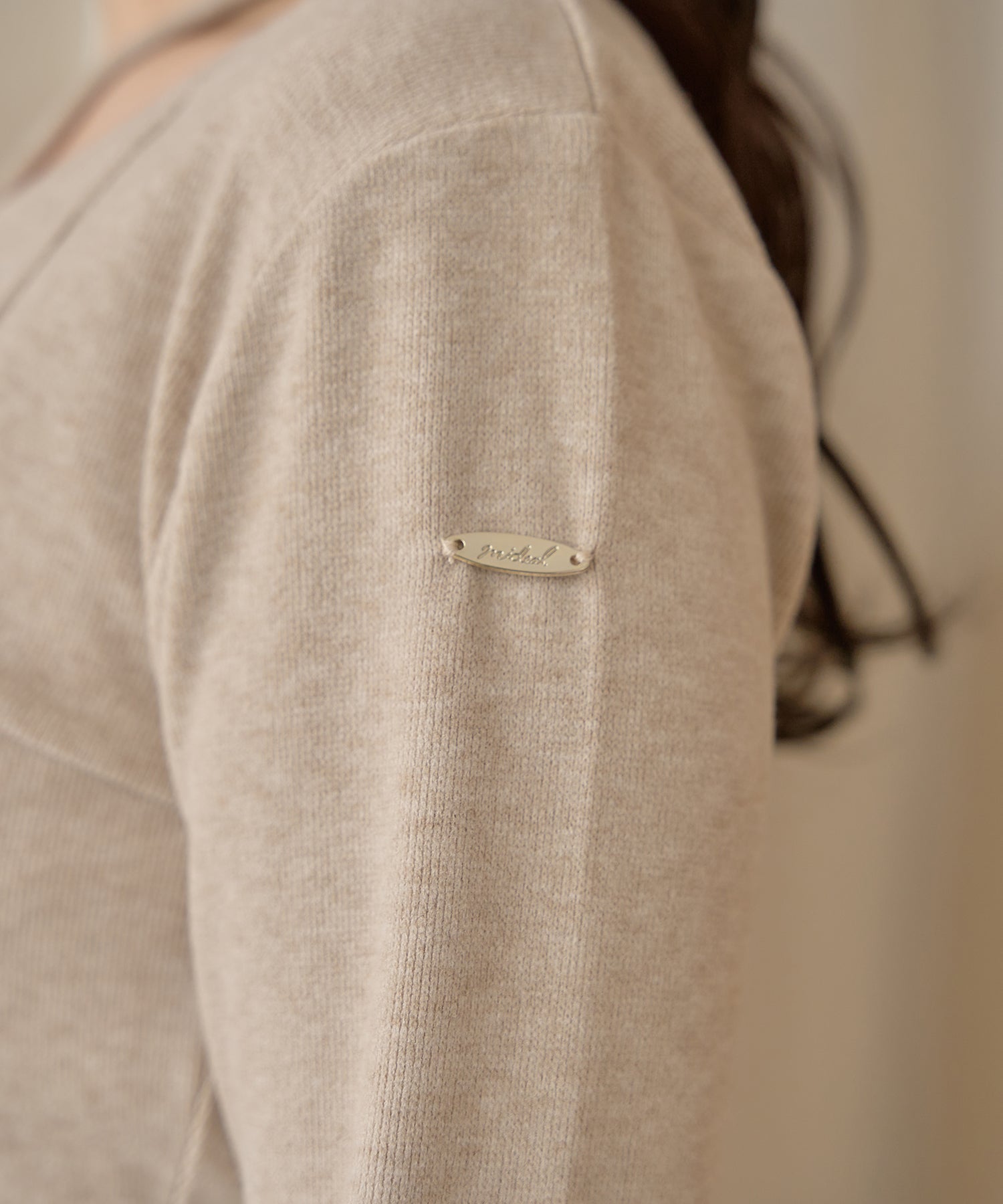 ショート丈のカーディガンが大人な印象を与え、左腕には ”mideal" のロゴプレート付き。