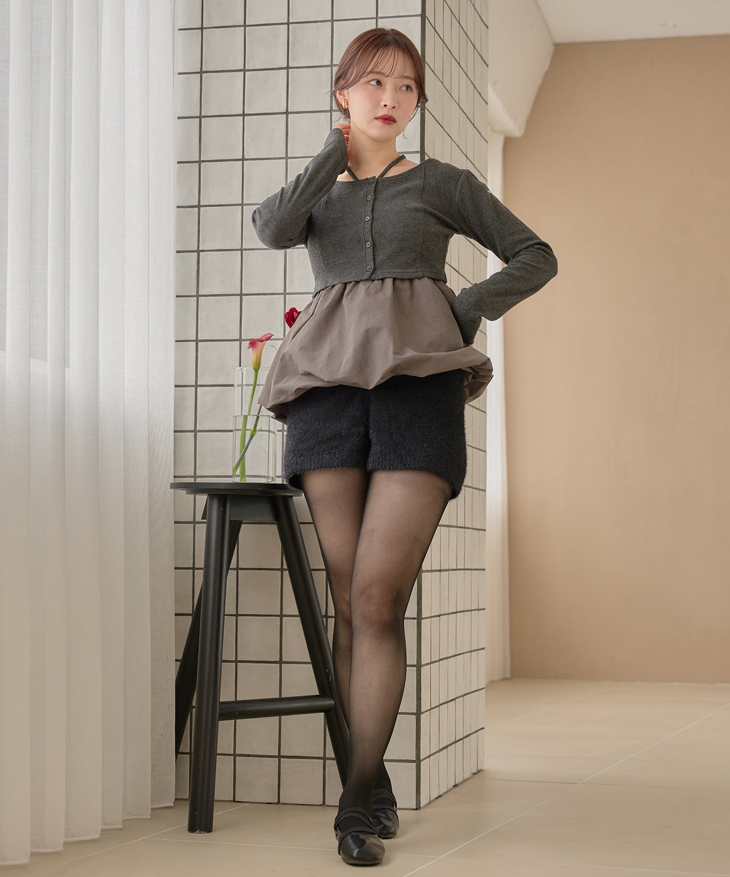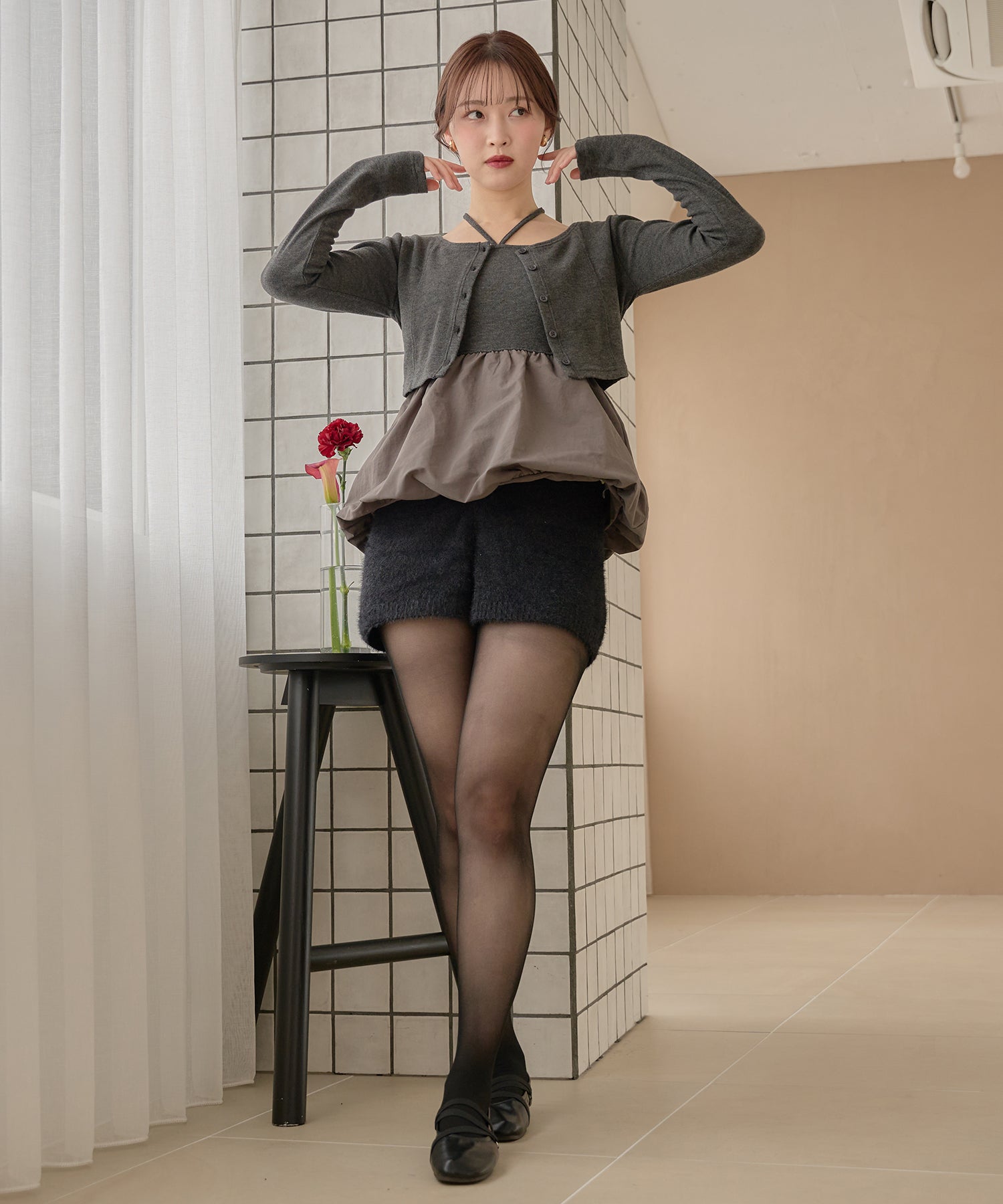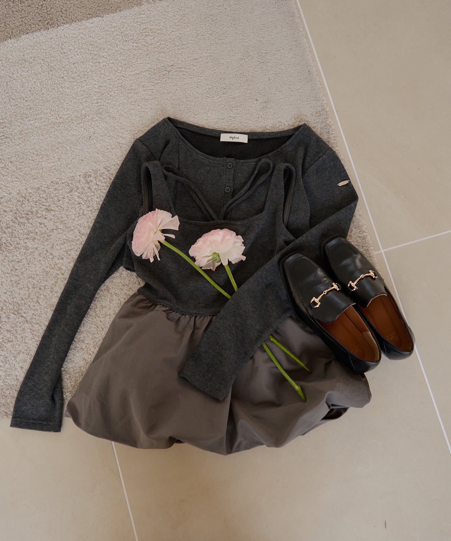 ショート丈のカーディガンが大人な印象を与え、左腕には ”mideal" のロゴプレート付き。