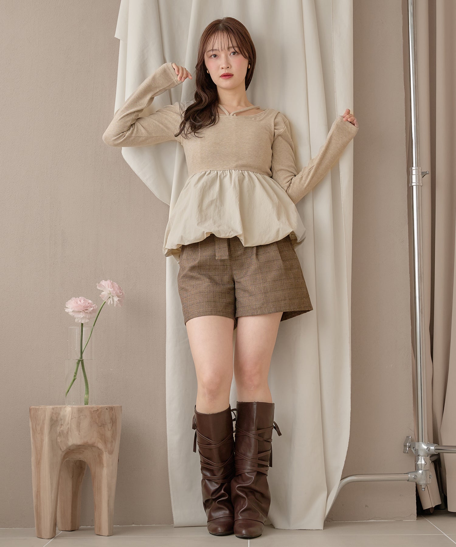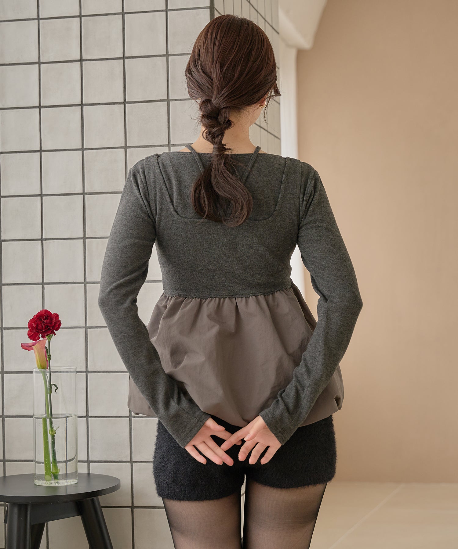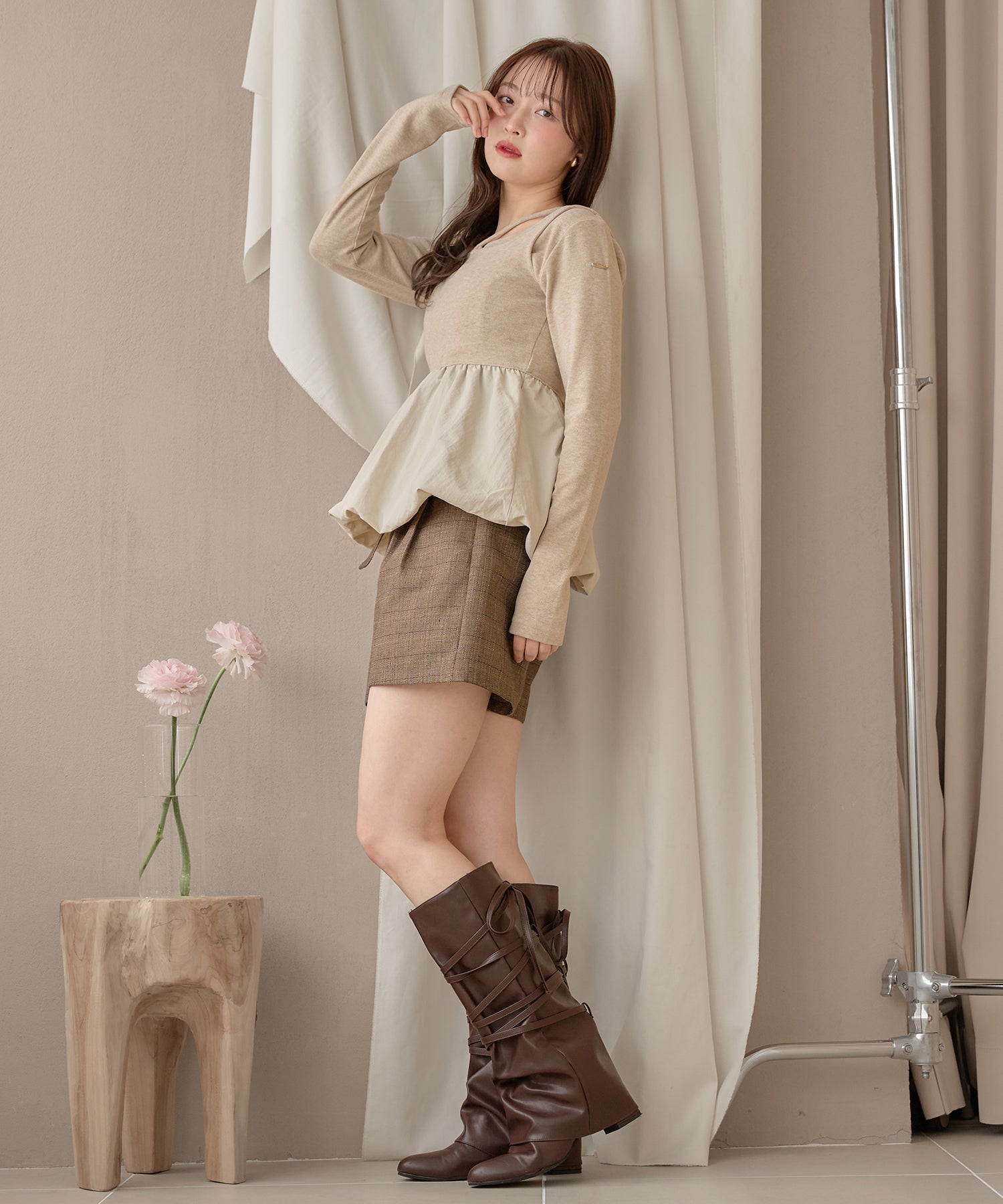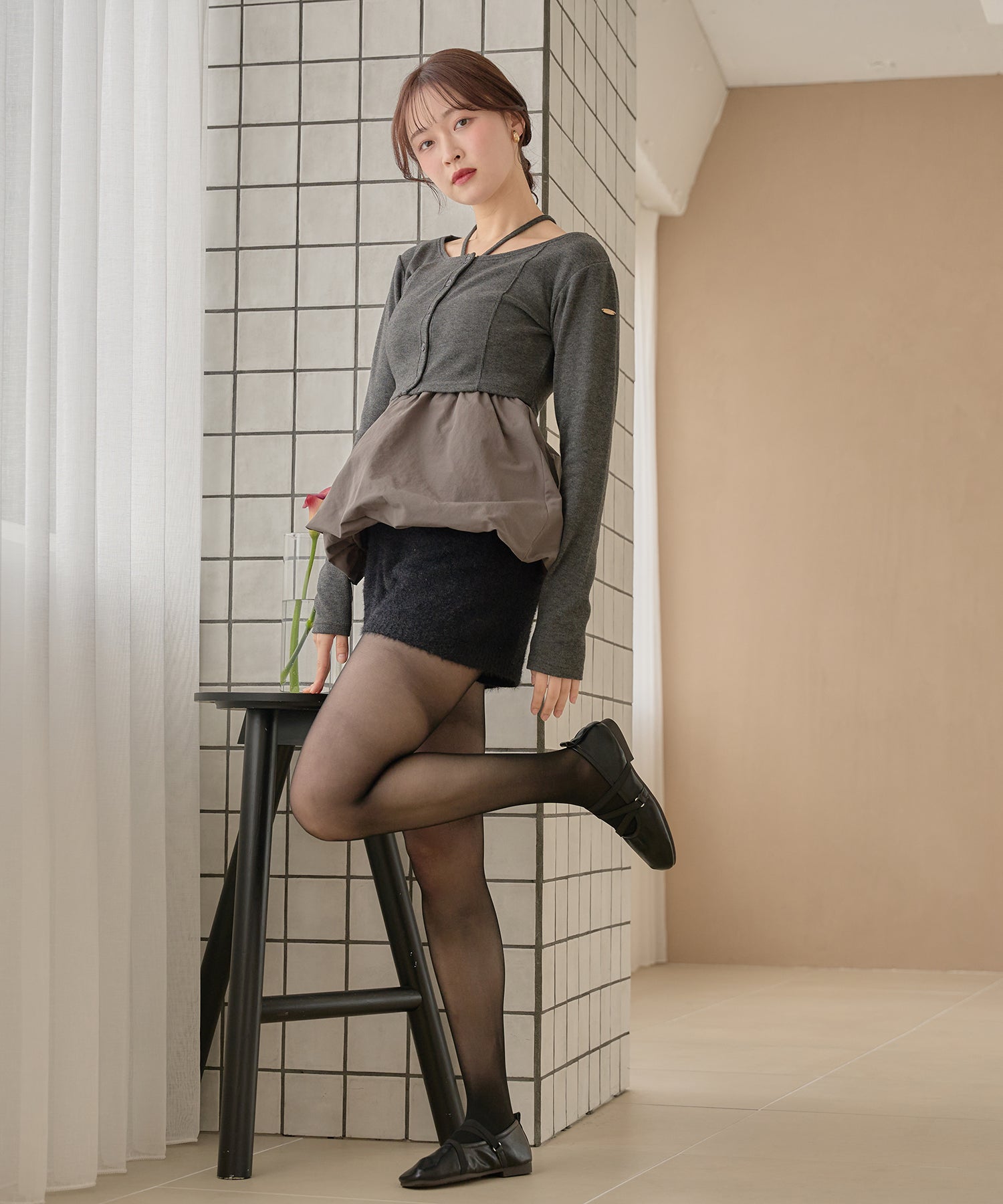 ショート丈のカーディガンが大人な印象を与え、左腕には ”mideal" のロゴプレート付き。