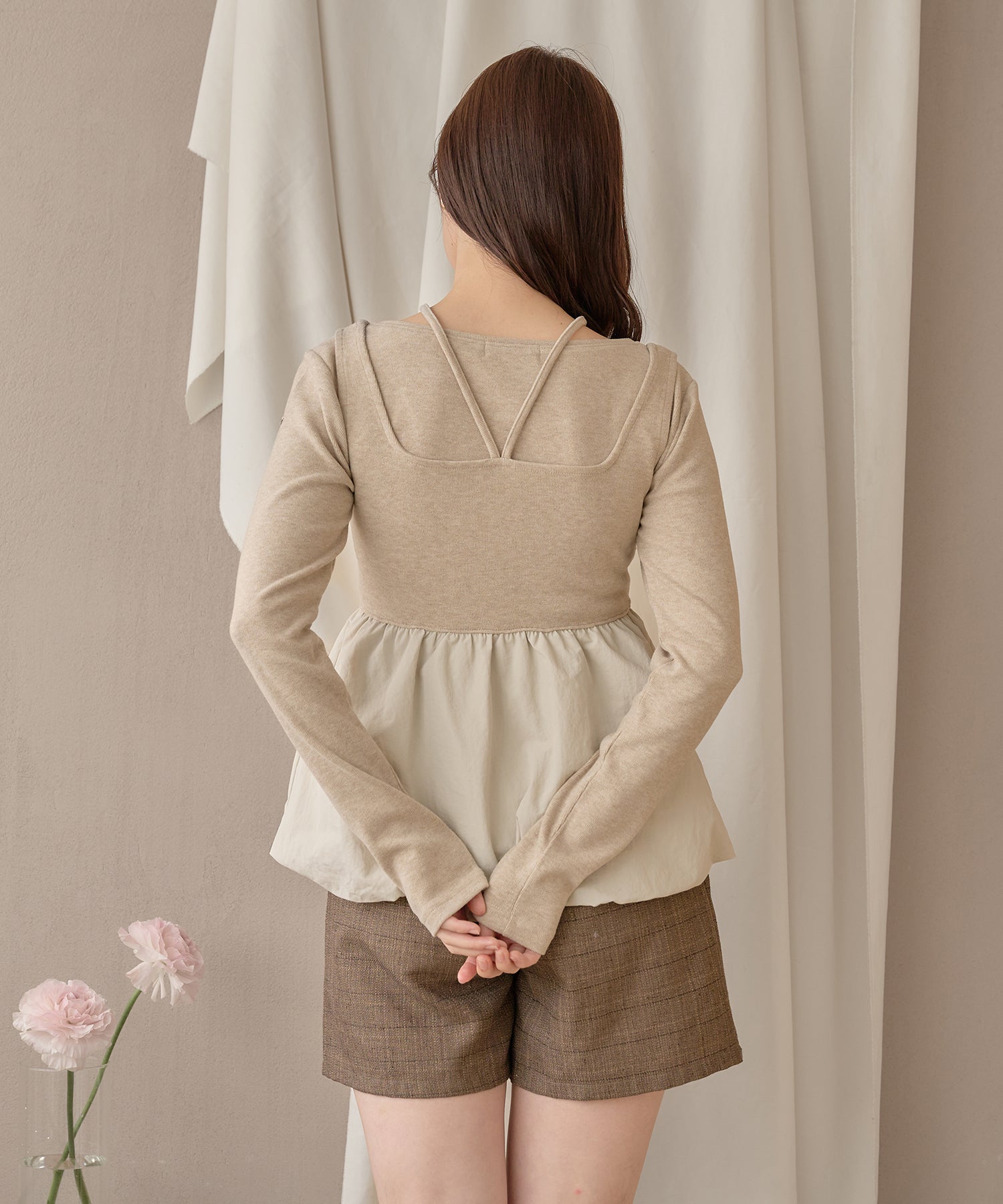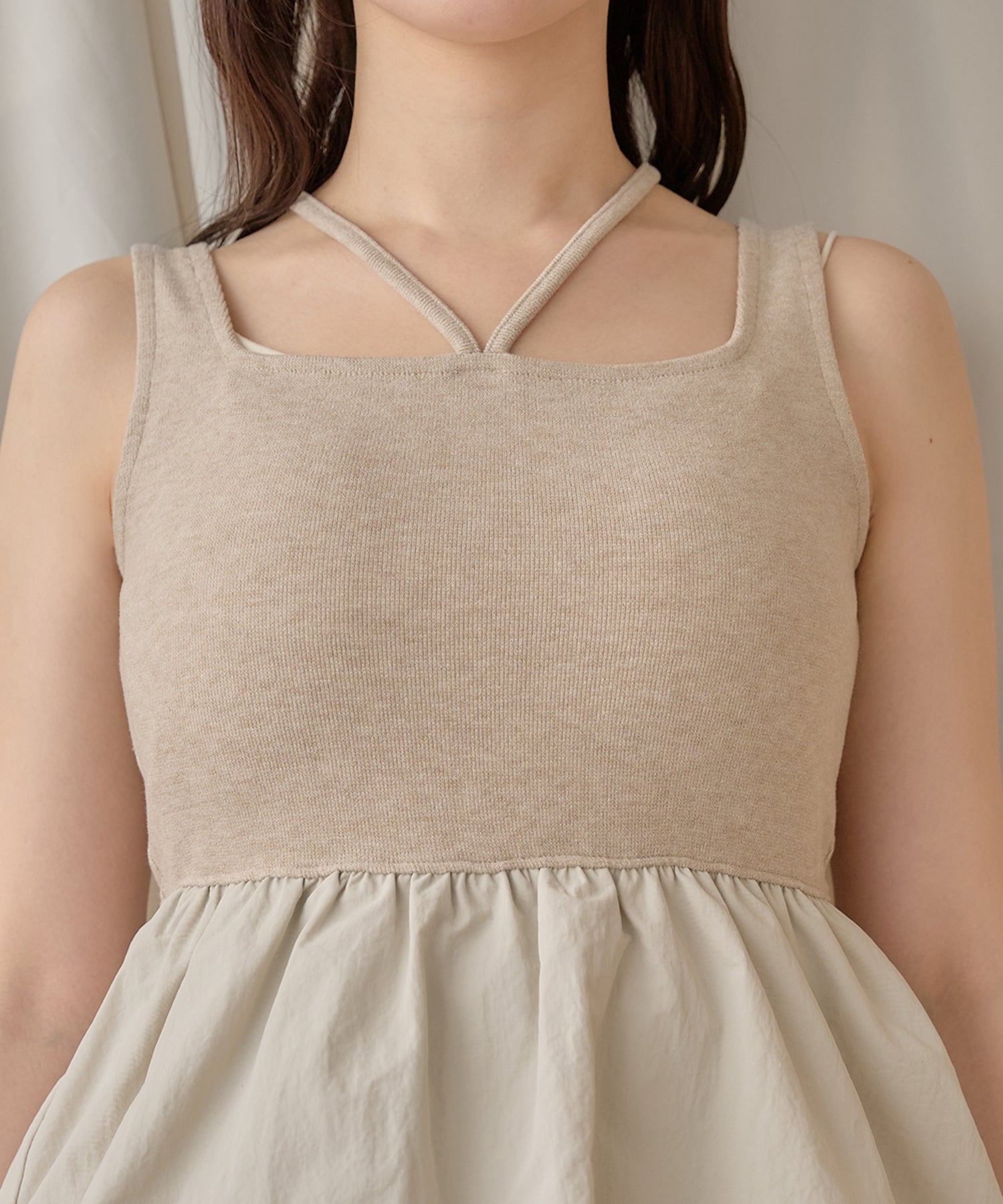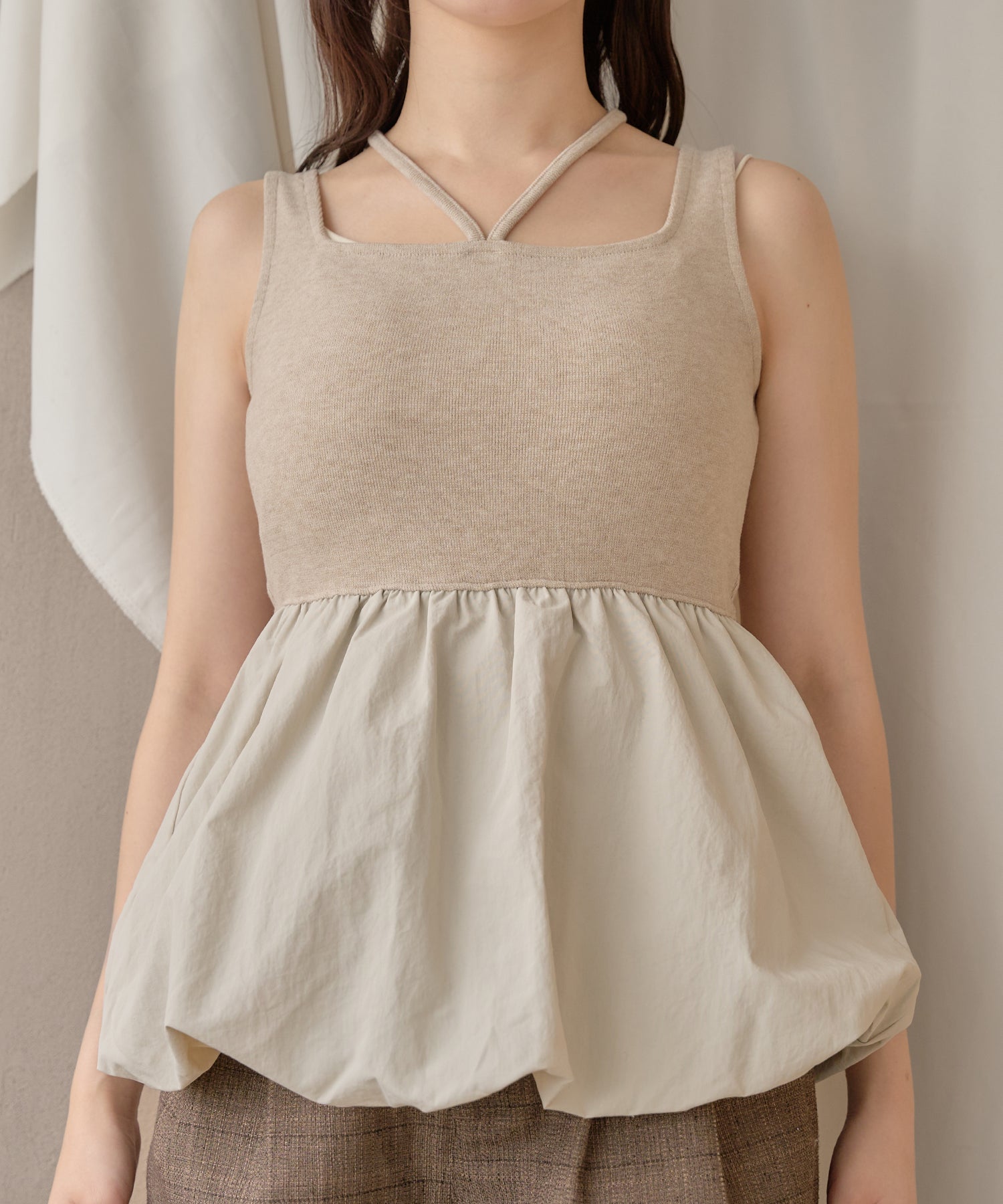 バルーンがドッキングされたVネックのキャミペプラムキャミ付きアンサンブル。