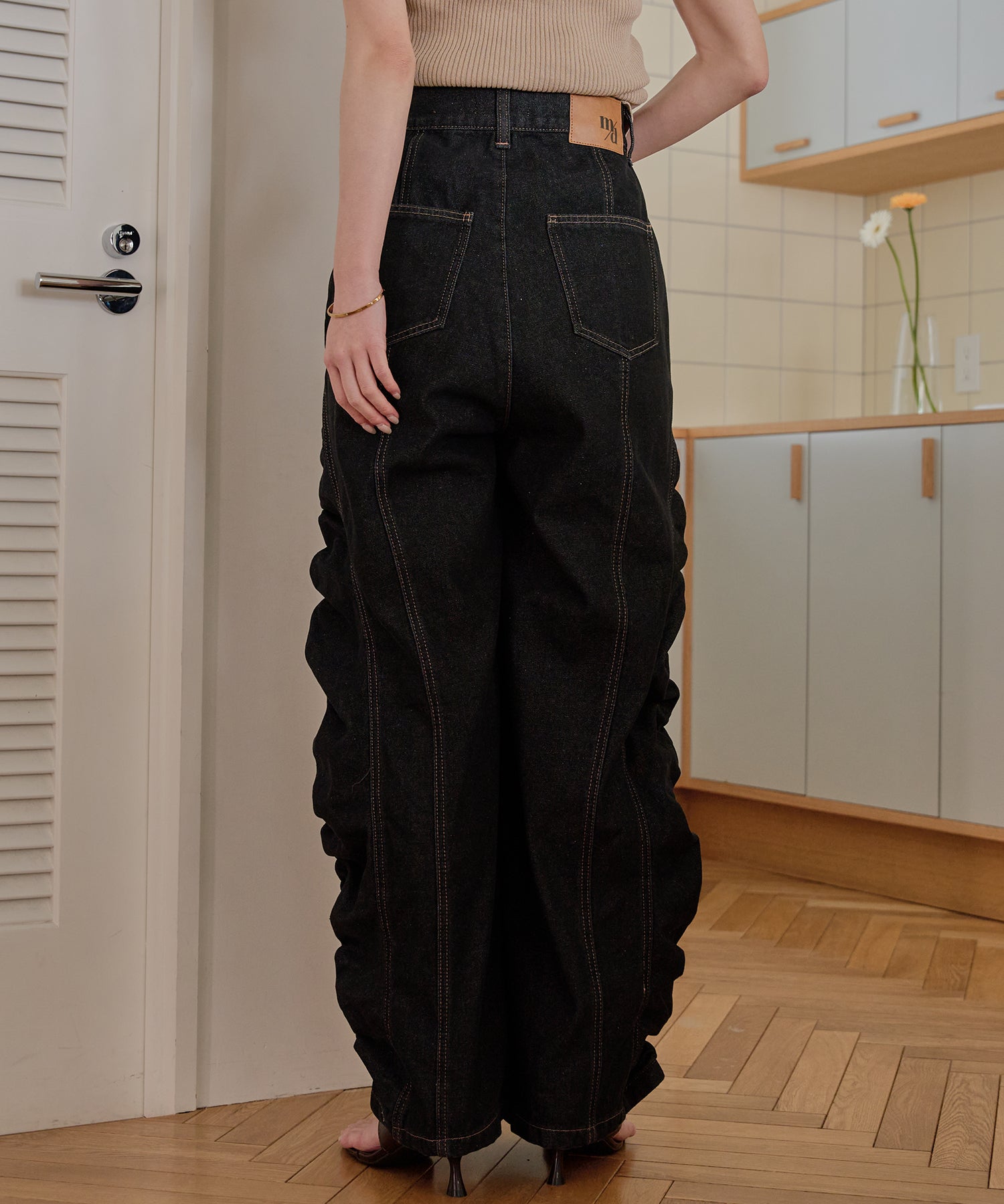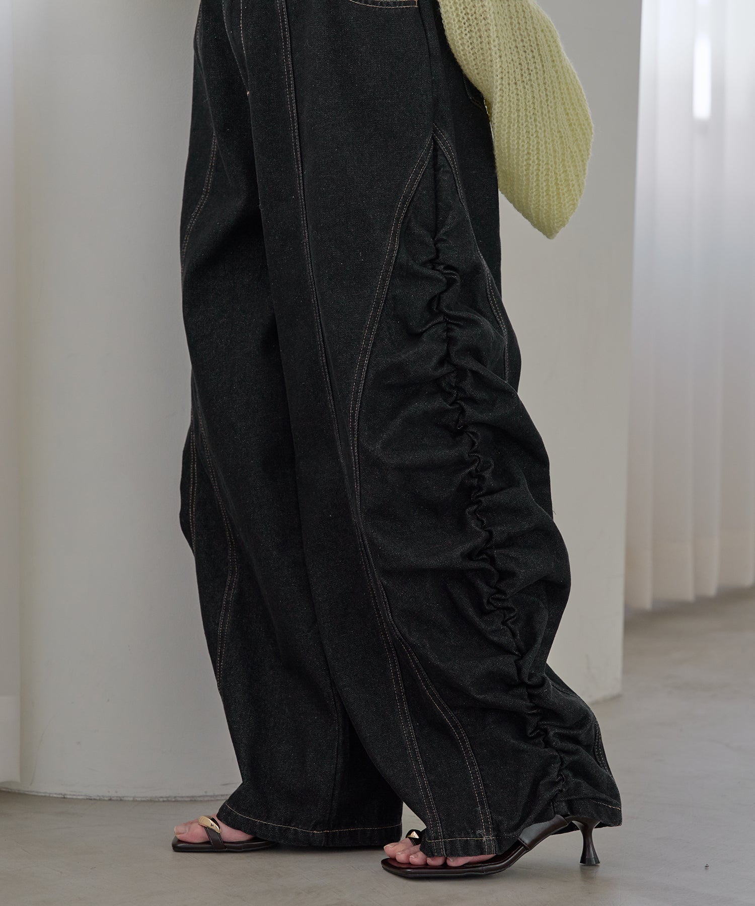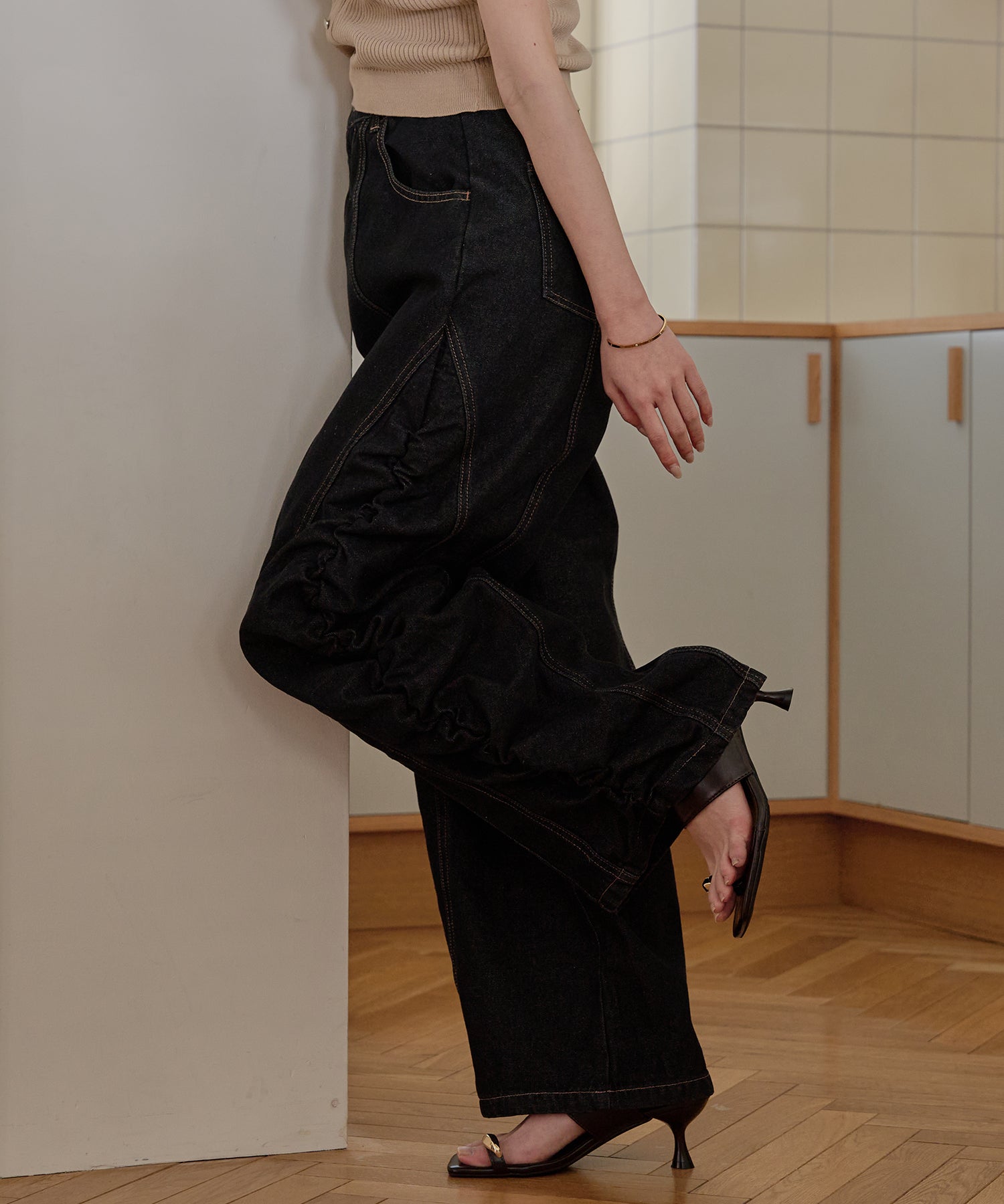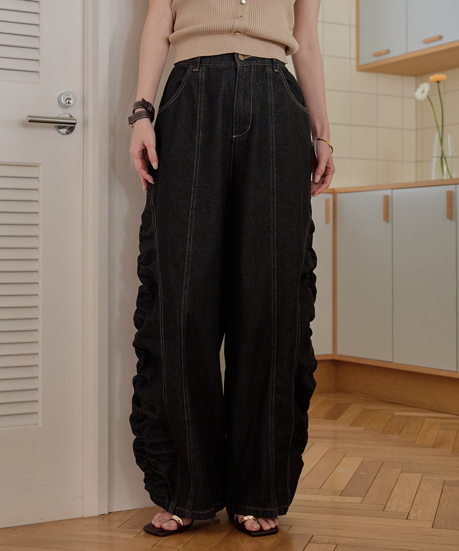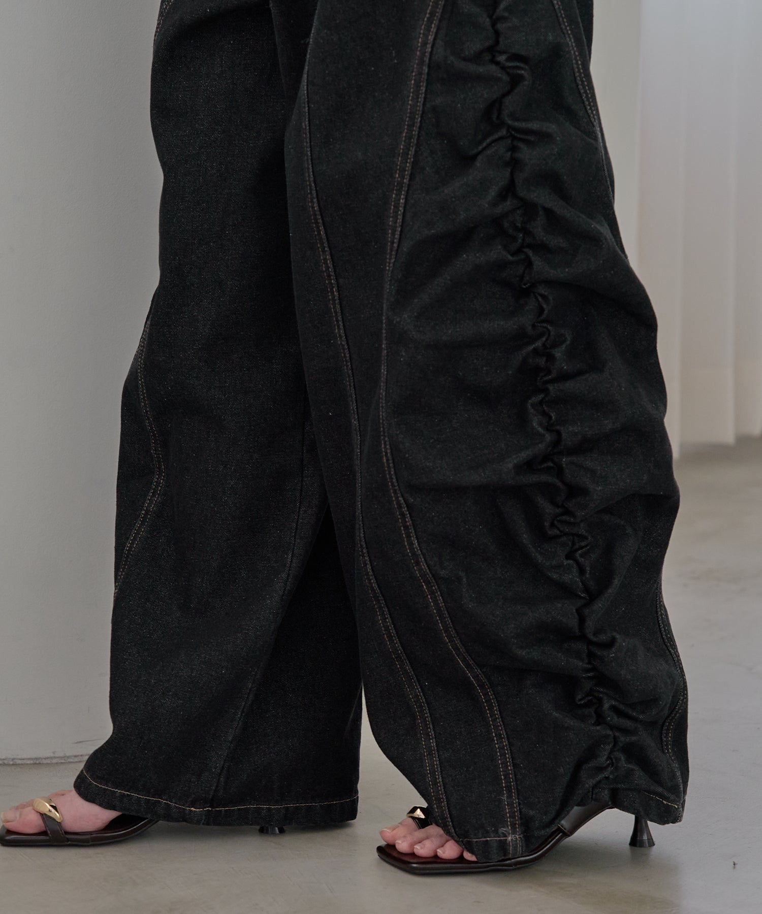 ギャザー×カーブの他にないデニムパンツです。