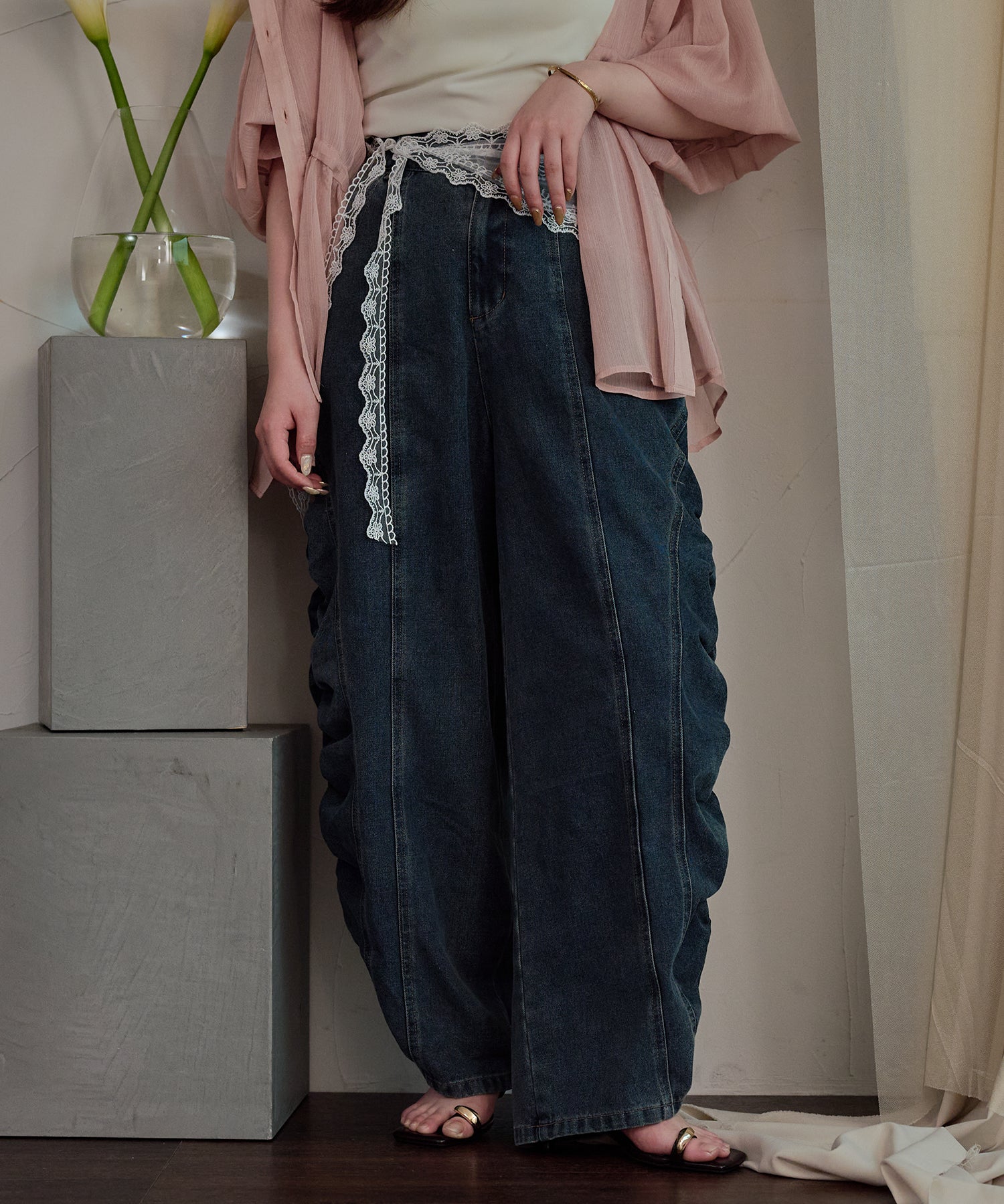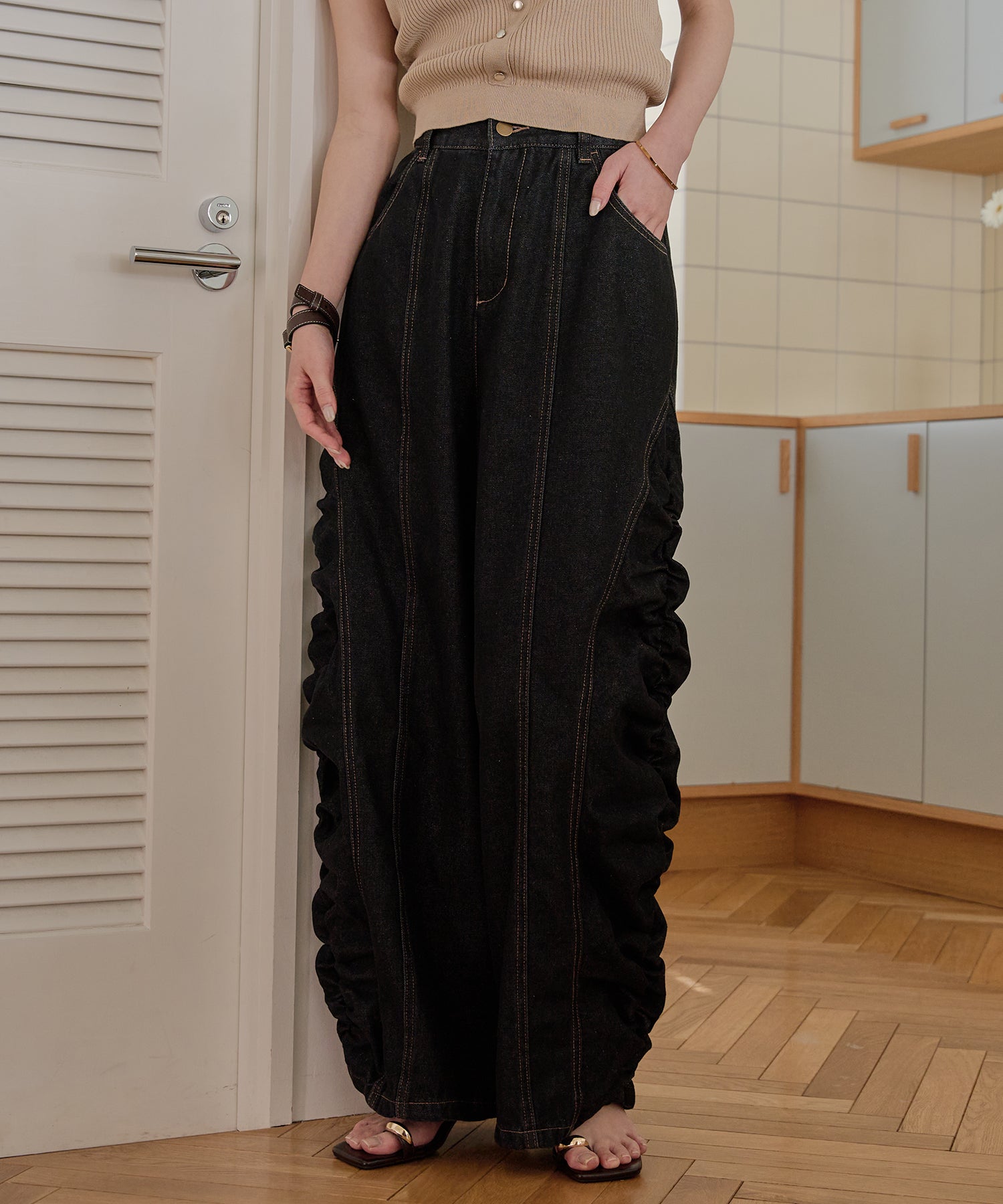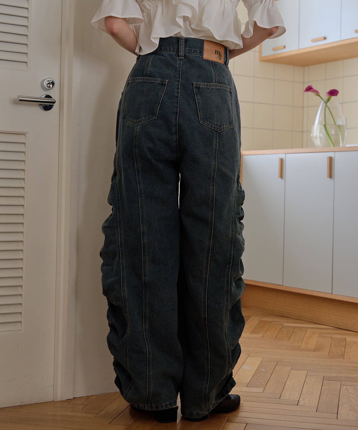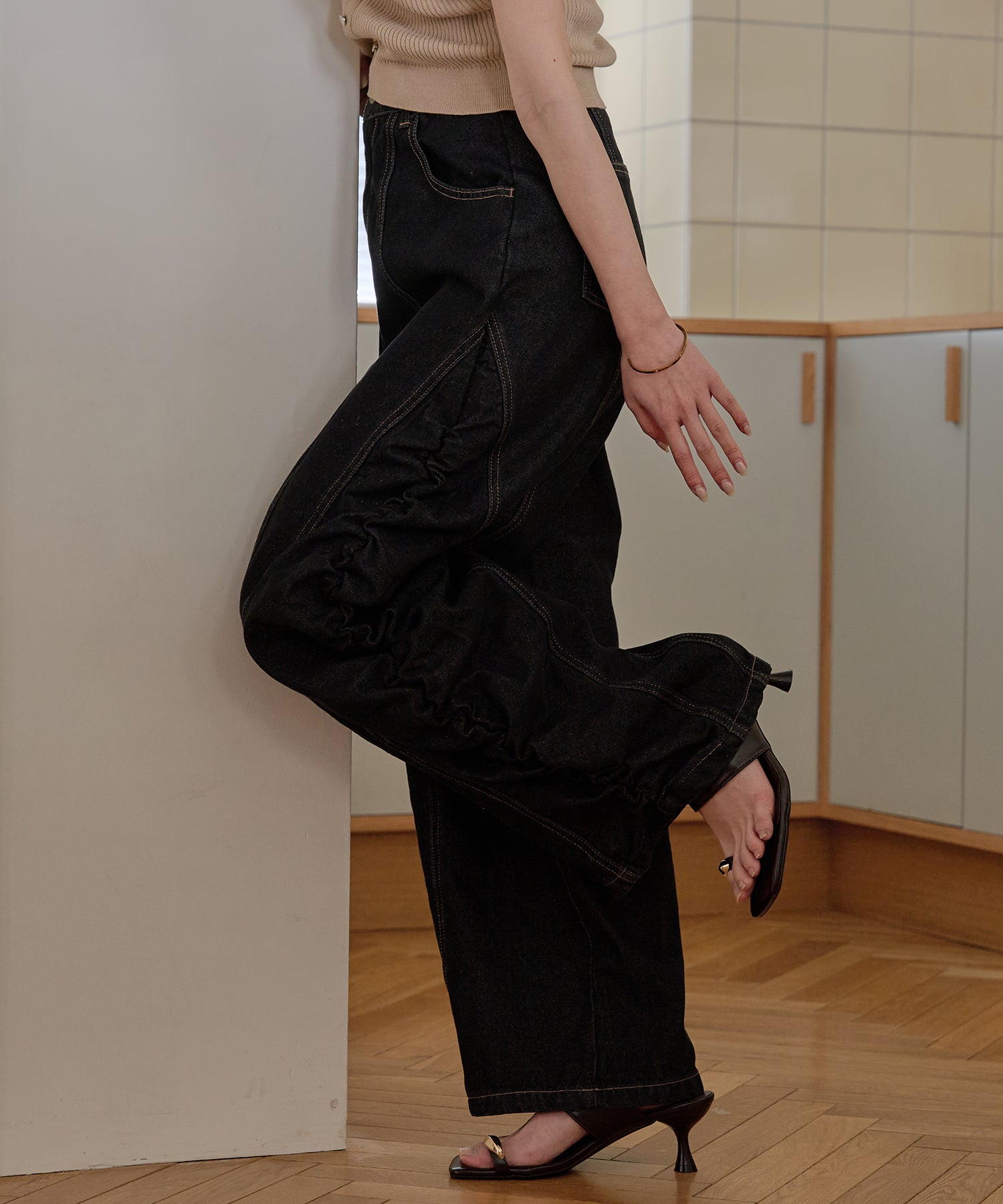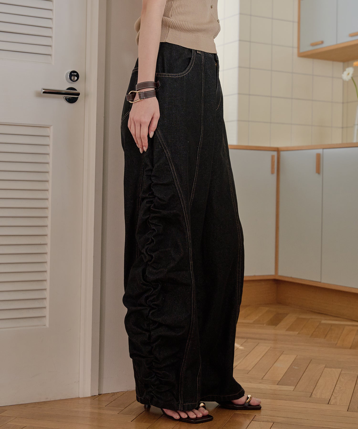 ギャザー×カーブの他にないデニムパンツです。