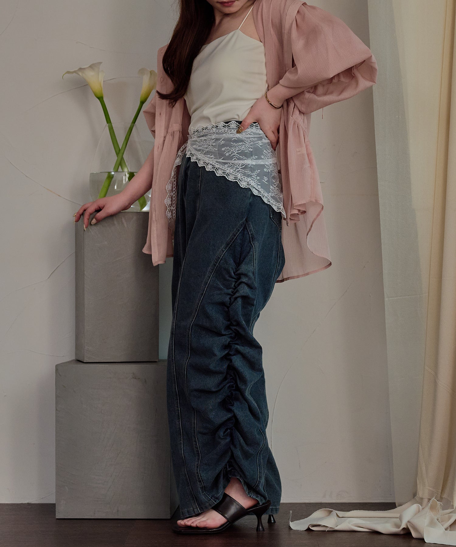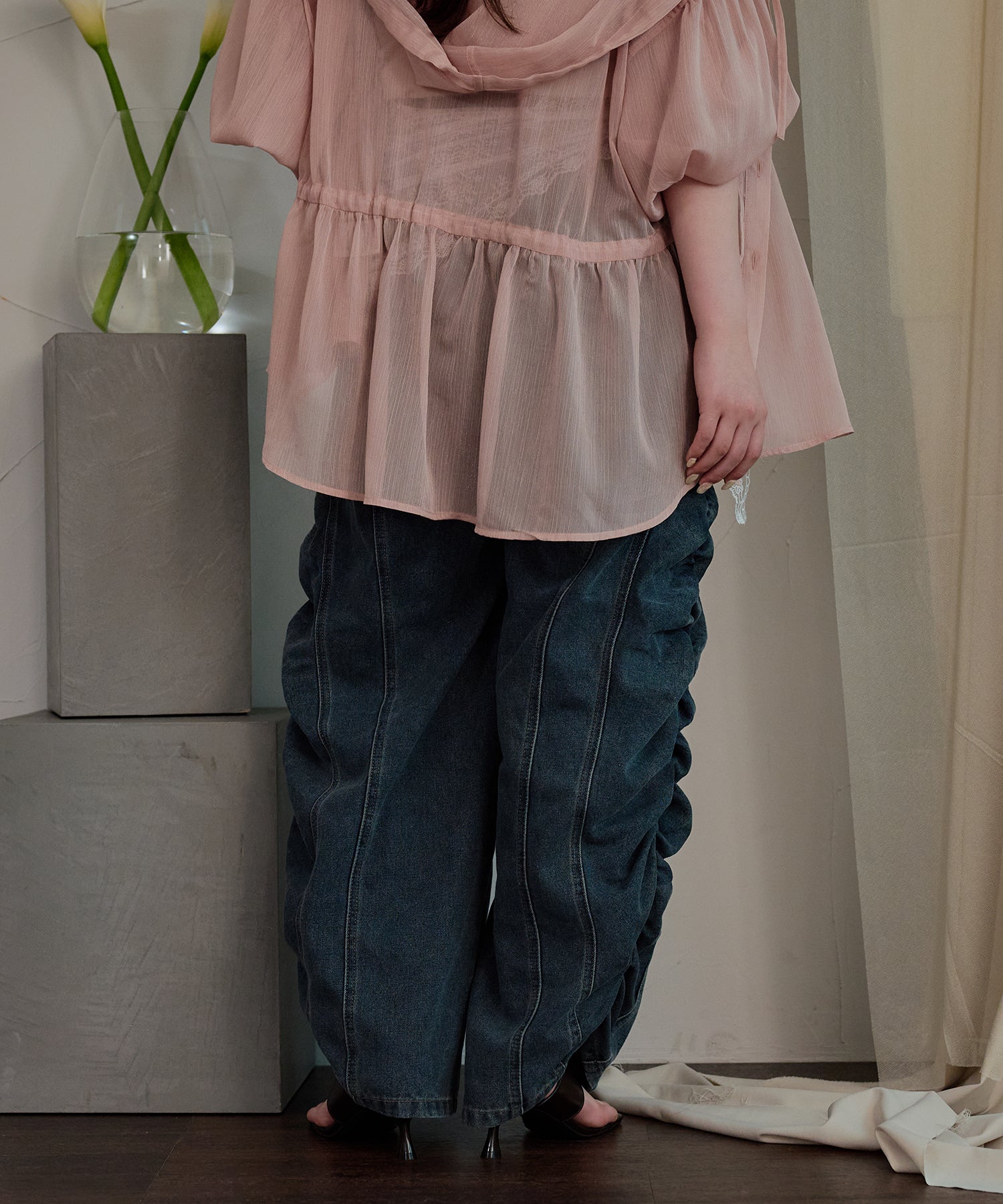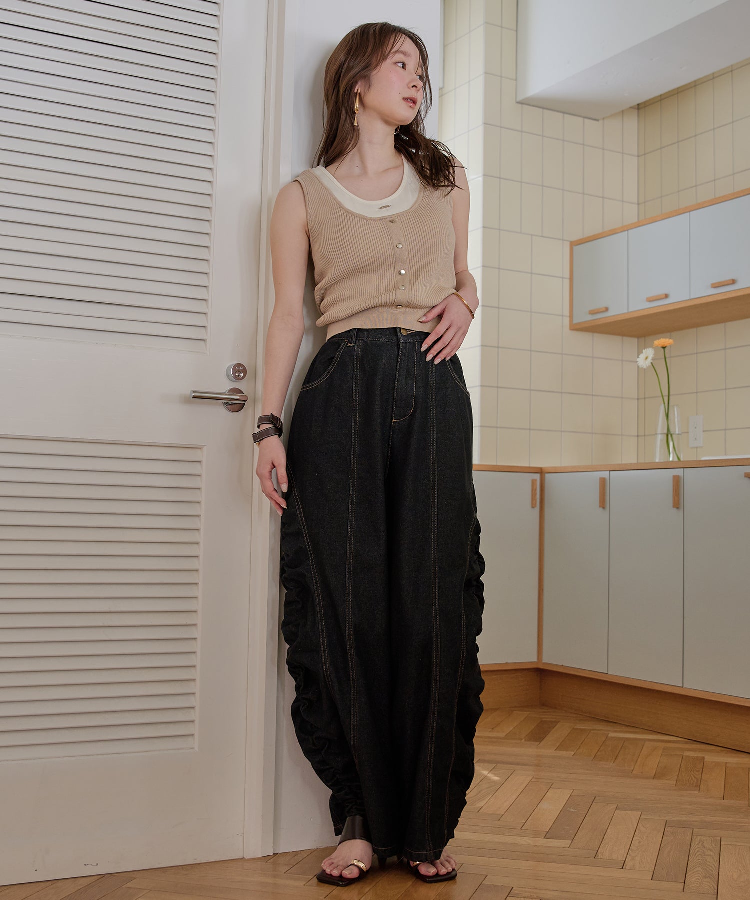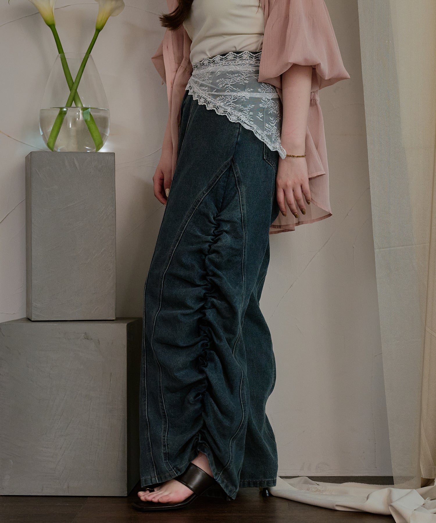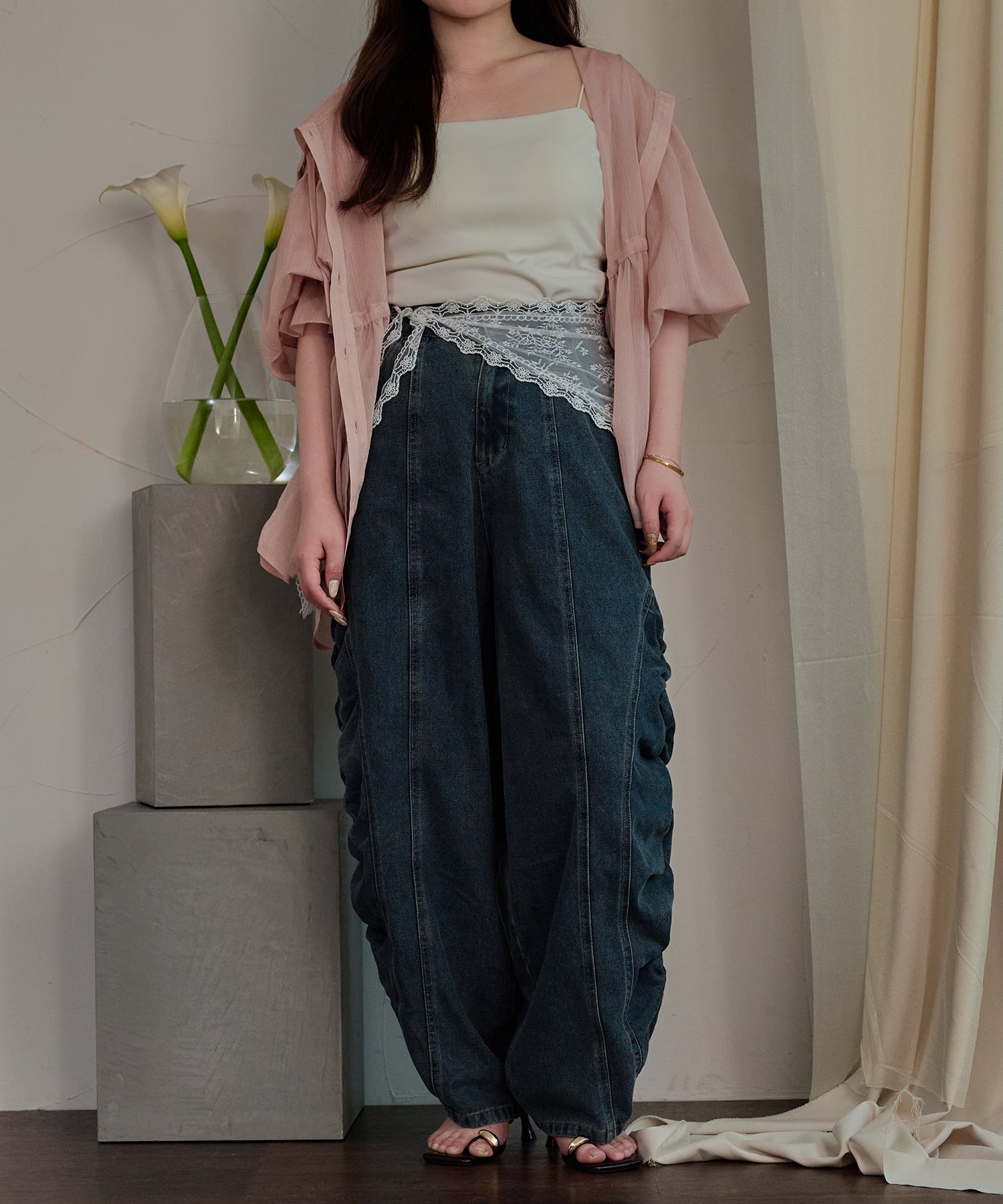 ギャザー×カーブの他にないデニムパンツです。