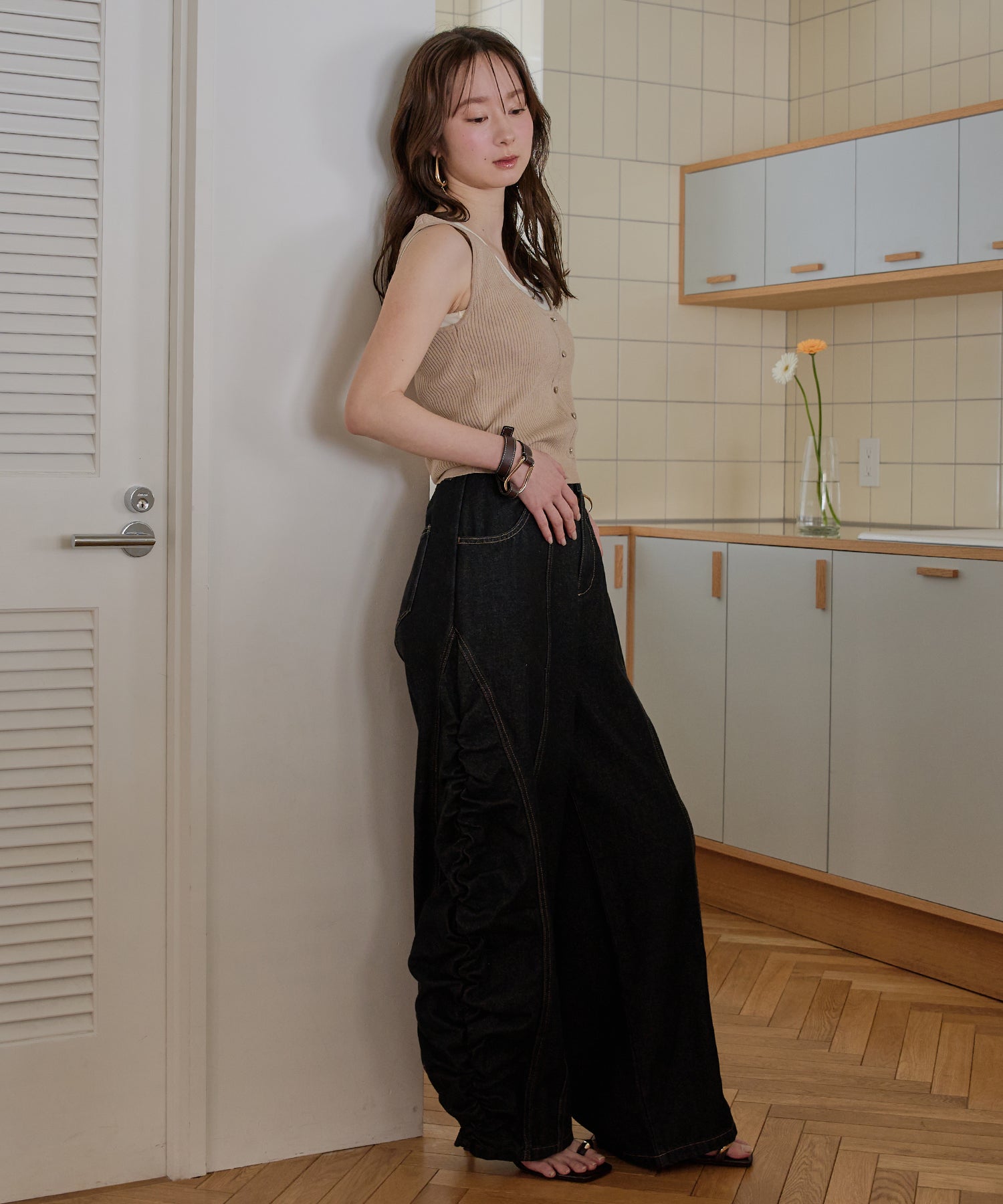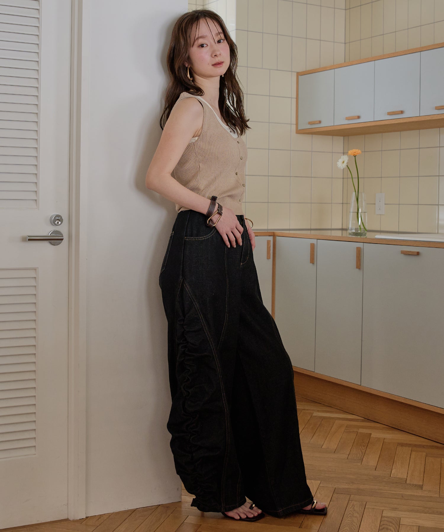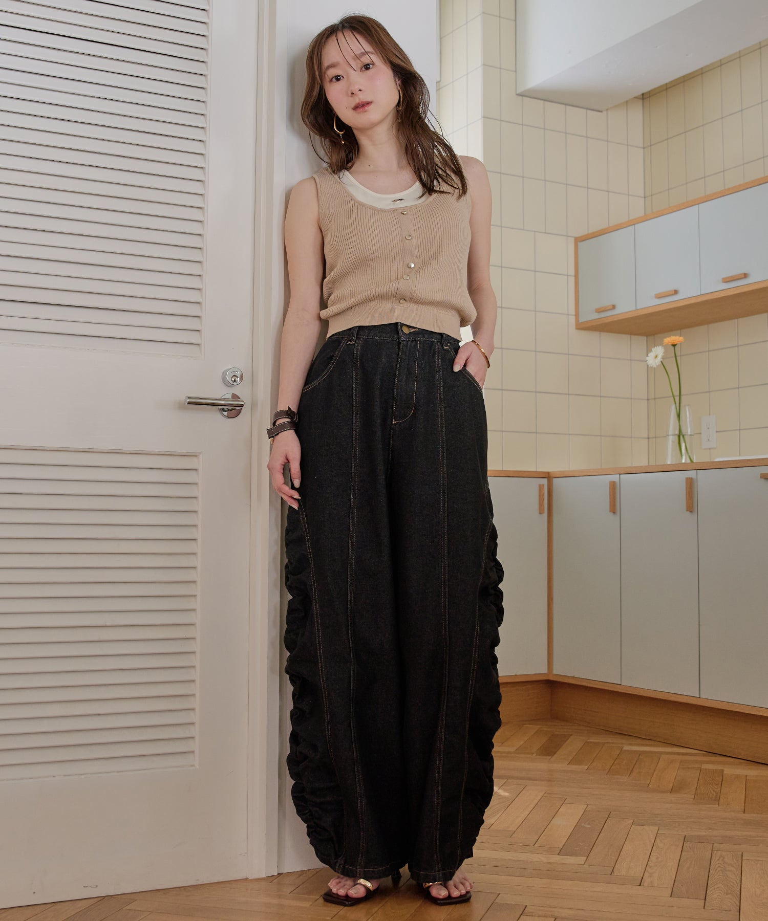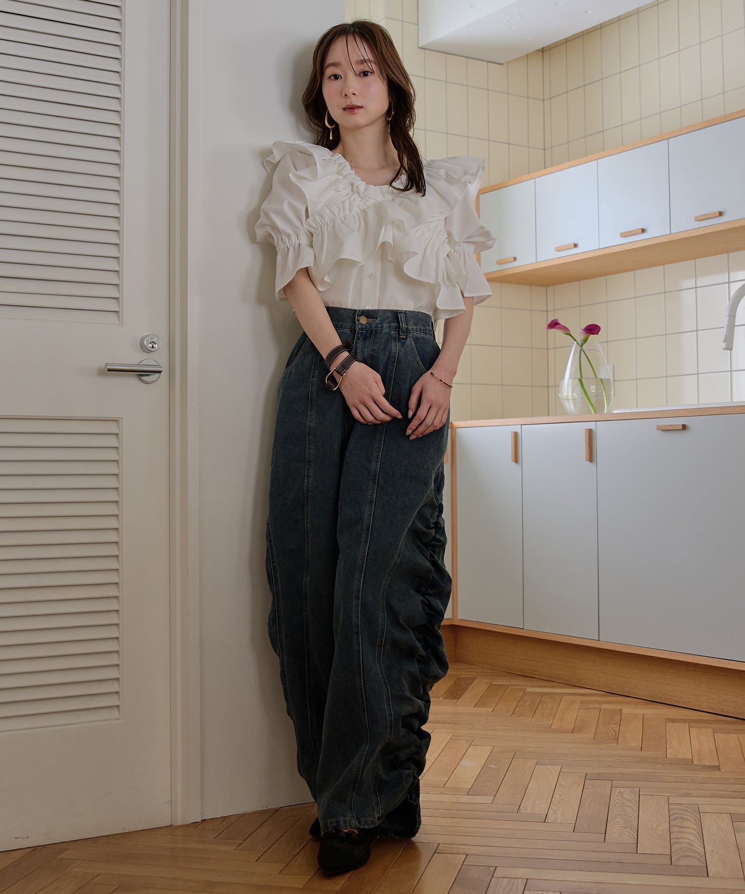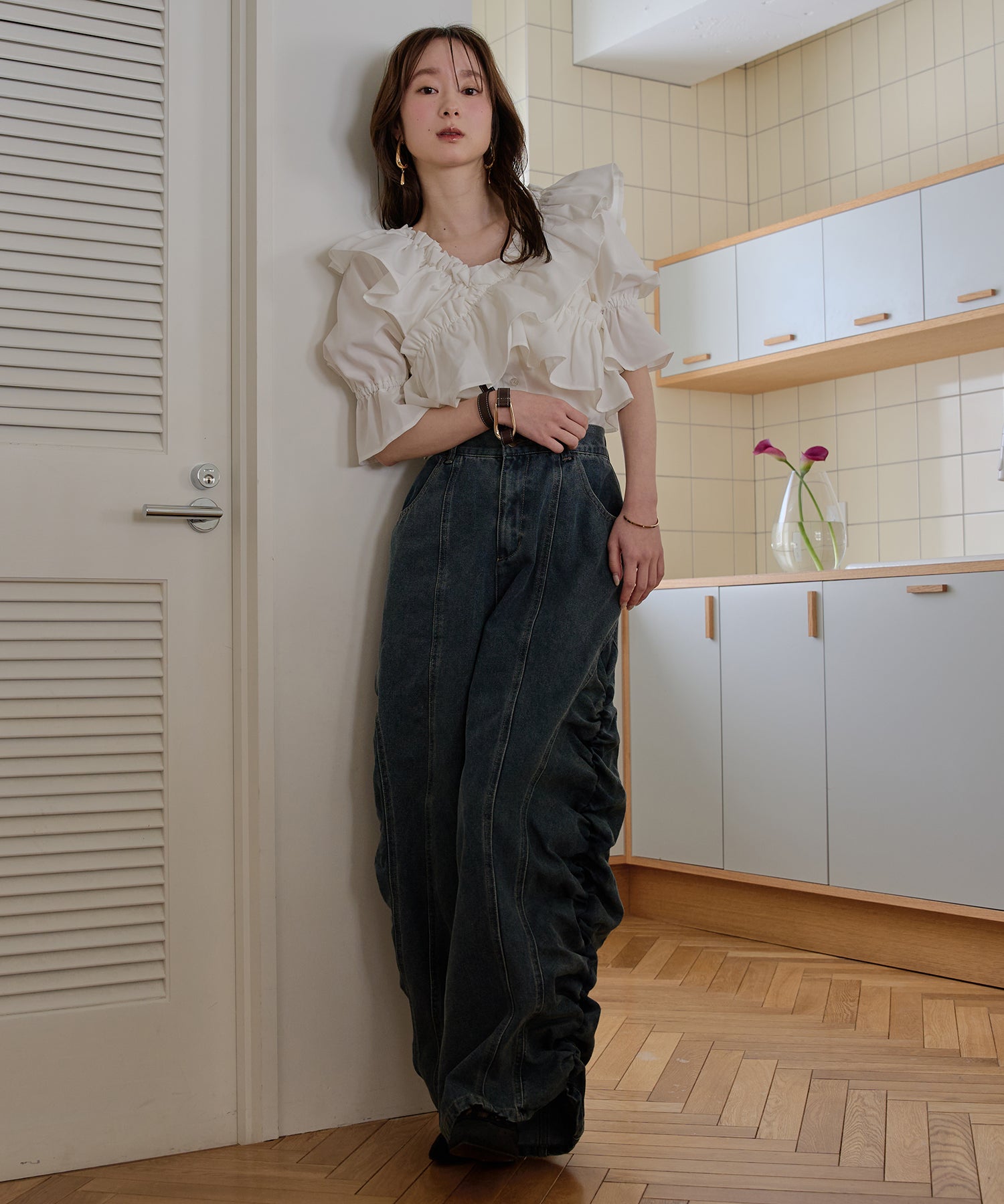 ギャザー×カーブの他にないデニムパンツです。