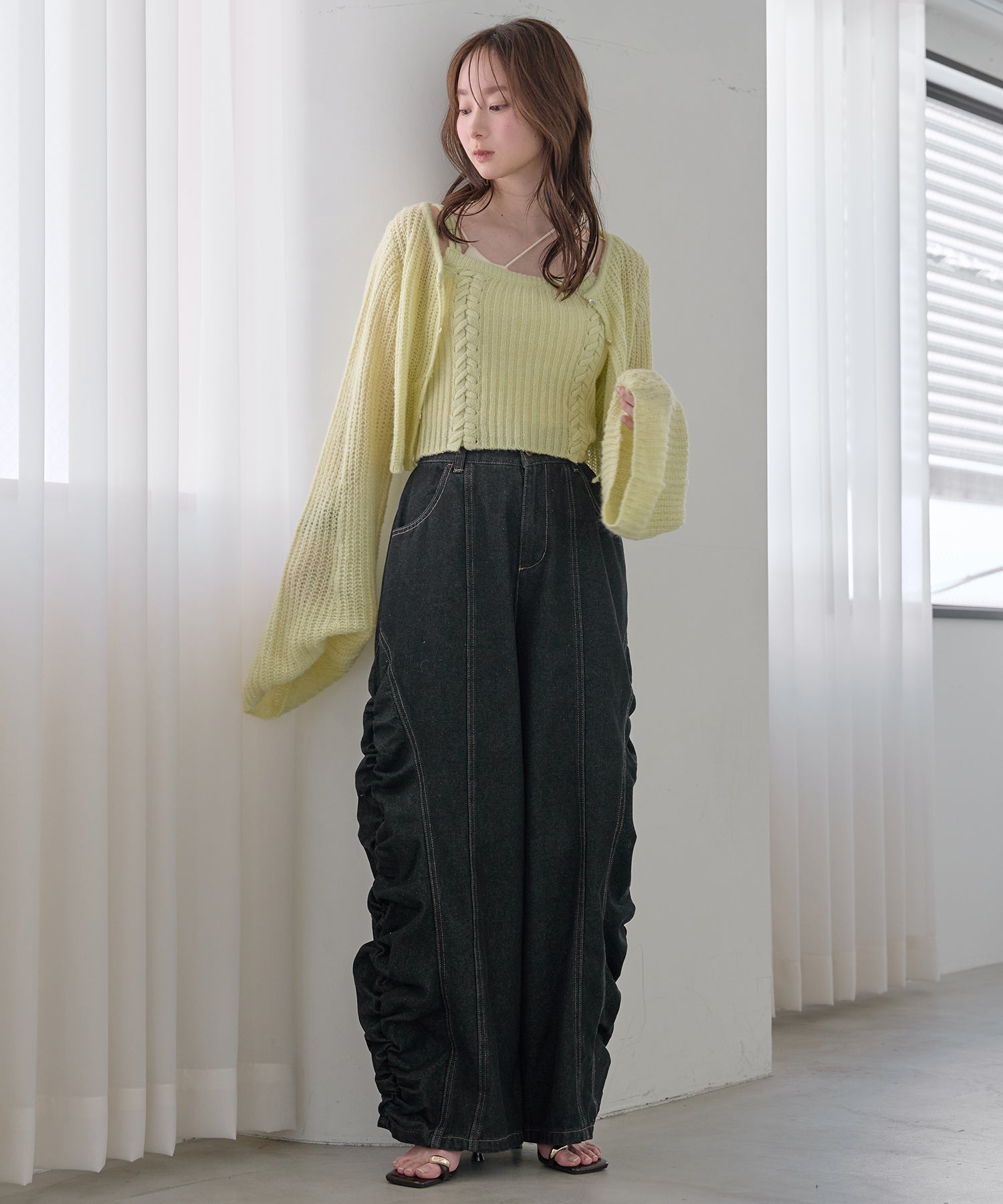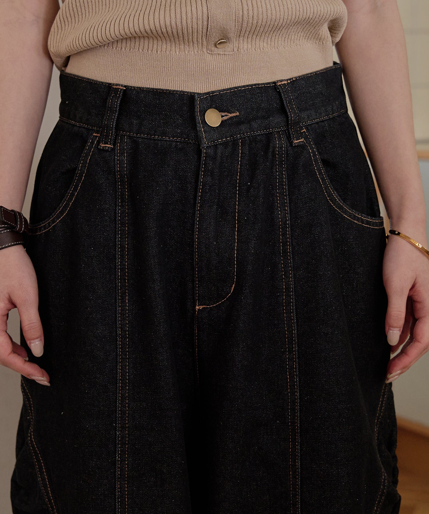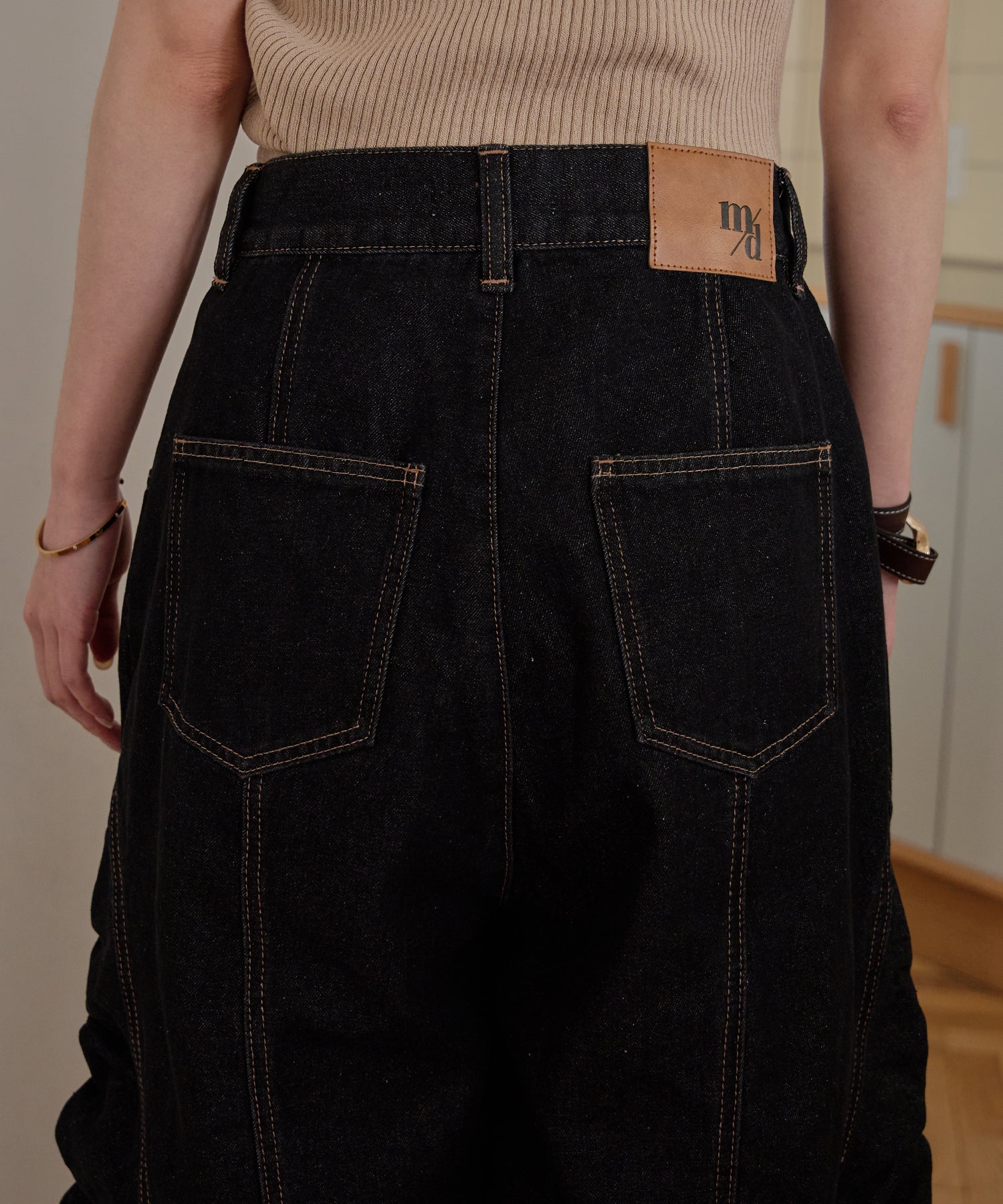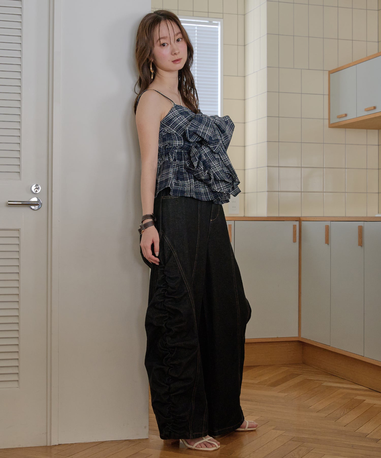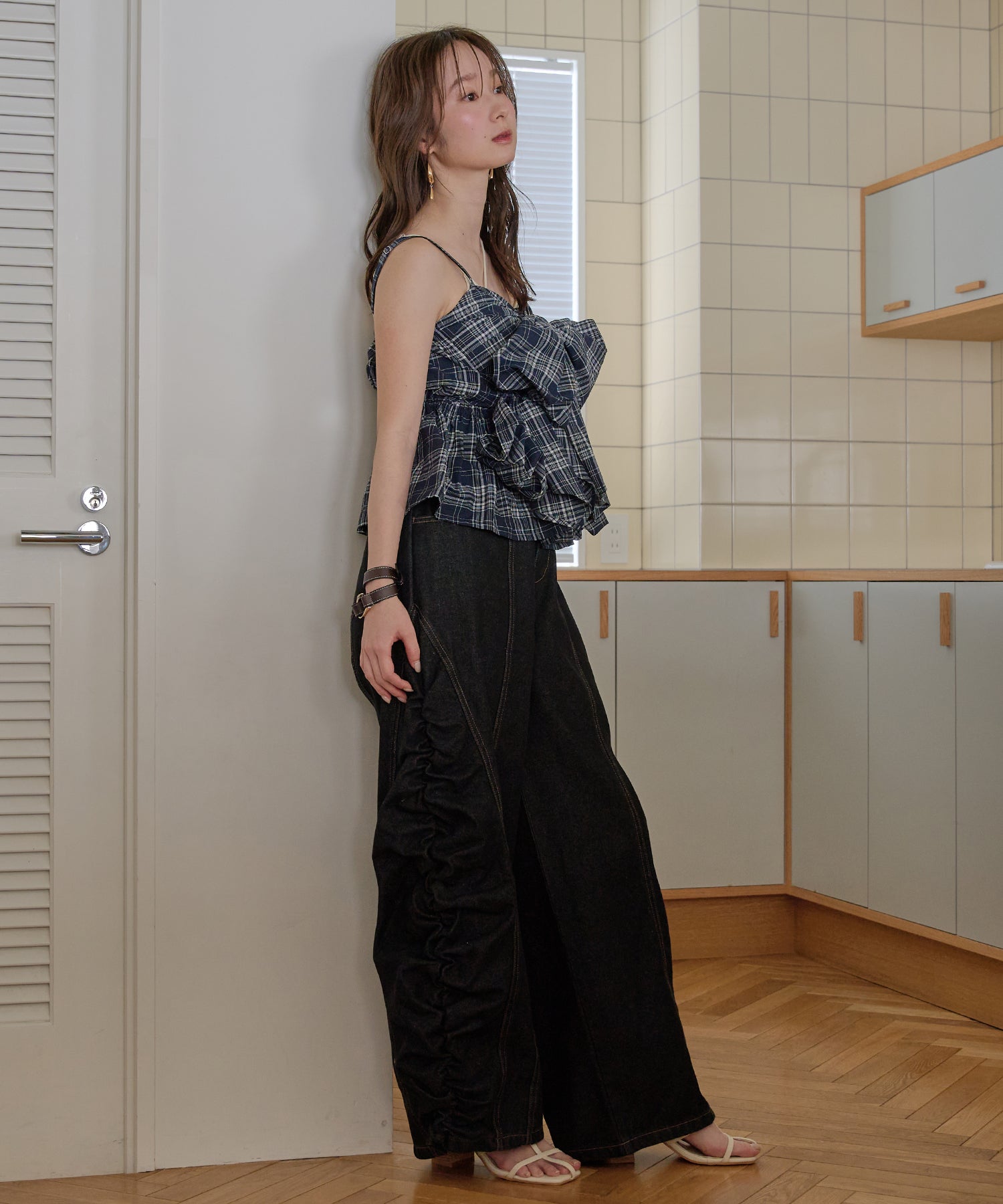 ギャザー×カーブの他にないデニムパンツです。