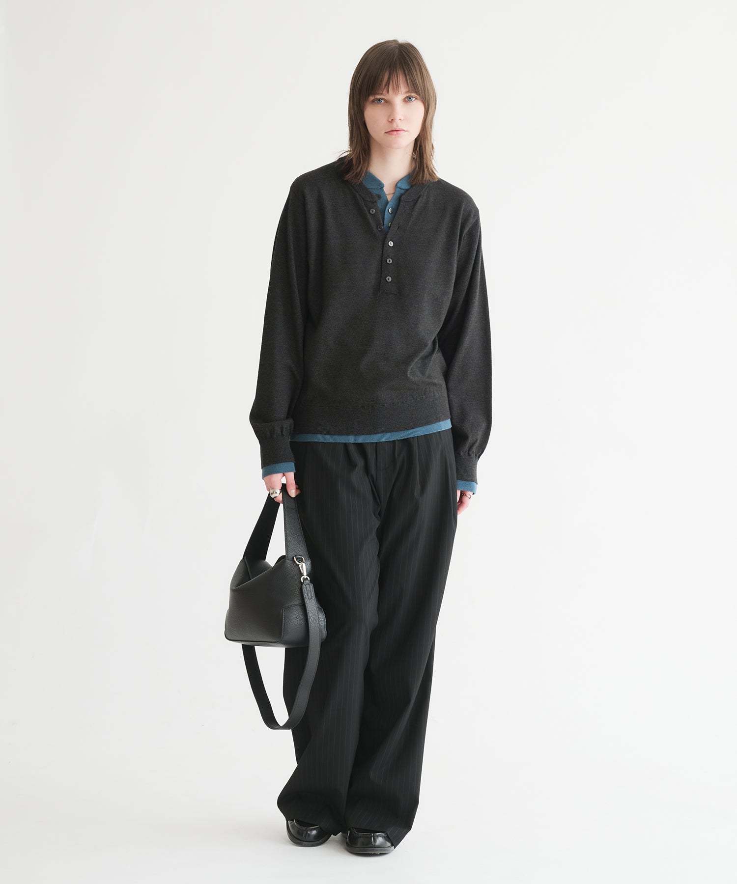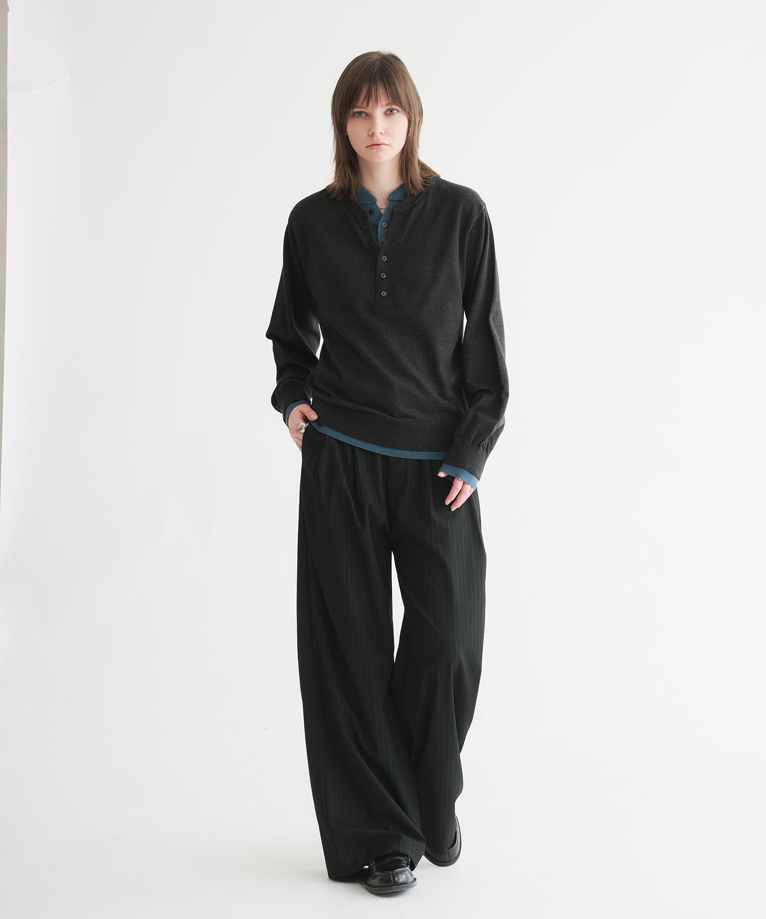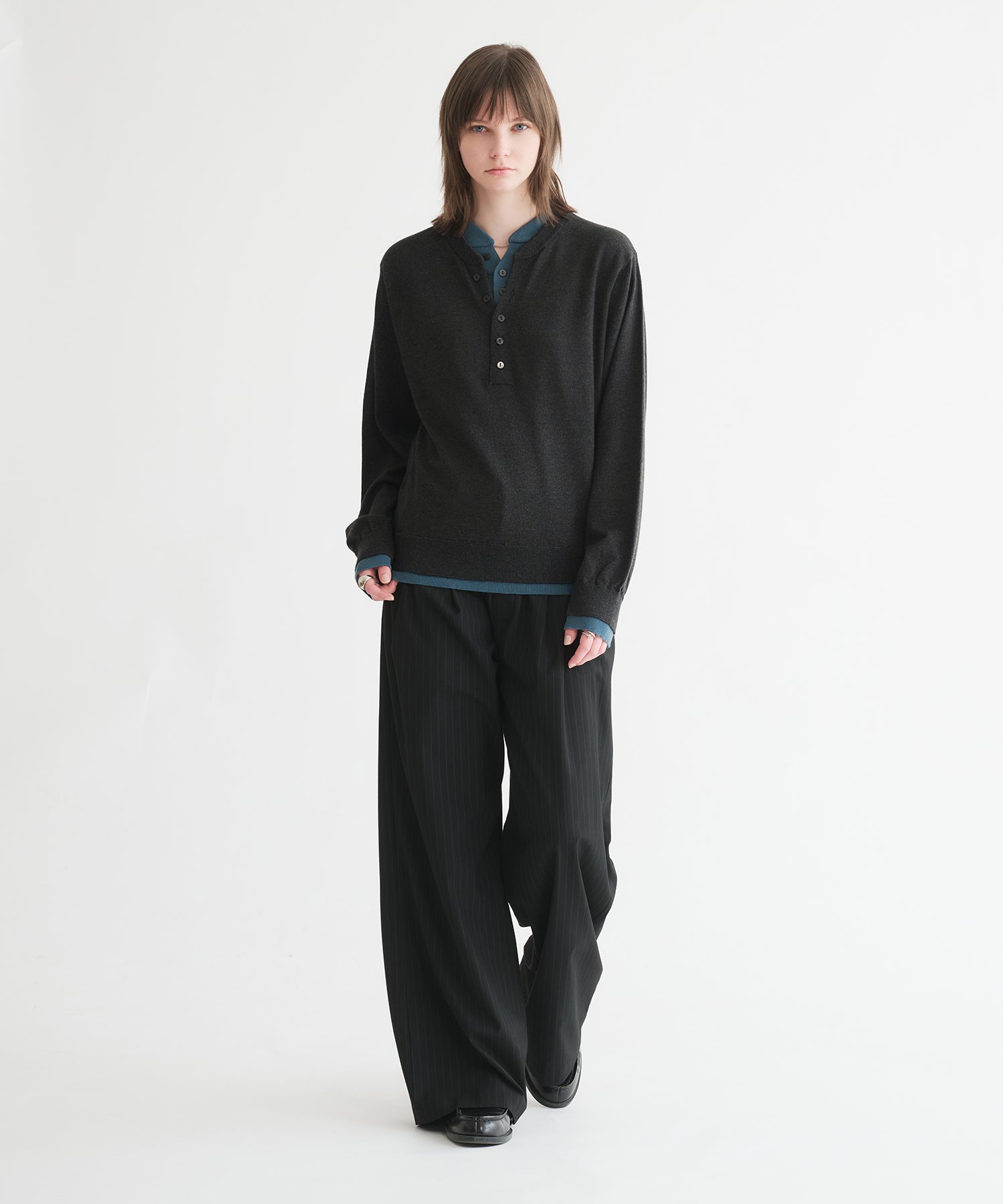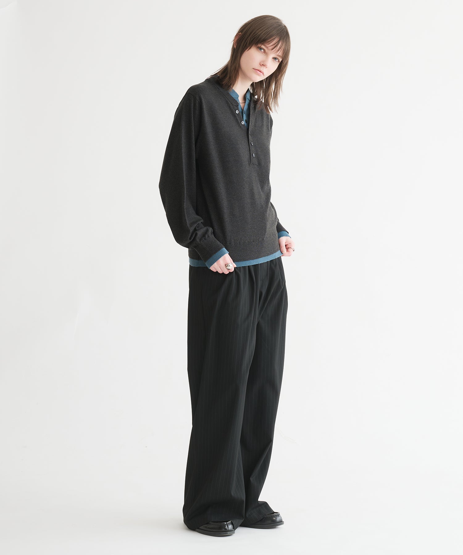 「ヘンリーネックにヘンリーネックを重ねる」という難易度の高いレイヤードを、