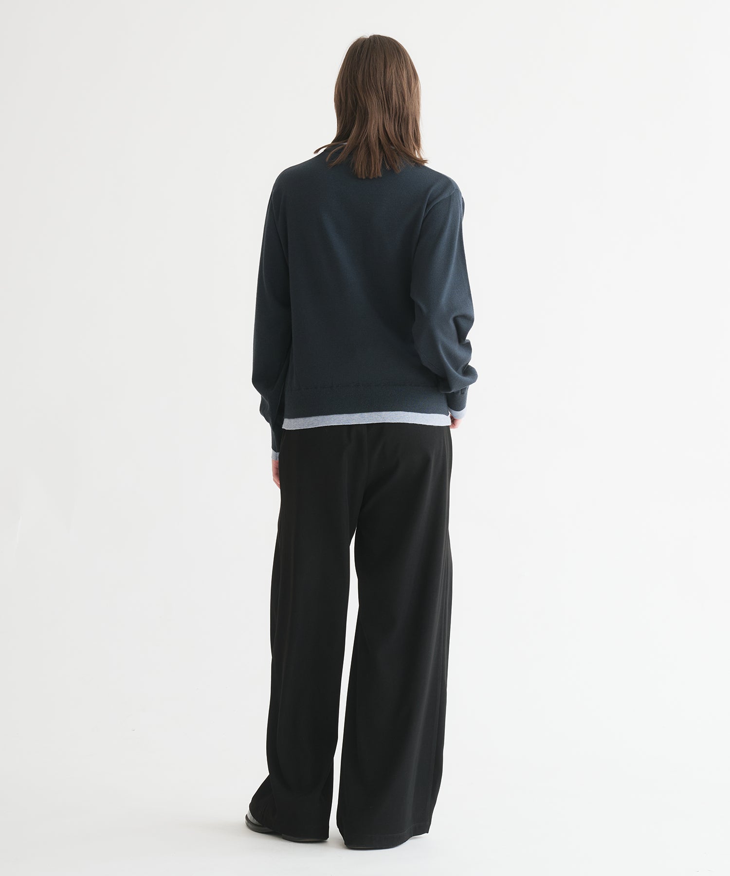 2枚重ねているように見えながらも、1枚のニットとして編み上げることで、