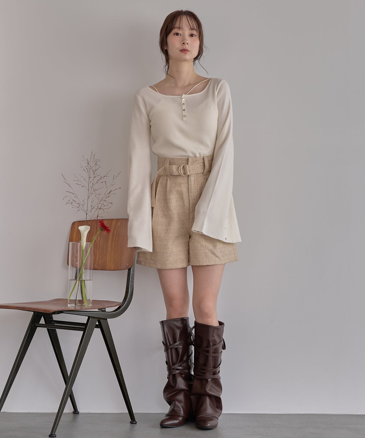 春らしさのあるツイード素材に、タックの入ったシルエットに拘られたパンツ。